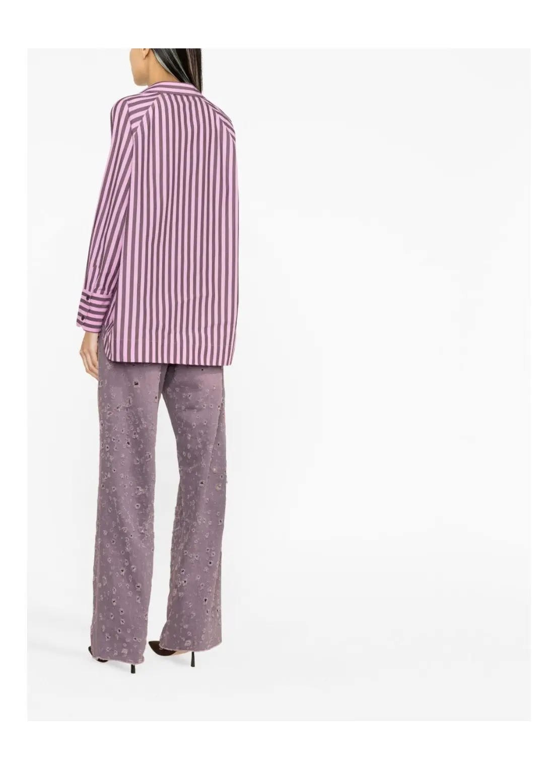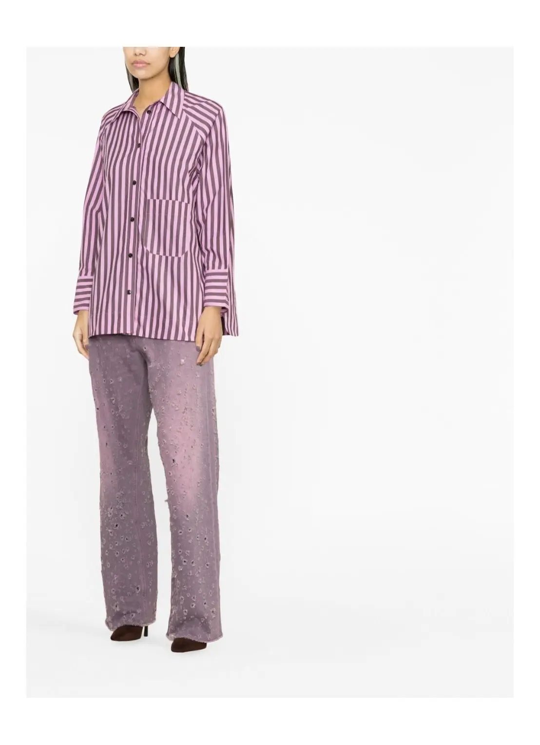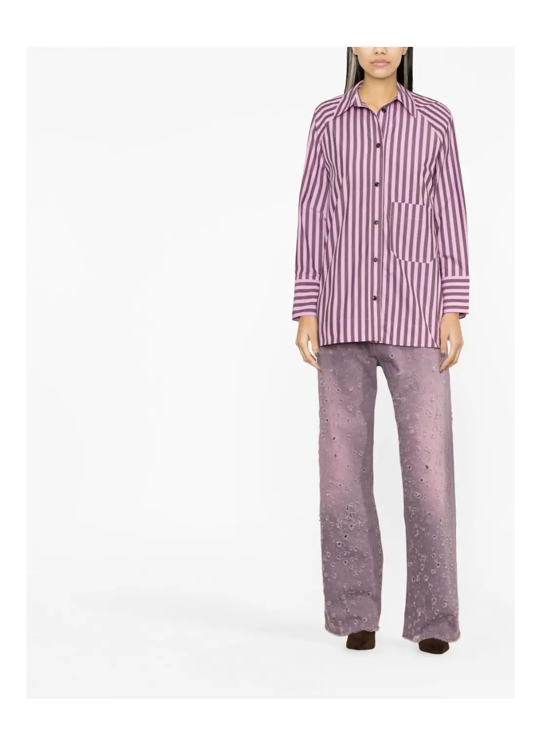 The striped cotton raglan shirt by Ganni is crafted from certified organic cotton. Designed for an oversized fit, the shirt features a collar, raglan sleeves, a button closure as well as buttoned cuffs, a front pocket, and curved side vents.