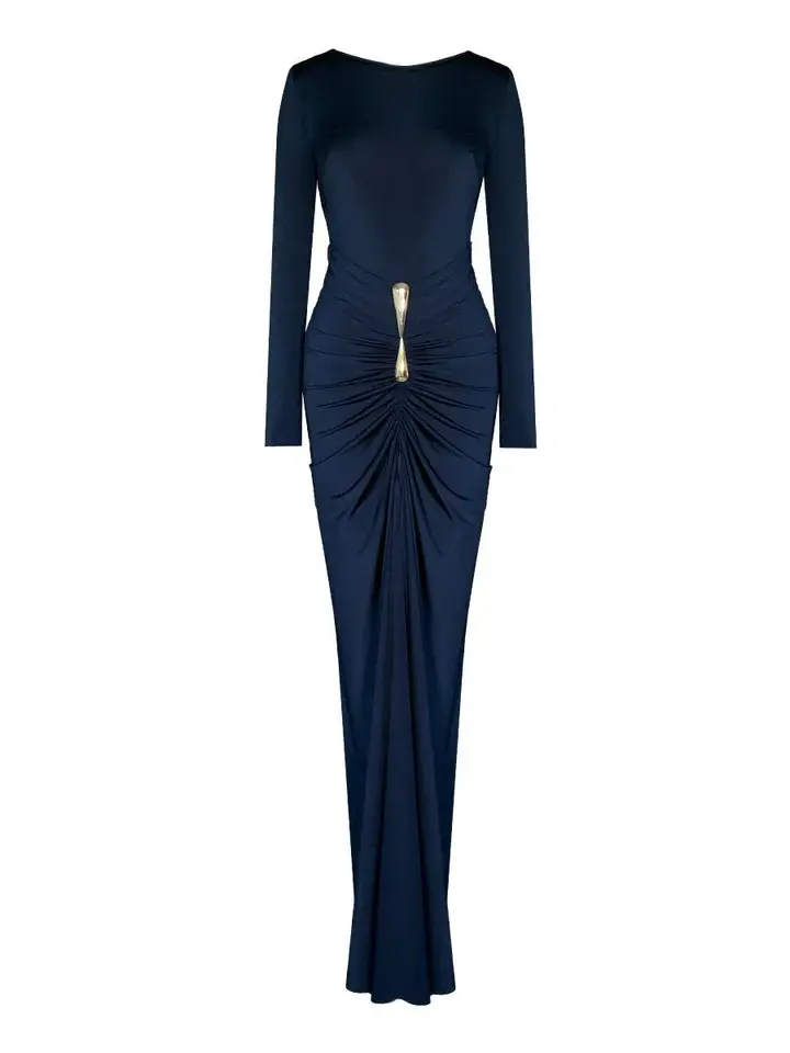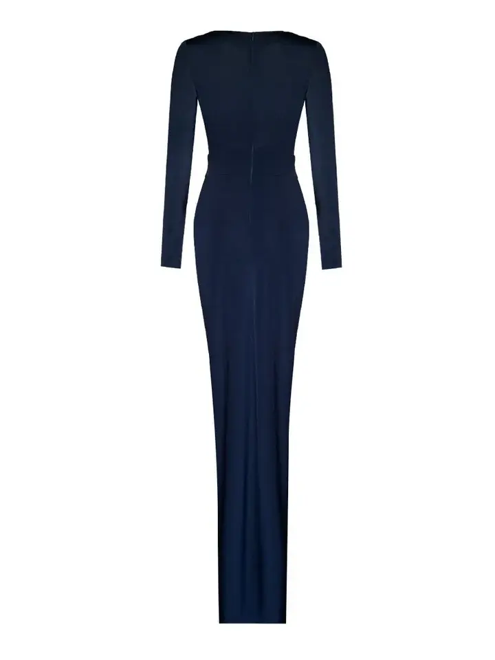 Brenda Dress adds a powerful, sophisticated, and timeless couture elegance to modern evening gowns with its closed neckline and dramatic draped silhouette.