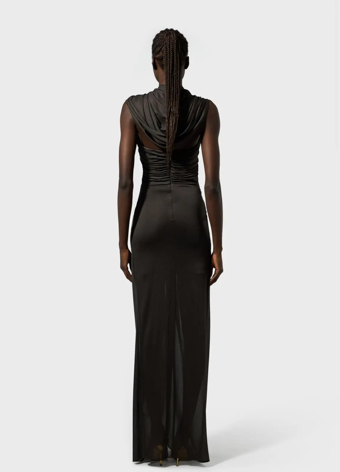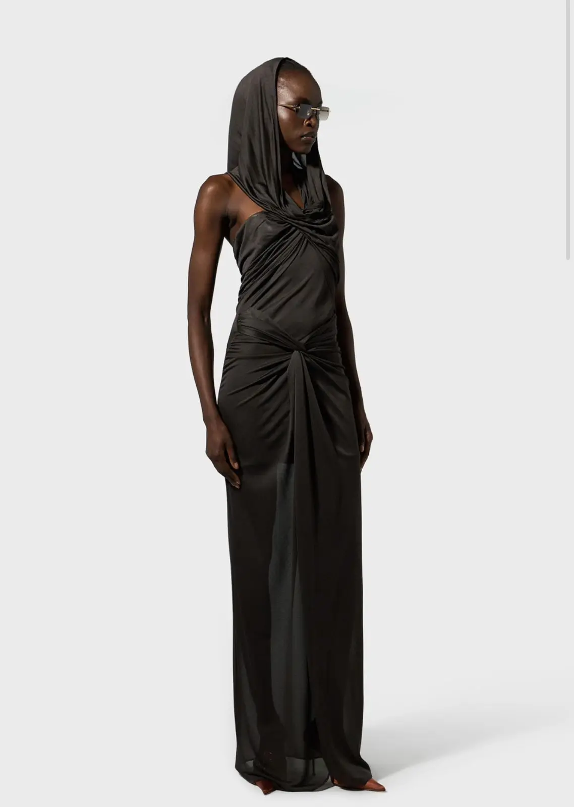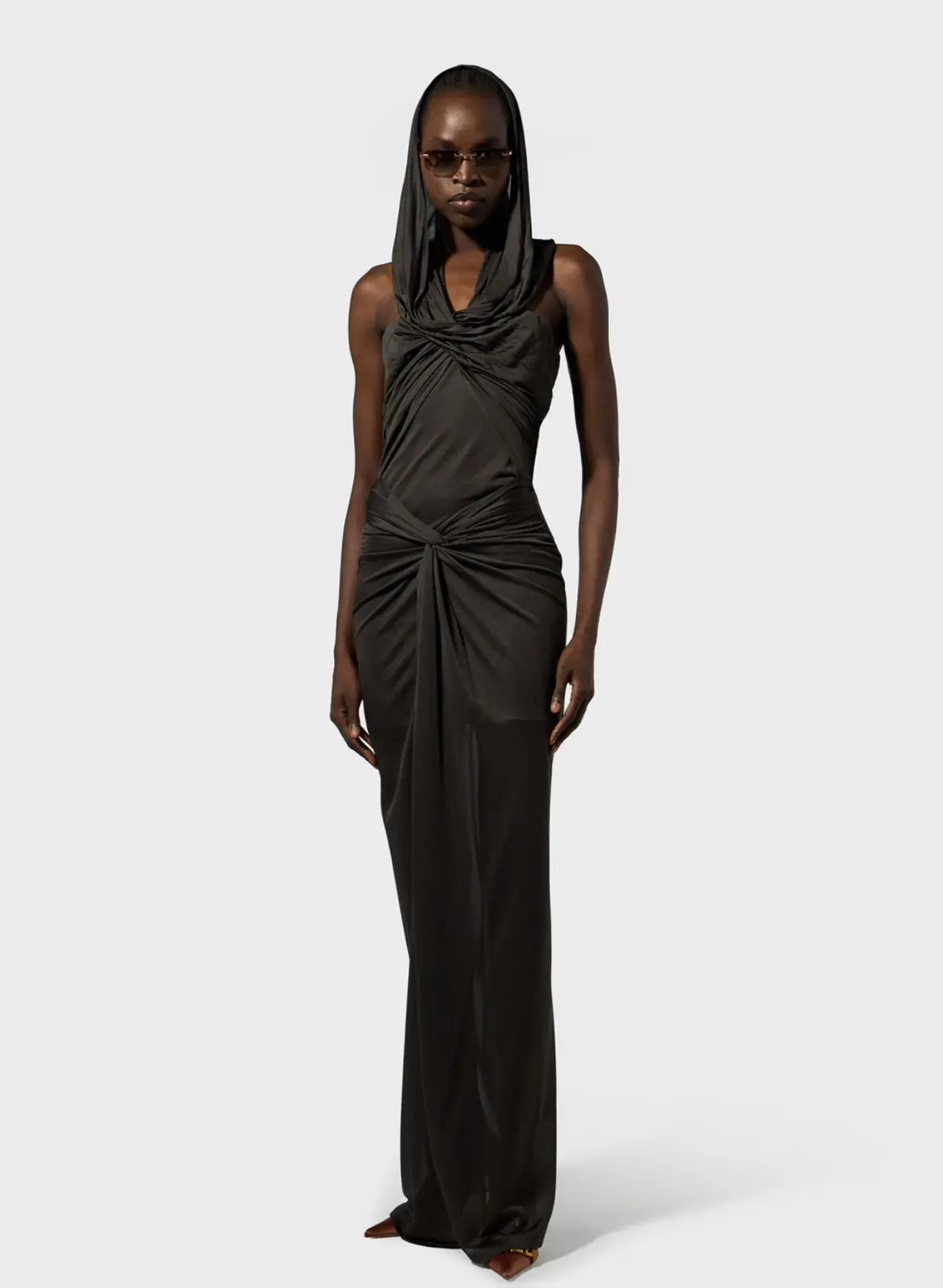 MADE IN ITALY LONG DRESS IN JERSEY Details RUFFLED TOP THAT CONVERGES INTO A HOOD KNOT DETAILING AT FRONT WIDE CENTRAL VENT BACK CONCEALED ZIPPER CLOSURE SLIM FIT MODEL WEARS SIZE 38 AND IS 178 CM TALL COMPOSITION:100%VISCOSE COLOR: BROWN