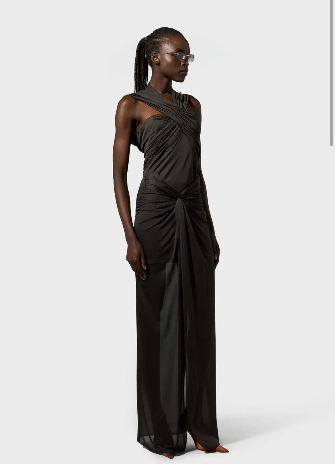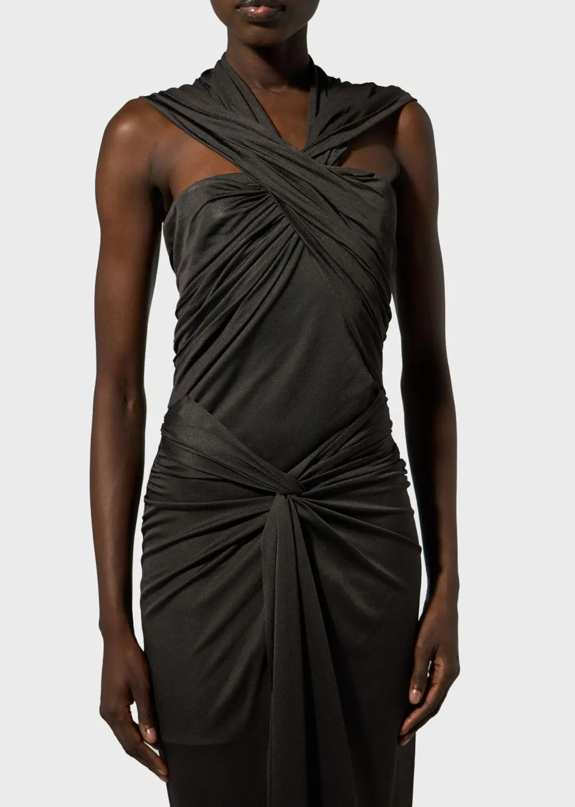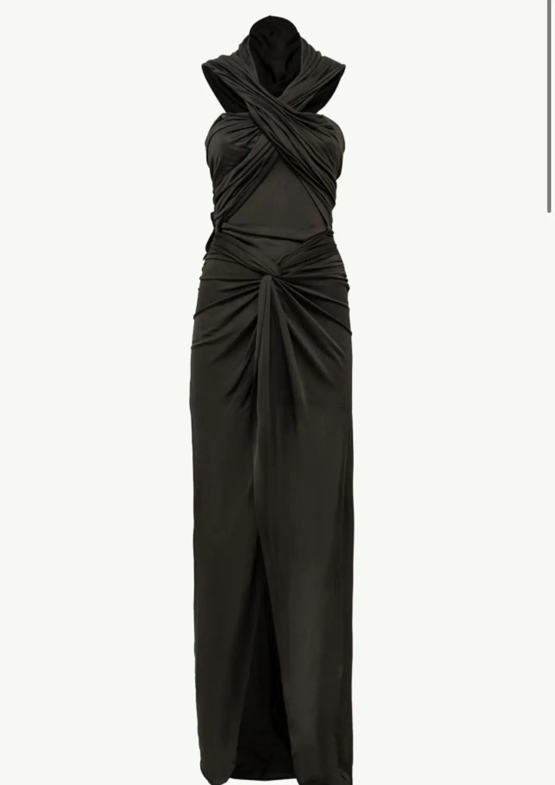 MADE IN ITALY LONG DRESS IN JERSEY Details RUFFLED TOP THAT CONVERGES INTO A HOOD KNOT DETAILING AT FRONT WIDE CENTRAL VENT BACK CONCEALED ZIPPER CLOSURE SLIM FIT MODEL WEARS SIZE 38 AND IS 178 CM TALL COMPOSITION:100%VISCOSE COLOR: BROWN
