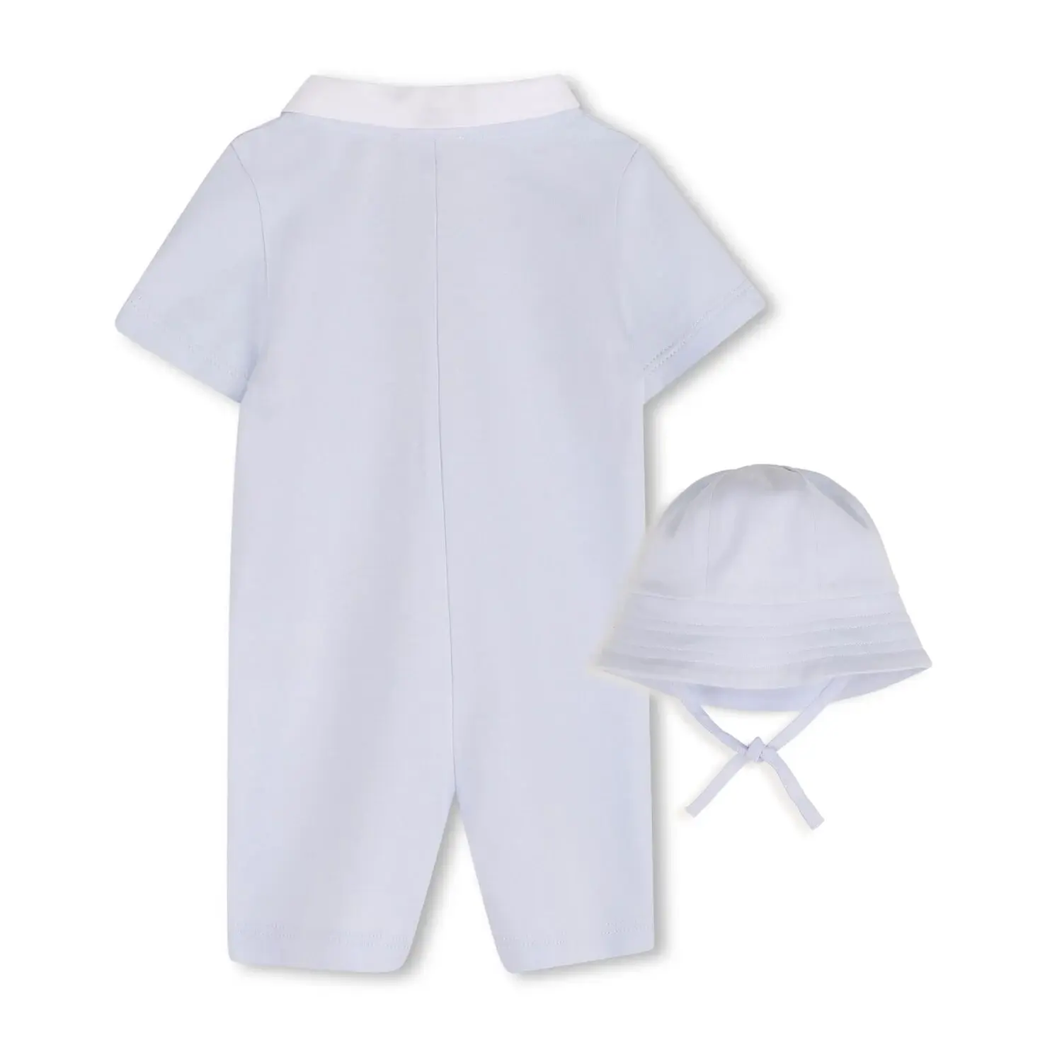 Blue romper set for baby boys by luxury brand Givenchy. Made from soft cotton jersey, this set consists of romper, it has chest pocket and white collar. Fasten with buttons on the front and between legs for easy dressing. Matching hat with tie fastening under the chin. Both have the brands logo embroidered.