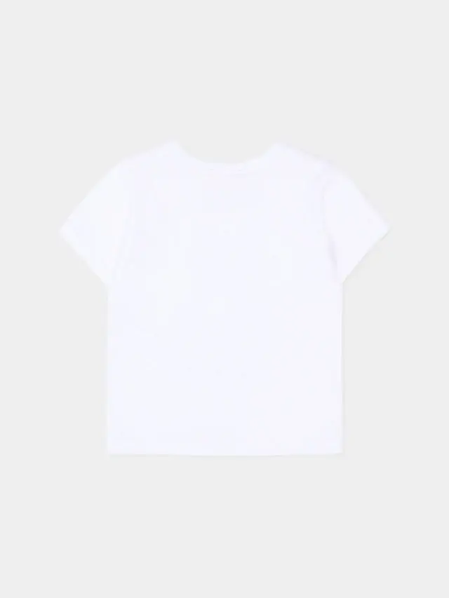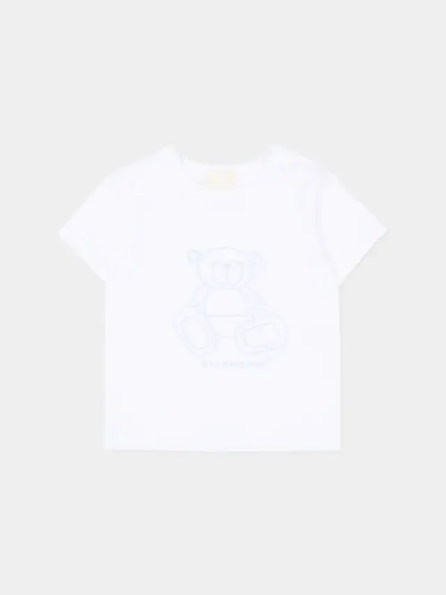 Sporty outfit in soft cotton from Givenchy Kids consisting of a bomber jacket, T-shirt, and coordinated pants in a light blue shade. Bomber jacket with a ribbed collar, front closure with snap buttons, and applied pockets that recall the oversized cargo pockets of the pants. Pants with an elasticated waist and gathered leg openings that ensure a neat and tidy silhouette. White jersey T-shirt with buttons on the shoulder and teddy bear print with tone-on-tone GIVENCHY Paris logo that adds a delicate graphic touch to the ensemble.