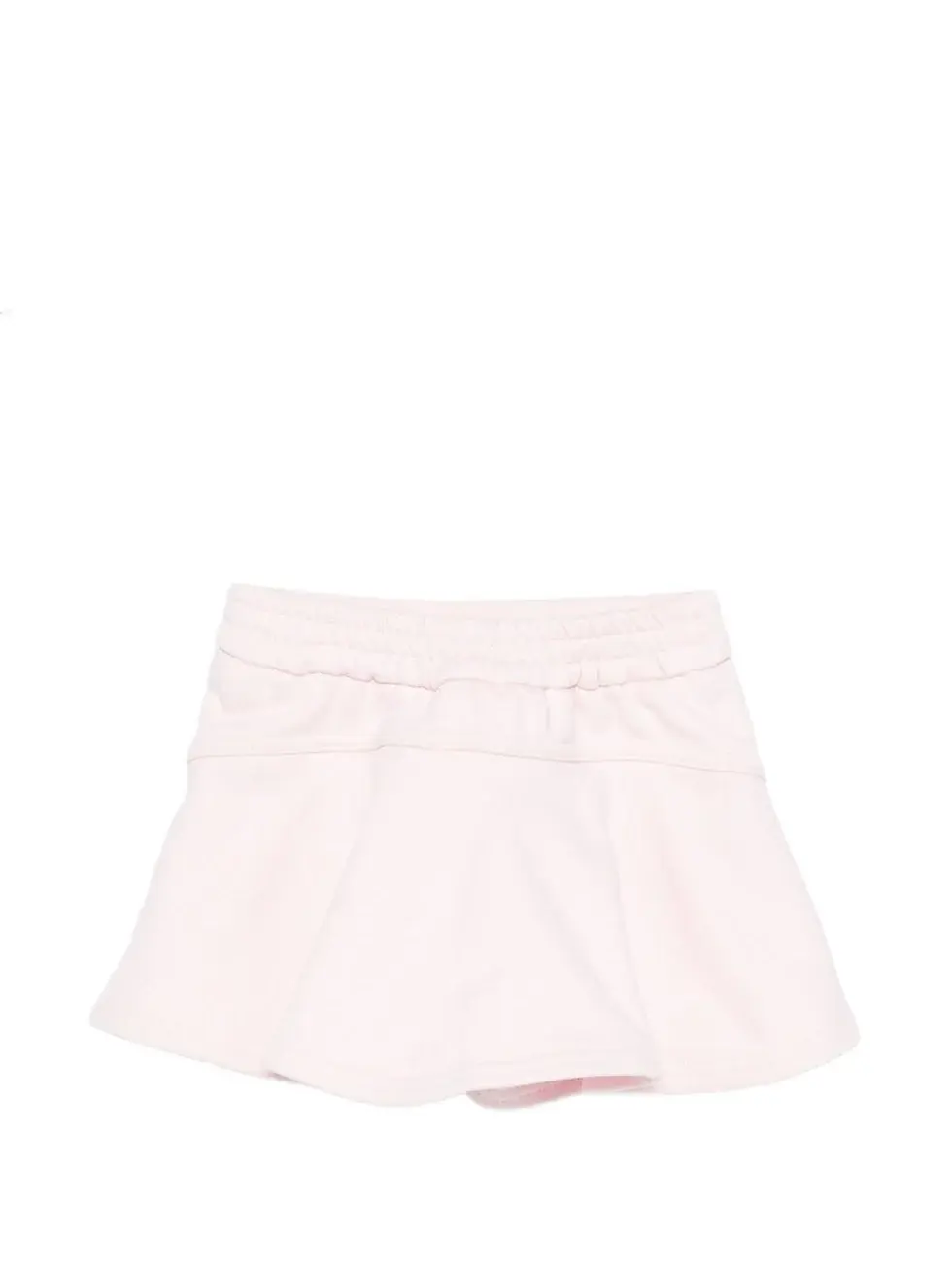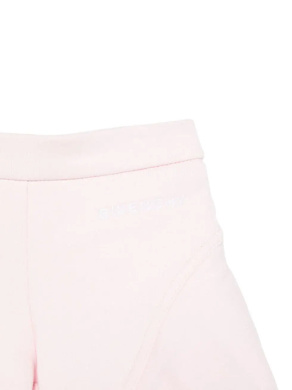 The Givenchy Kids pink elastic waist shorts for baby girls. Made of 100% cotton, they feature a pink color, an elastic waistband, a logo on the front, and tone-on-tone stitching