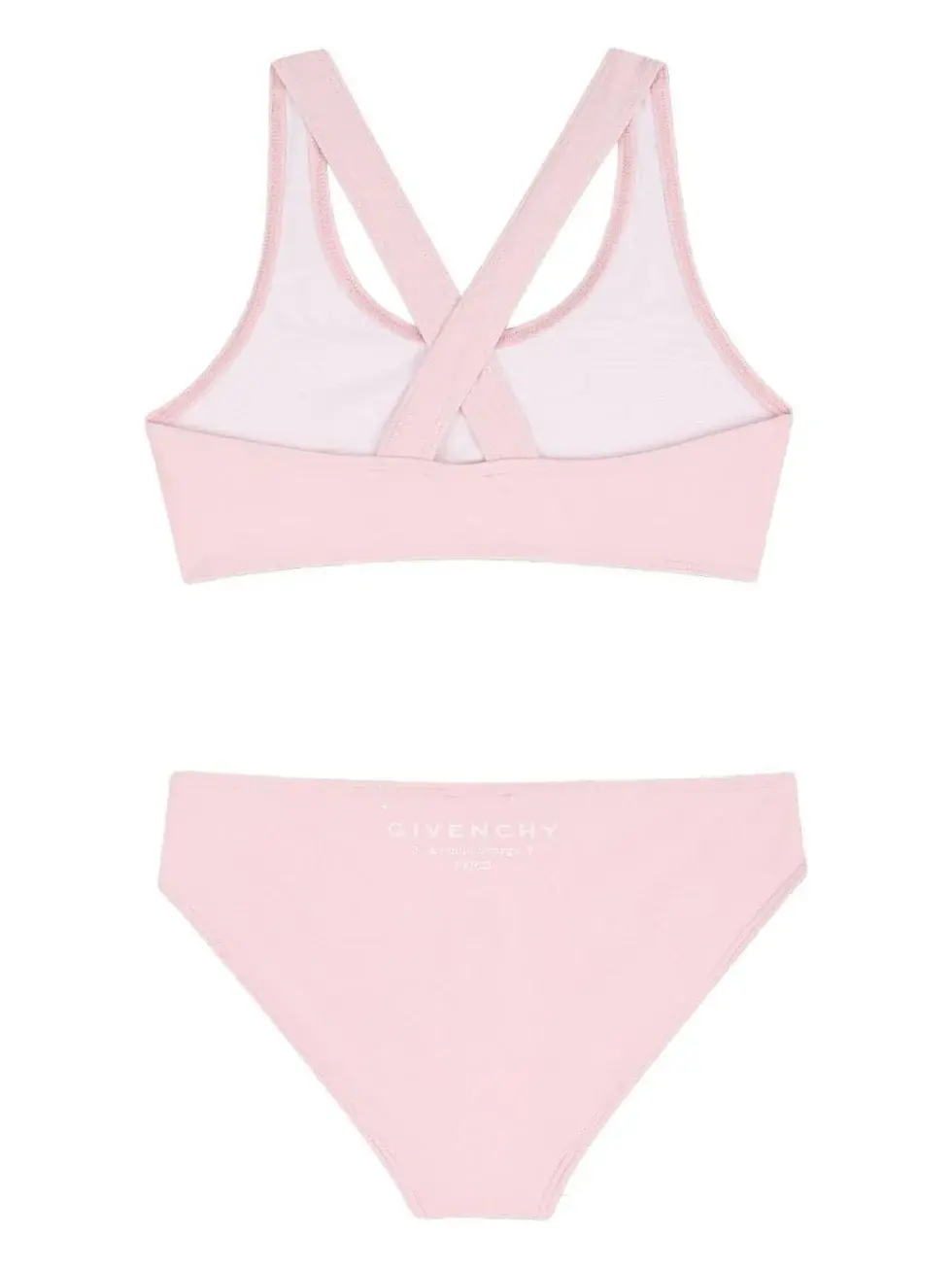 The Givenchy Kids pink bikini for girls with logo print . Made of 100% fabric, it features pink crisscross straps and tone-on-tone stitching