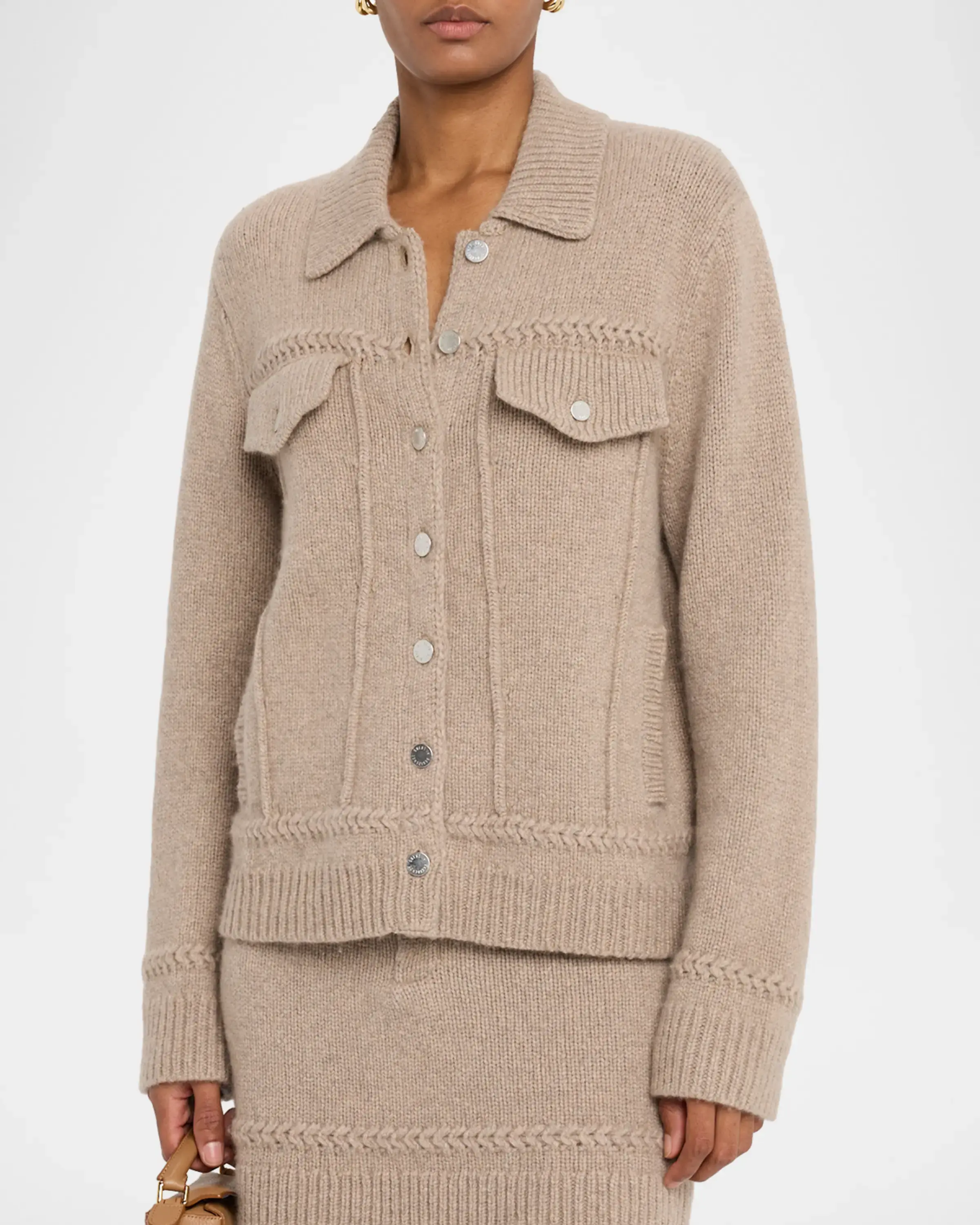 Blending the structured of outerwear with the softness of knitwear, the "Jean" sweater by Guest in Residence is knit from a heavyweight blend of cashmere and wool and decorated with braided trim in a classic trucker jacket-inspired silhouette