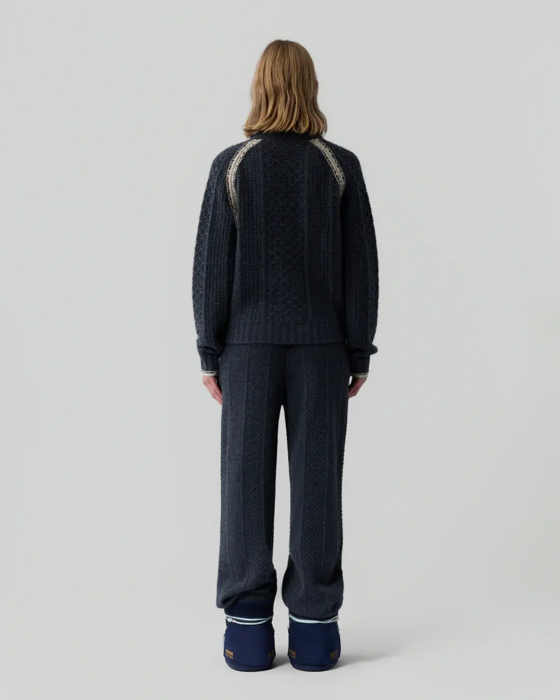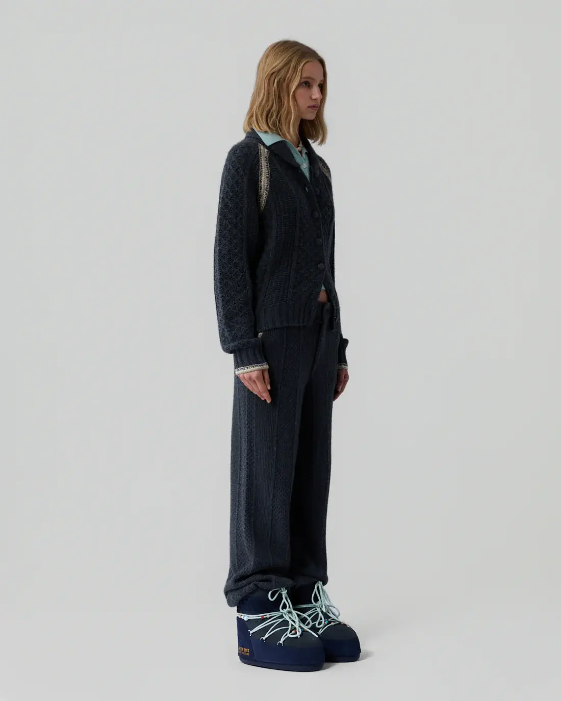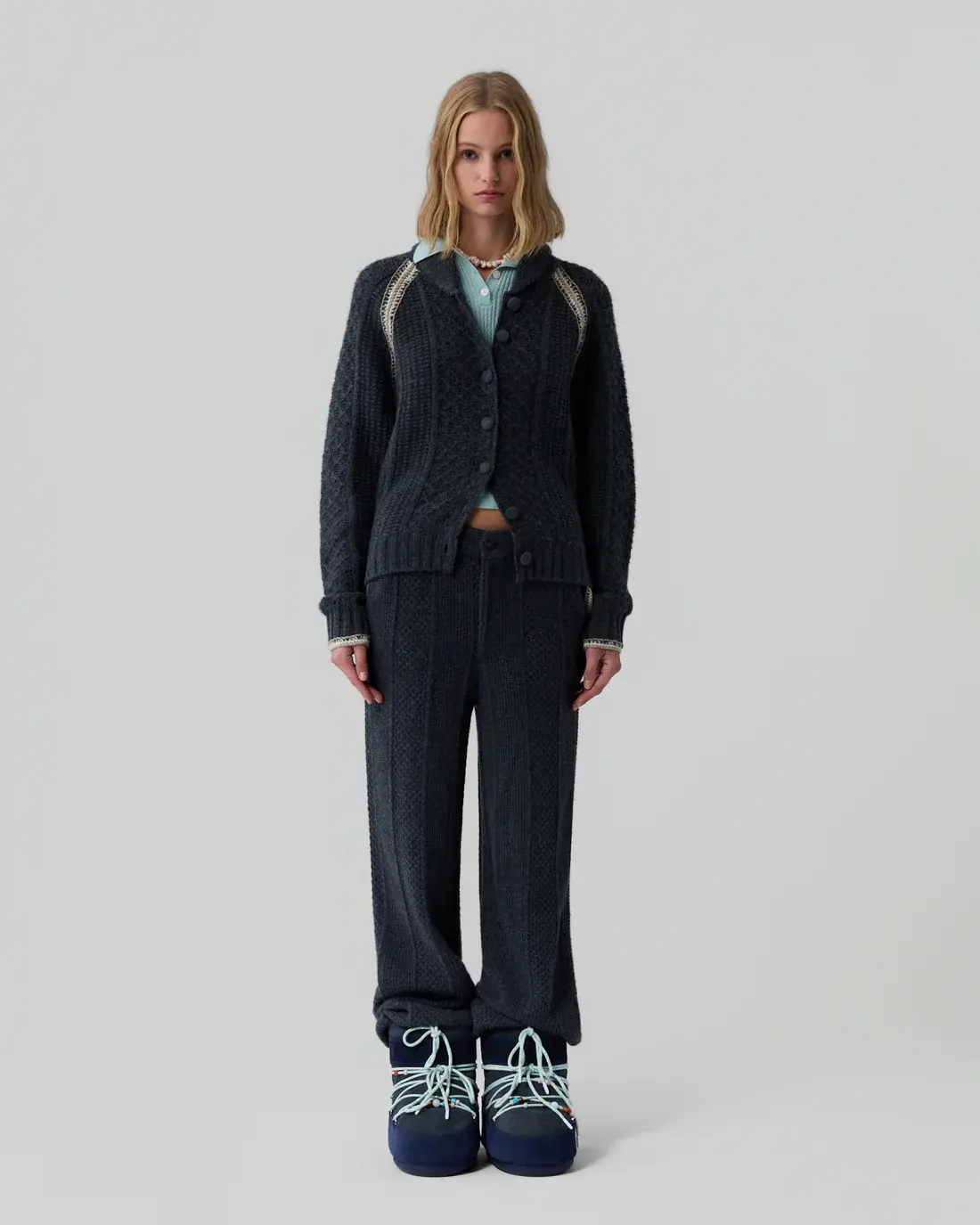A modern heirloom, the Marlowe Cable Cardigan combines rich texture with a sculptural shape. This women’s cashmere cardigan is crafted from a heavy-weight wool–cashmere blend with a vertical waffle stitch and hand-finished crochet detailing. Pair it with the matching Tailored Cable Trouser for a cozy knit set.