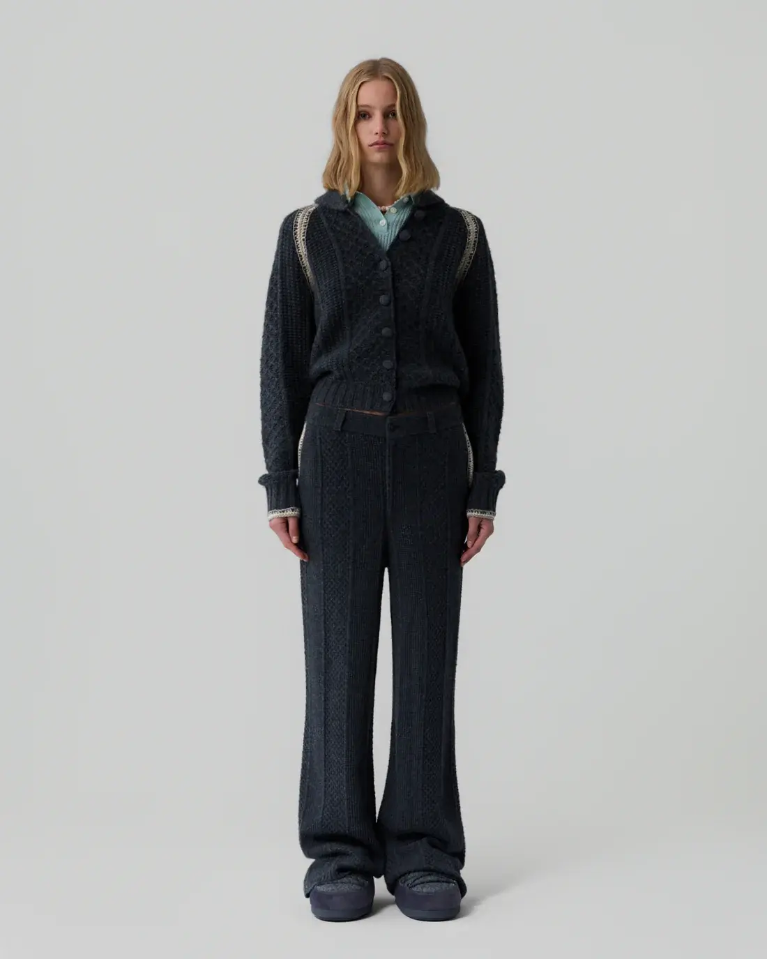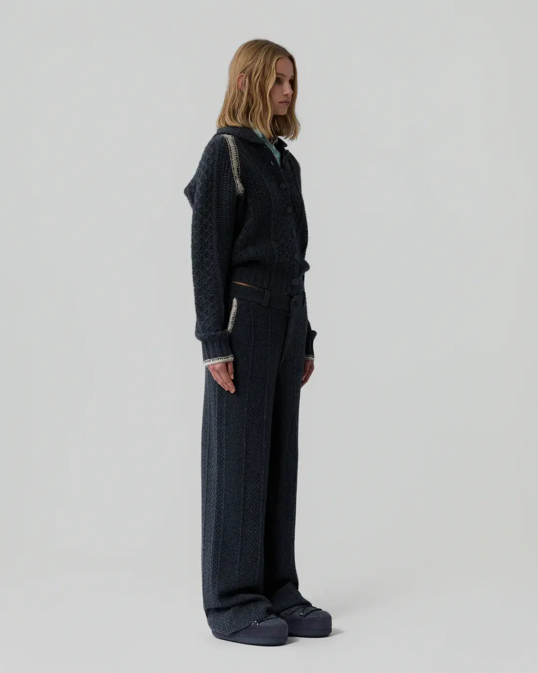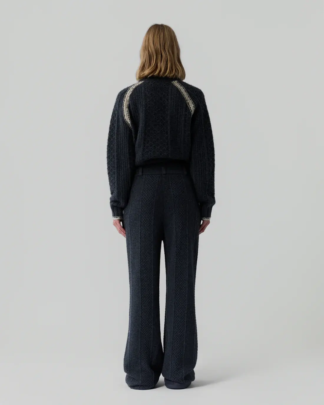 The Tailored Cable Trouser is a women’s cashmere pant knit from a heavy-weight wool–cashmere blend with a vertical waffle stitch. Detailed with hand-finished crochet trim at the pockets, it offers a refined take on cozy dressing when styled with the Marlowe Cable Cardigan.