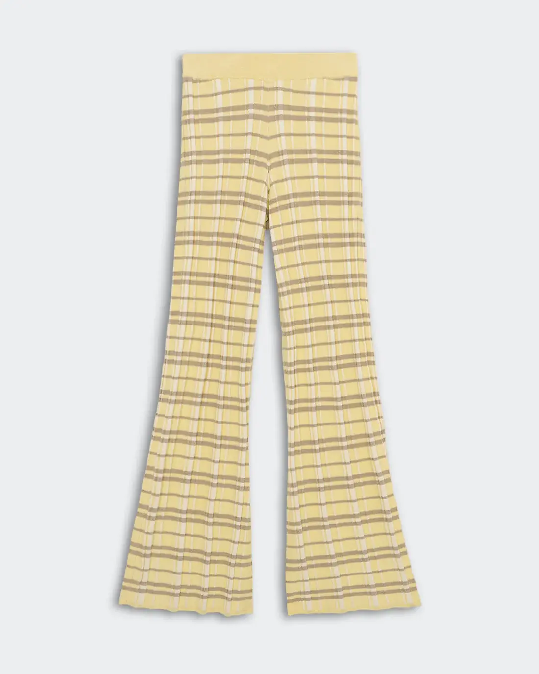 LIGHT-WEIGHT RIB PLAID FLARE PANT HIGH ANKLE LENGTH ELASTICATED RIB WAISTBAND 70% SILK 30% LINEN BLEND ELLA IS 5' 11" / 180 CM and is wearing a Small.