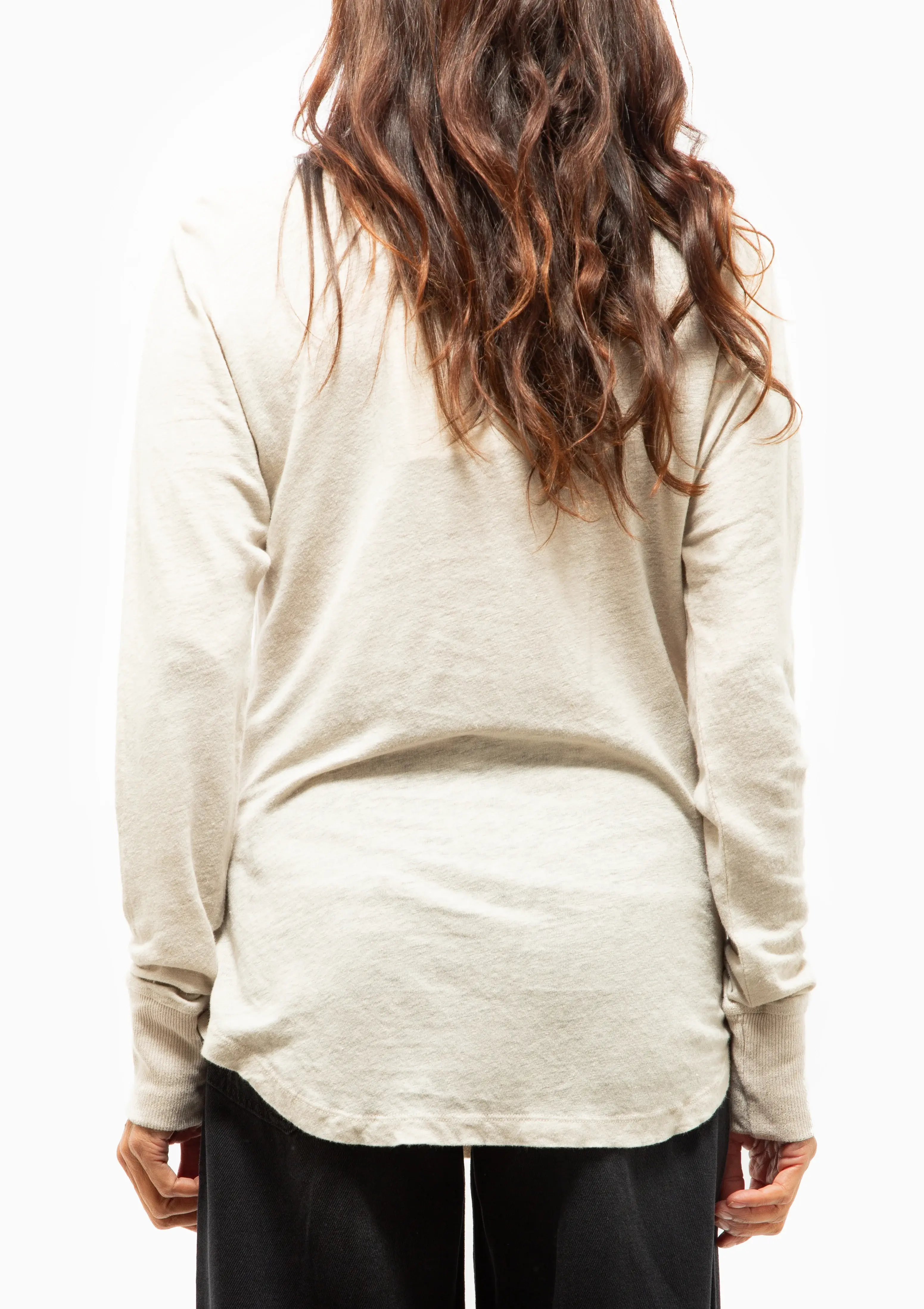 The Zeline shirt in bark rust feature refined blend of black linen and flax, offering an imported quality. Designed with a U-neck, long sleeves and gracefully curved hem, it combines elegance with comfort.