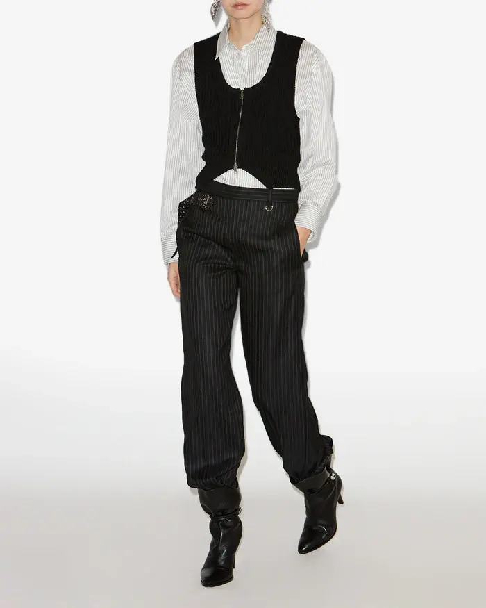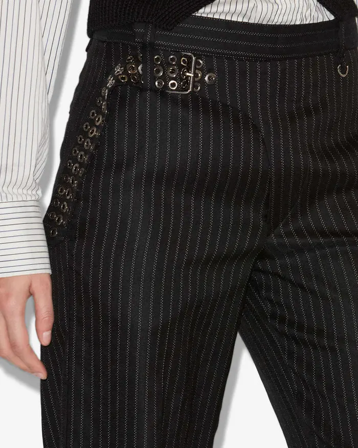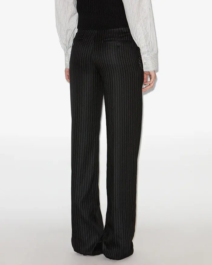 Straight-leg tennis stripe suit pants Virgin wool Fitted waistband with eyelets and loops Piped side and back pockets Hidden fastener Pleated front Medium-rise waist
