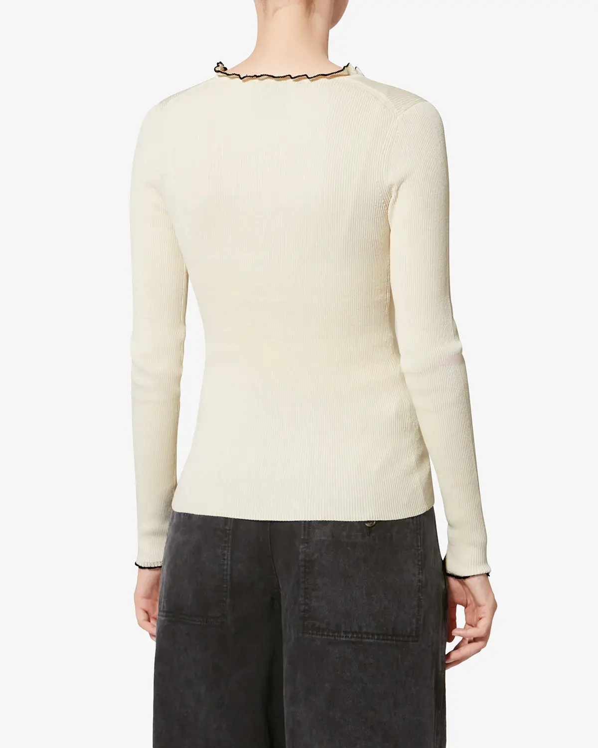 Lightweight cotton and silk blend cardigan Ruffled V-neckline Long sleeves Buttoned front with contrasting ruffled trim Fitted