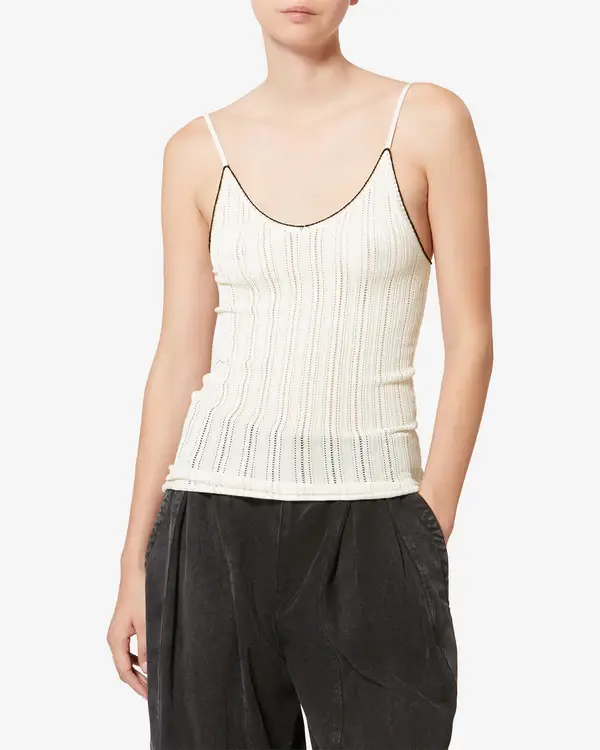 Lightweight openwork cotton and silk tank top Low-cut V-neckline with contrasting trim Thin straps Fitted