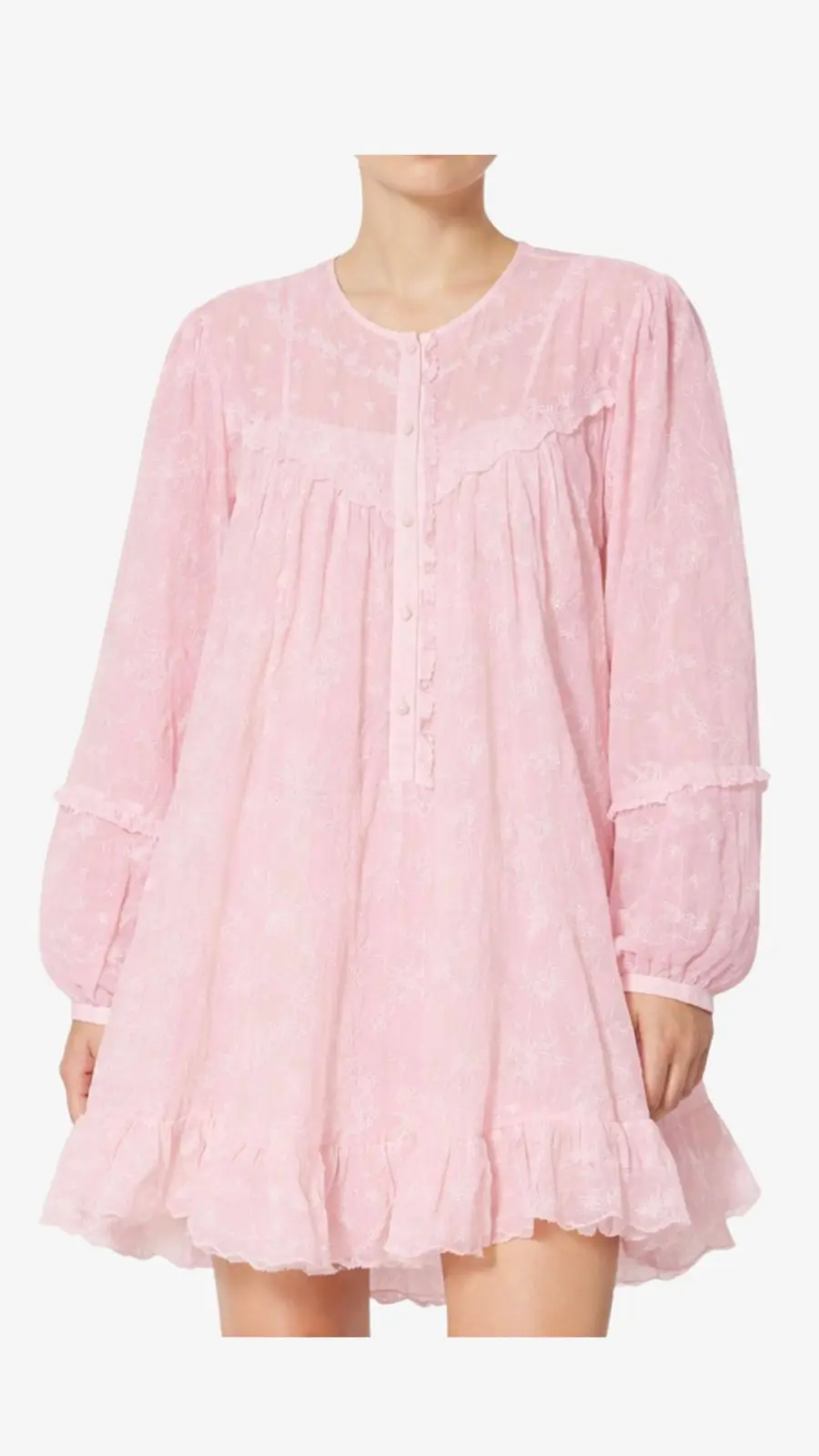 Short cotton and silk floral embroidery dress Round neckline extending into a button tab Long sleeves with tapered buttoned cuffs Decorative frills Flared cut