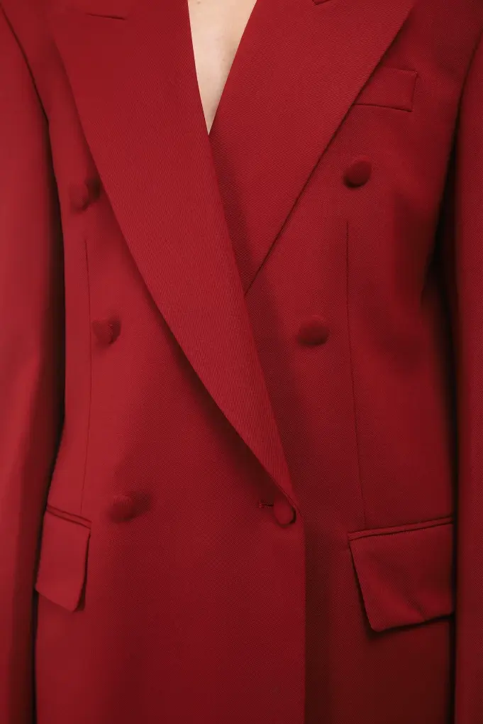 An elongated double-breasted jacket with an accentuated shoulder line will make an ideal tandem with a pencil skirt and will make the look with worn jeans more elegant. The model with three external and two internal pockets, many buttons on the cuffs and peaked lapels was sewn from wool twill.