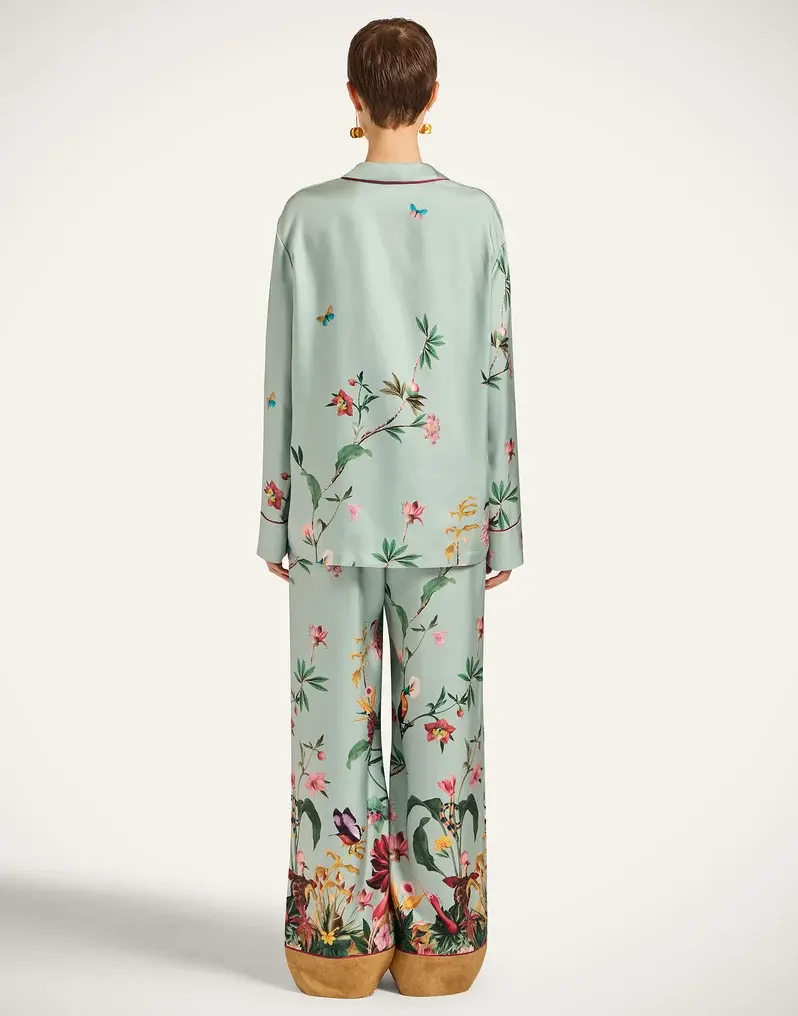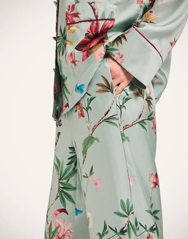 Silk twill Straight-cut pants with elastic waist Contrast piping Composition: 100% Silk Made in Italy Garment length: 107cm The model is 176 cm / 5′ 9″ tall and wears a size S
