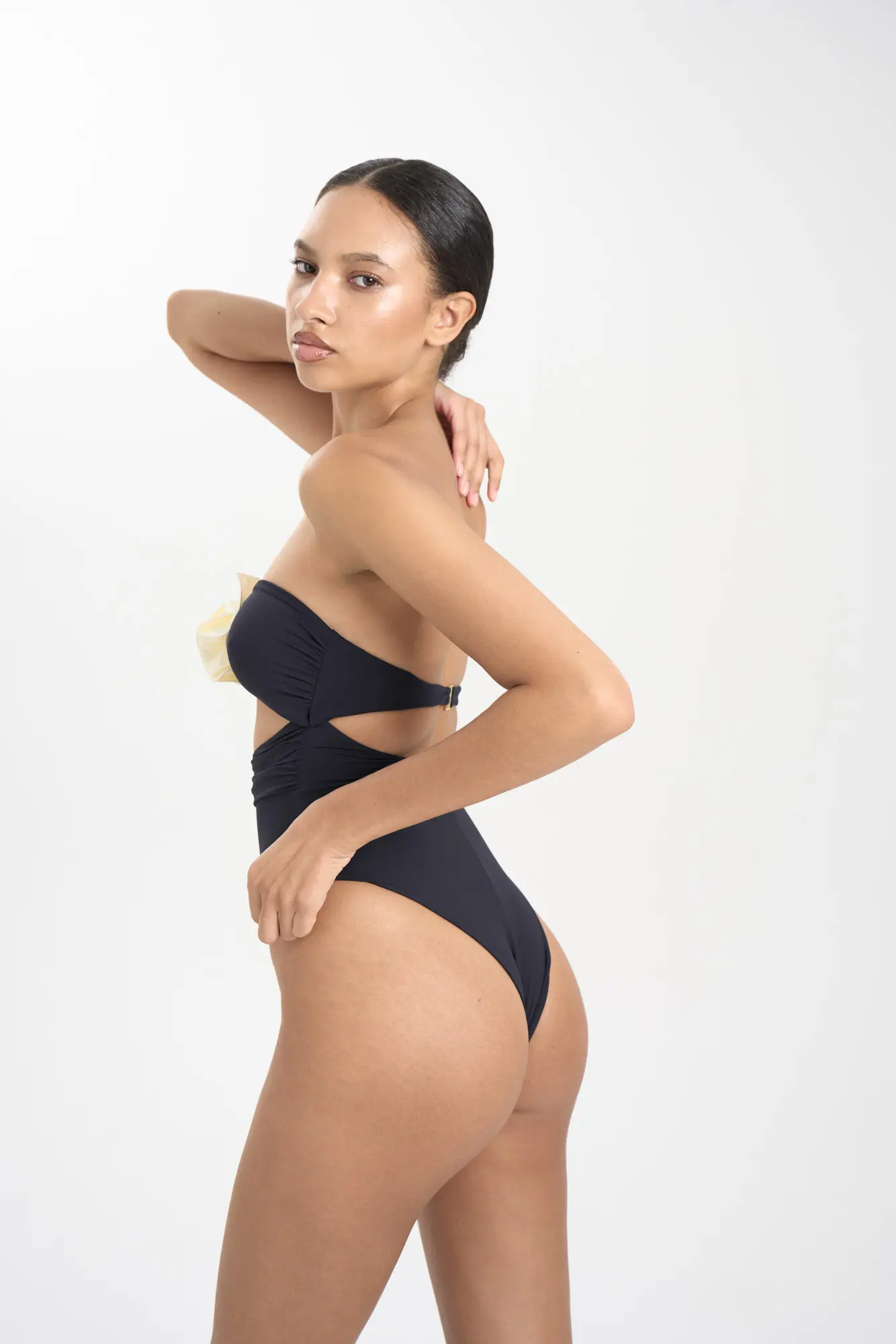 This bandeau one-piece with a bold, oversized lycra flower makes an unforgettable impression.