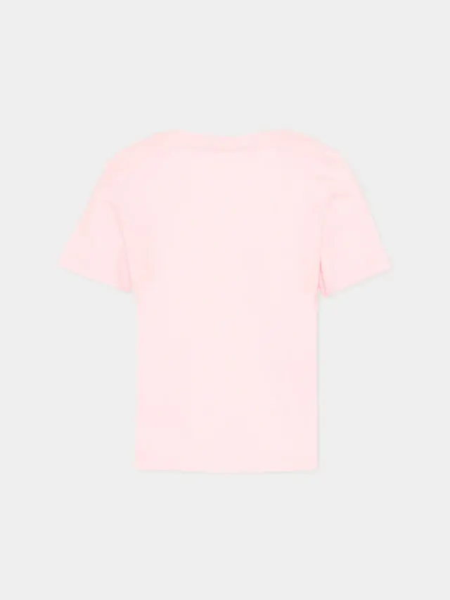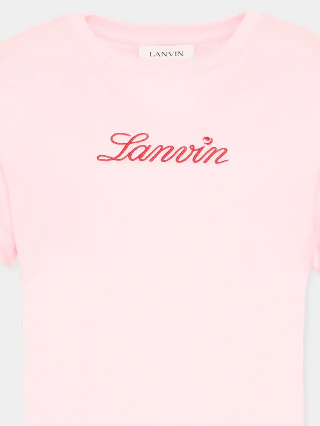 Short-sleeve T-shirt in pink cotton jersey by Lanvin with a clean crew neck and straight fit. The front is animated by the contrasting Lanvin script logo, centrally positioned on the chest for an immediate graphic touch. The short sleeves and regular hem maintain a comfortable fit that enhances the simplicity of the essential profile.