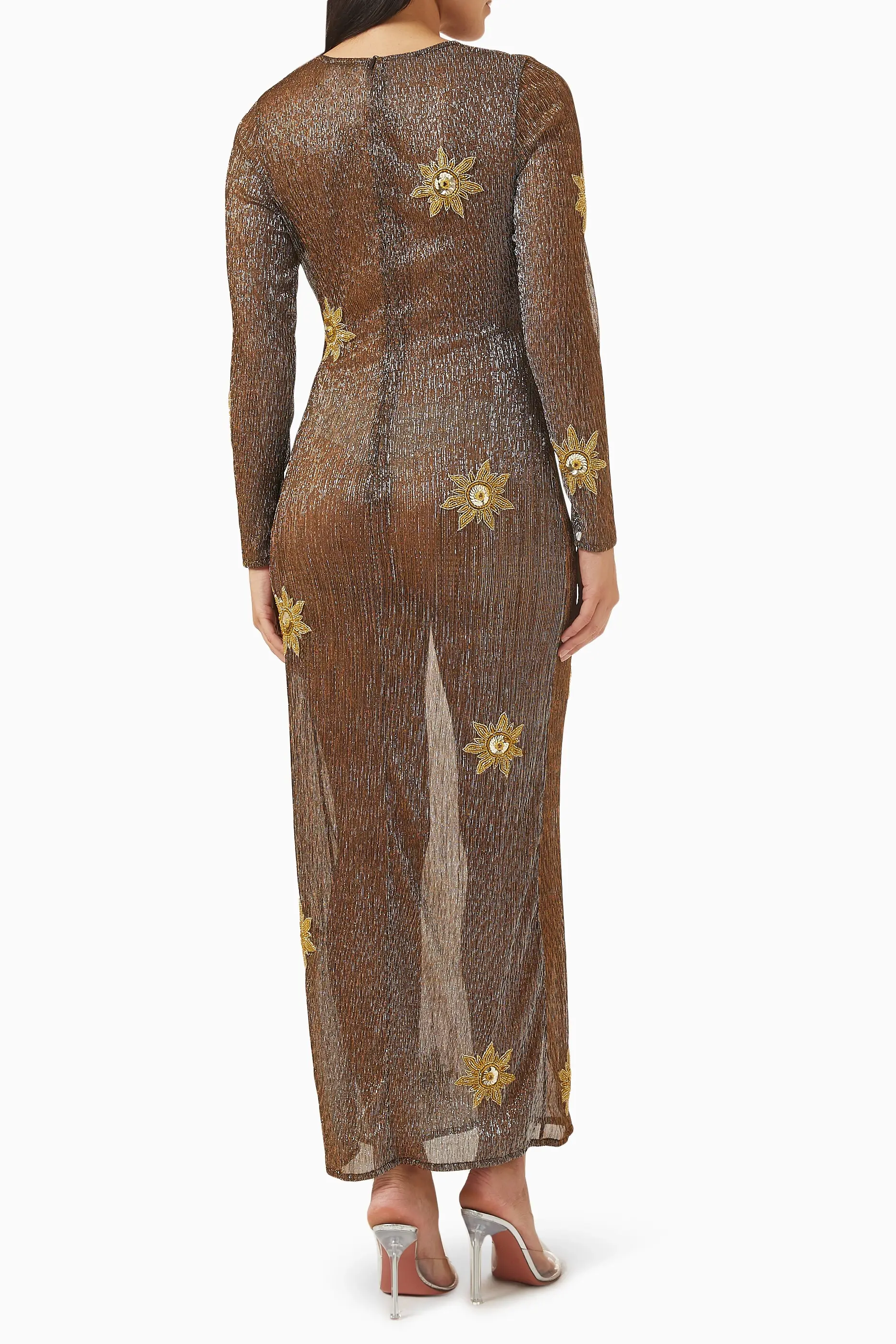 Leslie Amon's Sun maxi dress is crafted in sheer metallic fabric with sequin sun appliqués. Featuring a straight silhouette and long sleeves, this option offers an elegant choice for evening wear that catches the light.