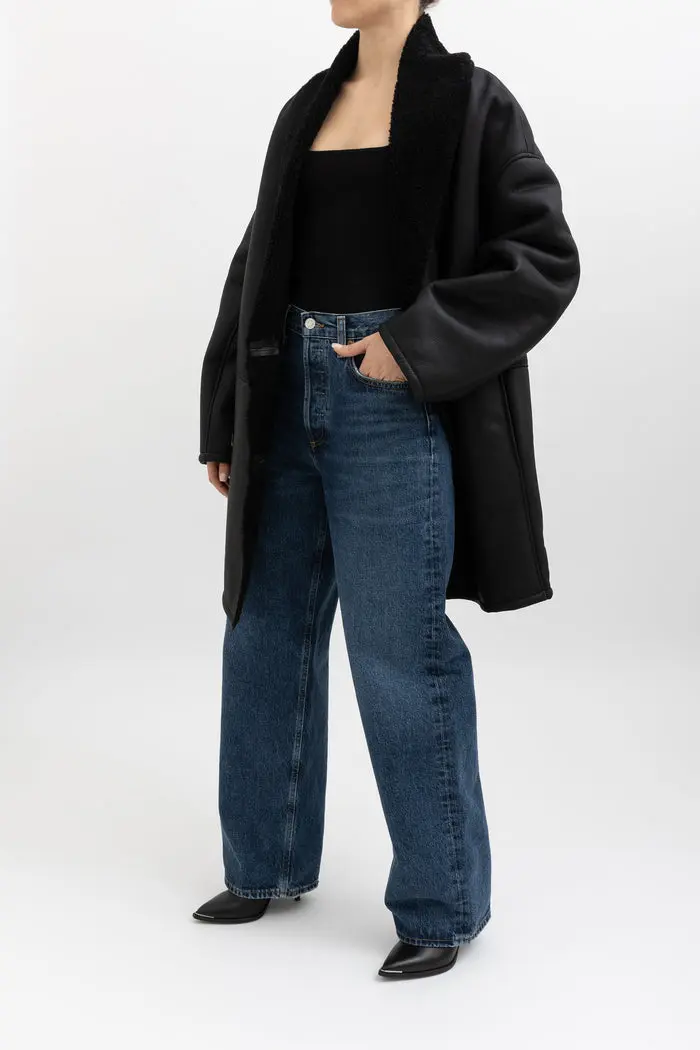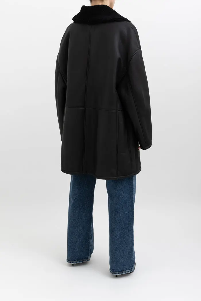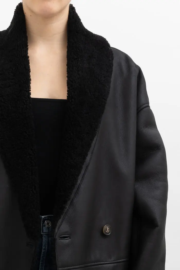 Loulou Studio 'Namo' coat, made from shearling with a smooth, matte exterior and a fuzzy lining, it's cut for an oversized fit and has a smart double-breasted front.