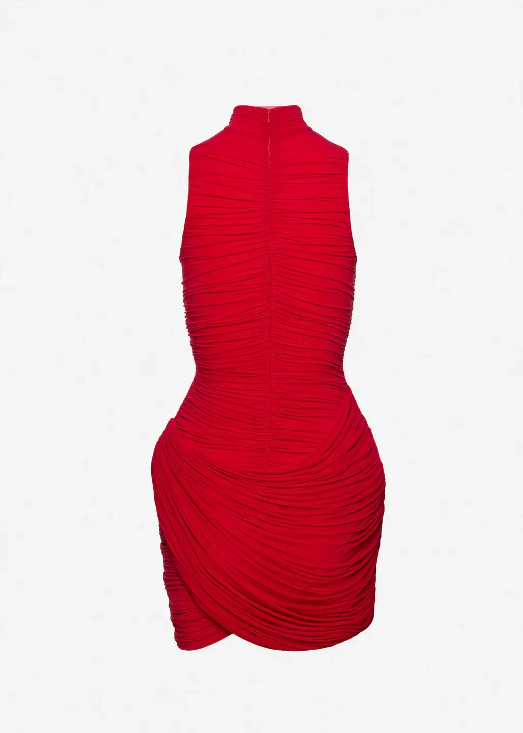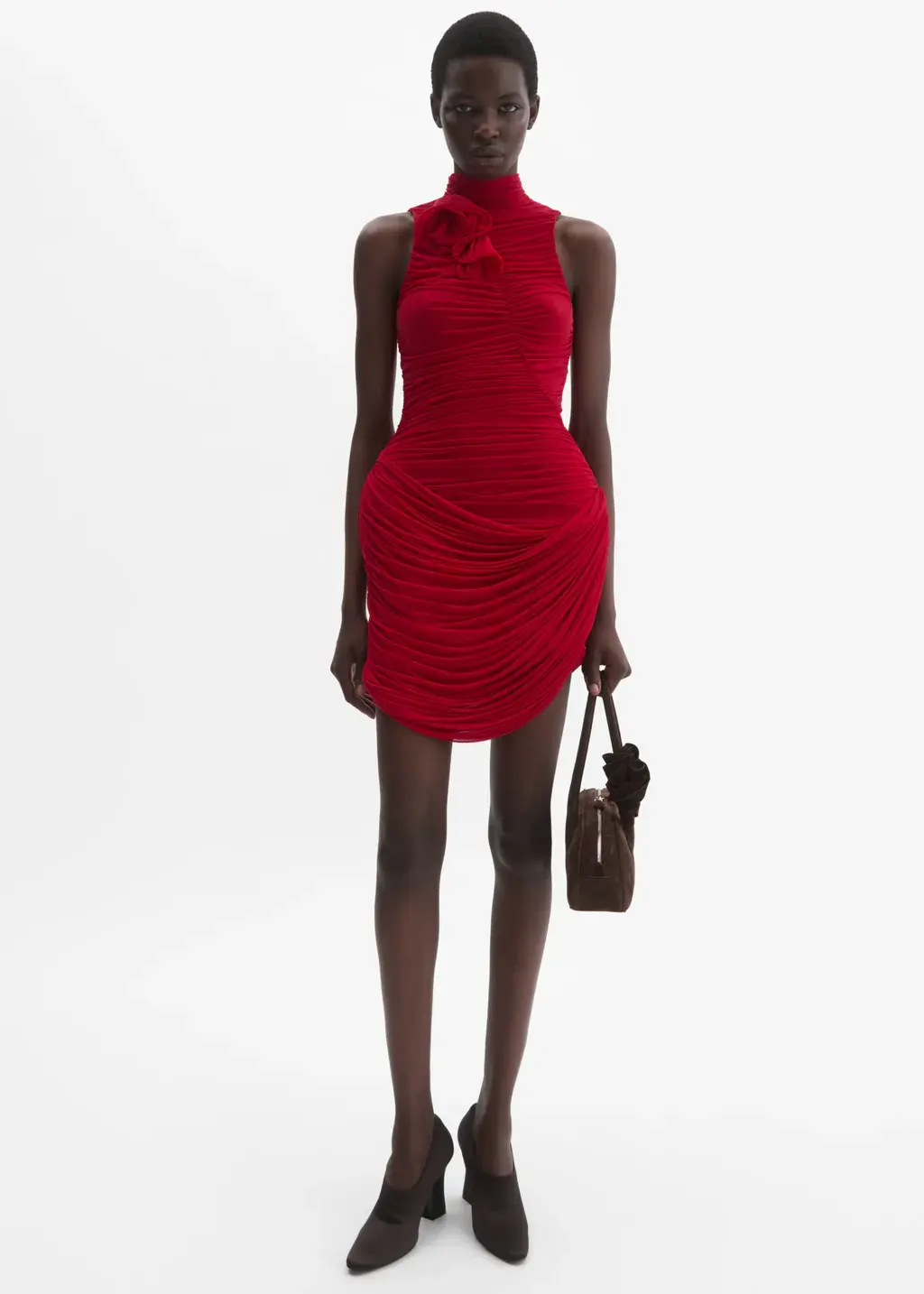 A figure-hugging mini dress with a ruched high neckline and sculptural detailing throughout. A handcrafted floral appliqué adorns the neckline, while additional draped overlays at the hips add volume and movement. Subtle padding accentuates the hips for a sculpted effect. Finished with a concealed back zip and an integrated bodysuit for a seamless fit.