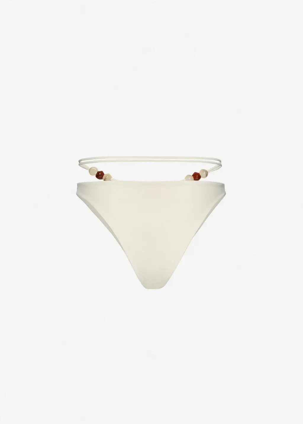 Low-rise bikini bottoms designed with slim double straps that wrap around the hips, creating a flattering cut-out effect. Decorated with beads.