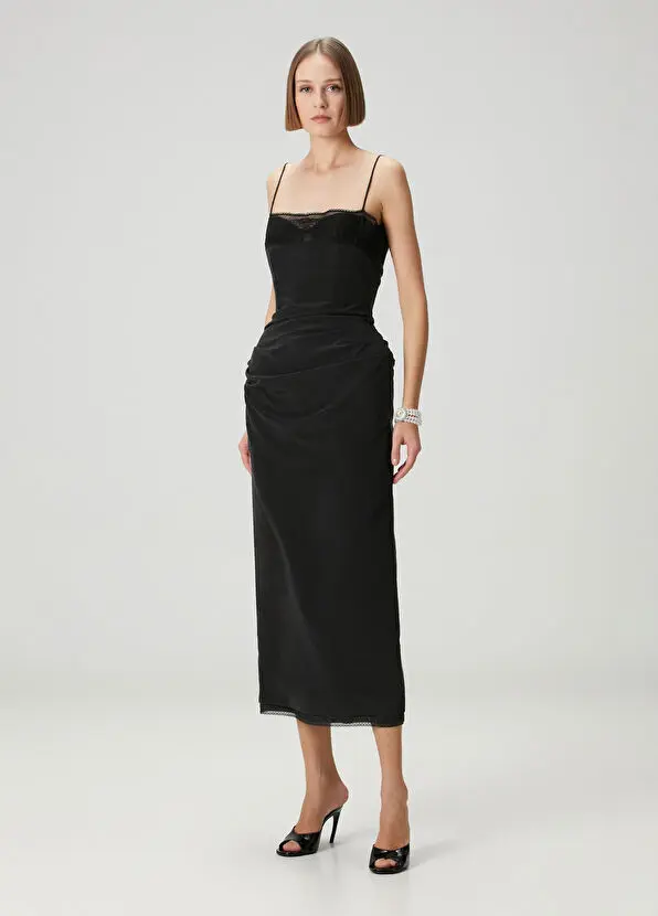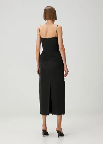 Thin-strapped, draped, midi-length silk dress. Product size: 36 / Model measurements: Height: 180 cm - Bust: 80 cm - Waist: 61 cm - Hips: 90 cm.