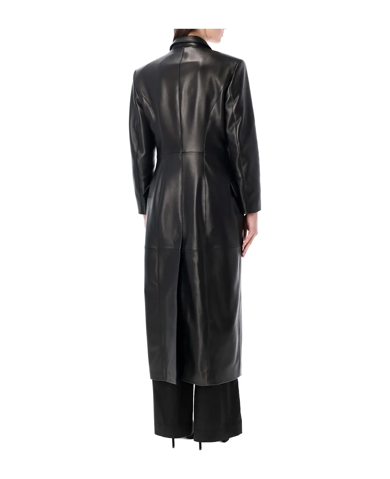 Minimal And Powerful, This Magda Butrym Leather Coat Redefines Classic Tailoring With A Contemporary Edge. Crafted From Smooth Leather, It Features A Streamlined Silhouette With Structured Shoulders, Sharp Lapels And A Buttoned Front Closure. The Elongated Cut Enhances The Figure While Maintaining A Refined, Versatile Appeal, Perfect For Polished Urban And Formal Styling. Tailored Construction Classic Lapels Front Button Fastening Applied Pockets Midi Length Lined Alessandra Is 1,75 M And Wears Size 38
