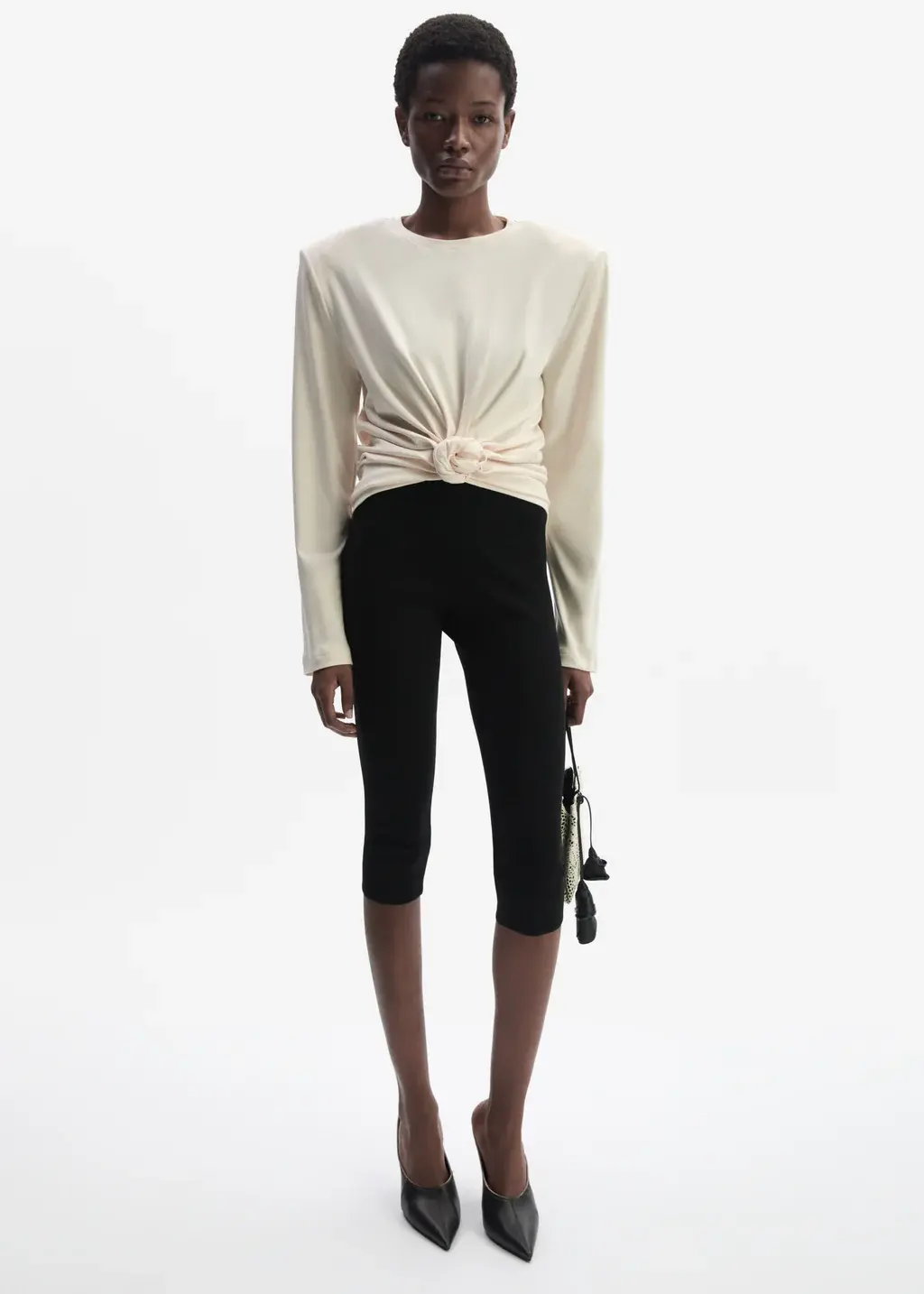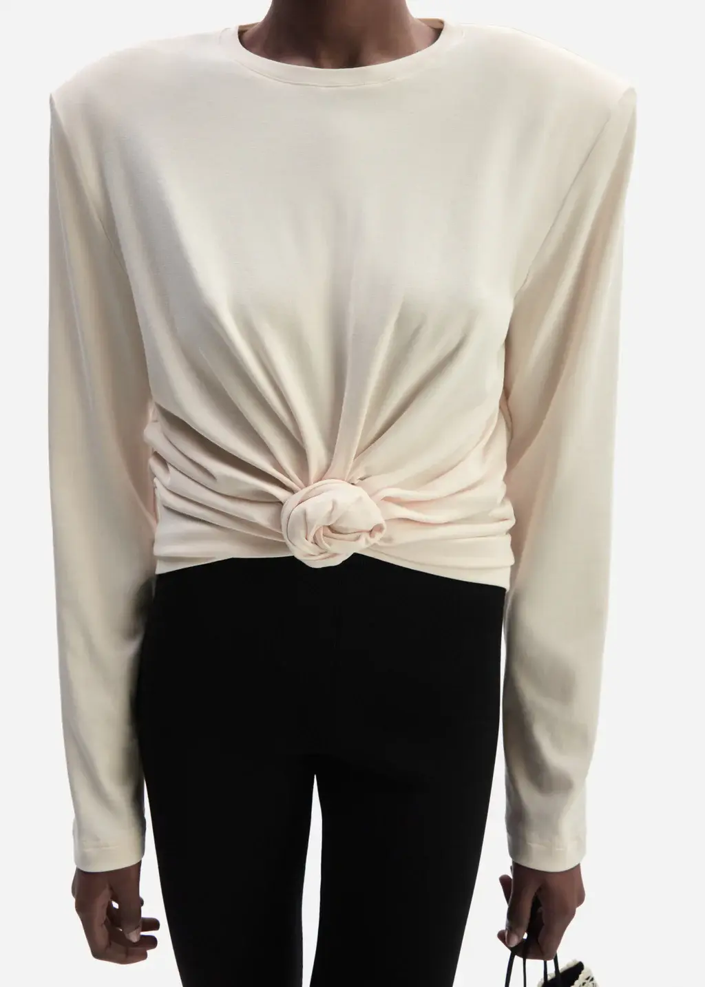 A jersey-style long-sleeve blouse defined by a sculptural knot detail at the front. The shoulders are gently broadened with detachable padding, lending structure to the soft silhouette. Embroidered logo-flower detail appears at the back, completing the design.