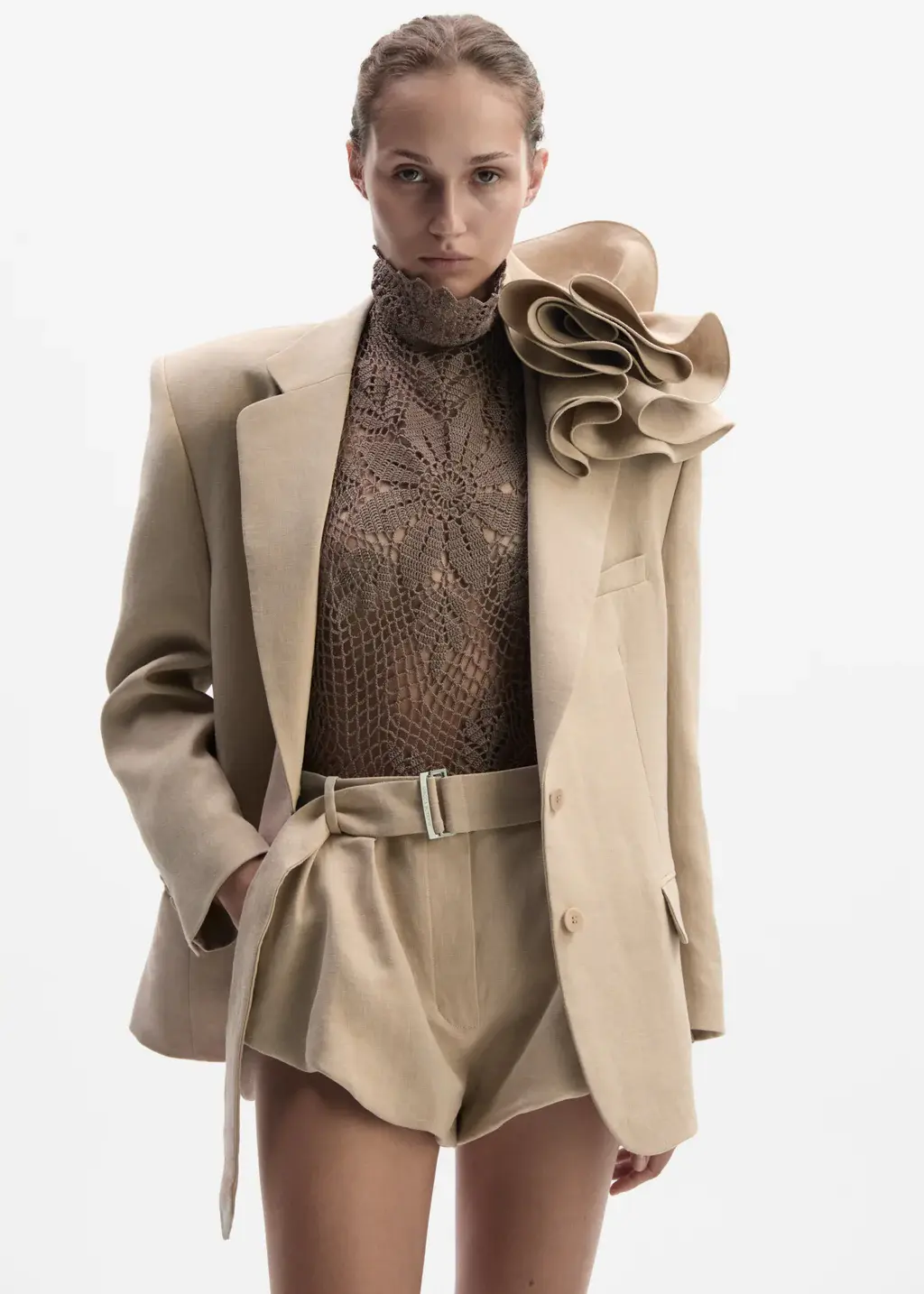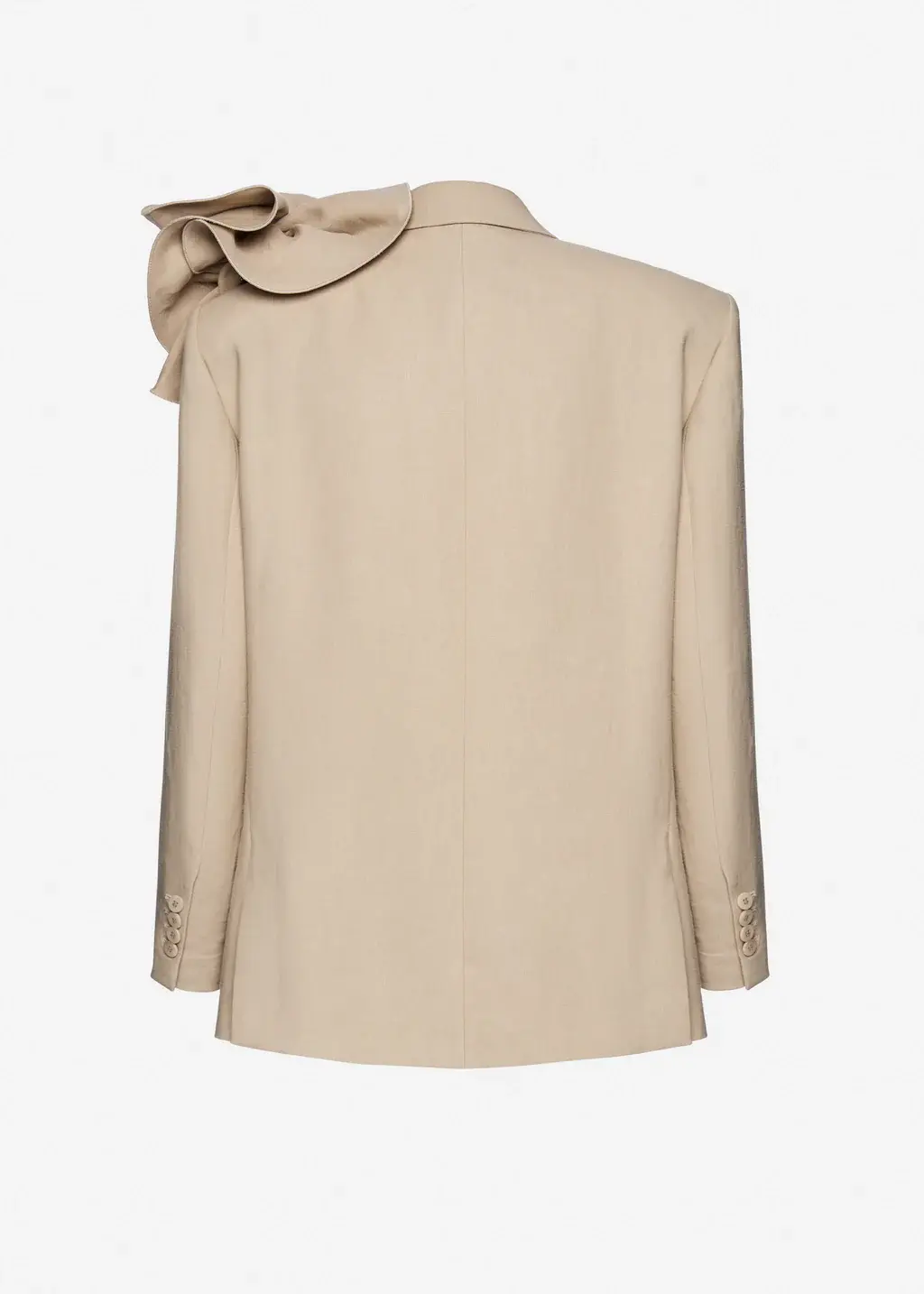 A straight-cut blazer defined by clean lines and a relaxed elegance. The single-breasted front fastens with two buttons and is finished with an open lapel, while pockets sit at the waist. A detachable flower at the shoulder adds a Magda Butrym romantic accent.