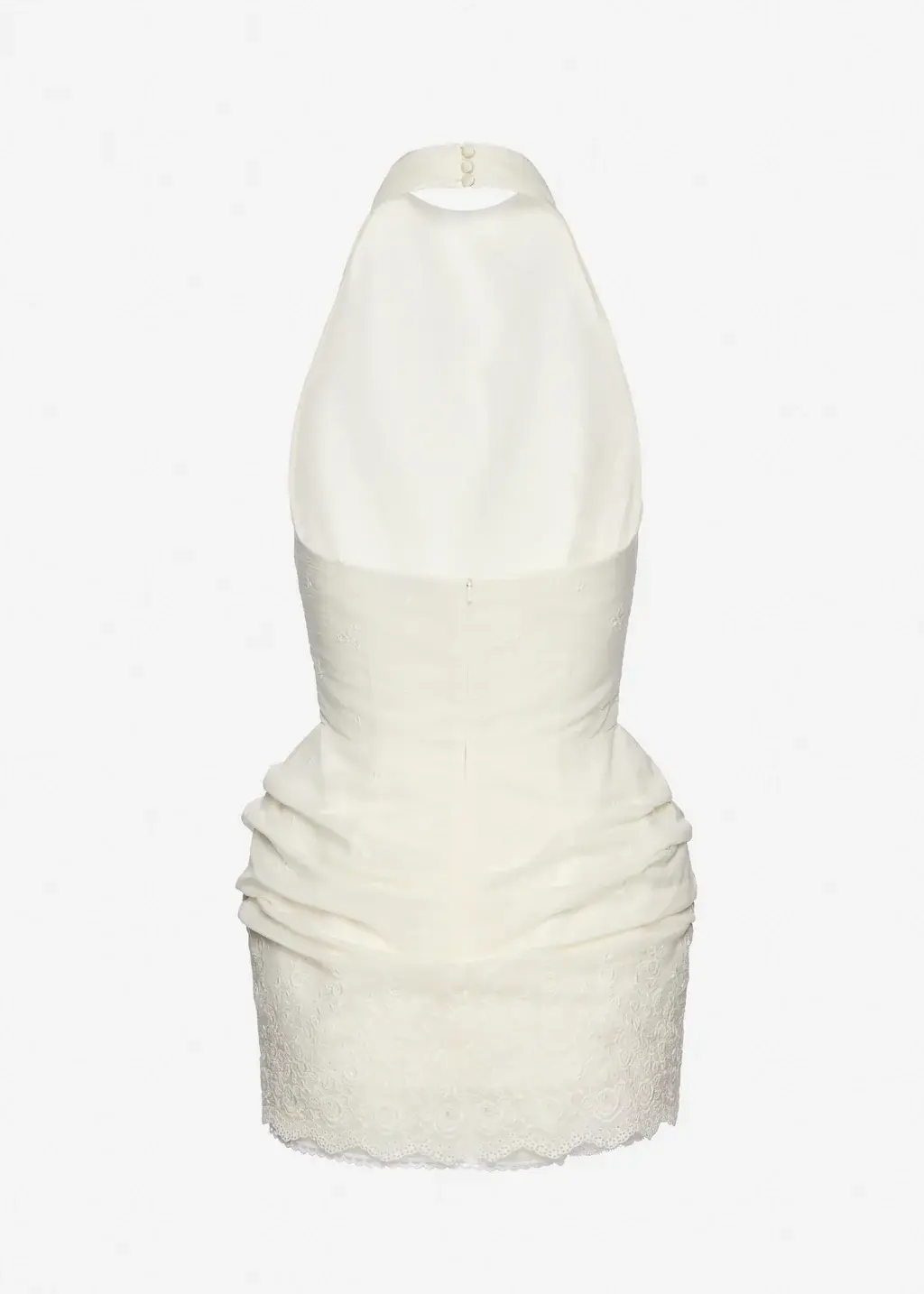 A halterneck mini dress defined by its rich textural contrast and sculpted proportions. The front rises high at the neck and fastens with buttons at the back, revealing an open-back silhouette. Cut at the waist, the design expands softly over the hips, supported by internal padding for a sculpted shape. The skirt is intricately constructed with a draped outer layer, shaped by folded detailing at the sides and center back, while the hem showcases the fabric’s ornate embroidered edge. A contrasting underlayer is revealed through a decorative front cut-out. Finished with a concealed center-back zip, the piece blends couture-level detailing with romantic elegance.