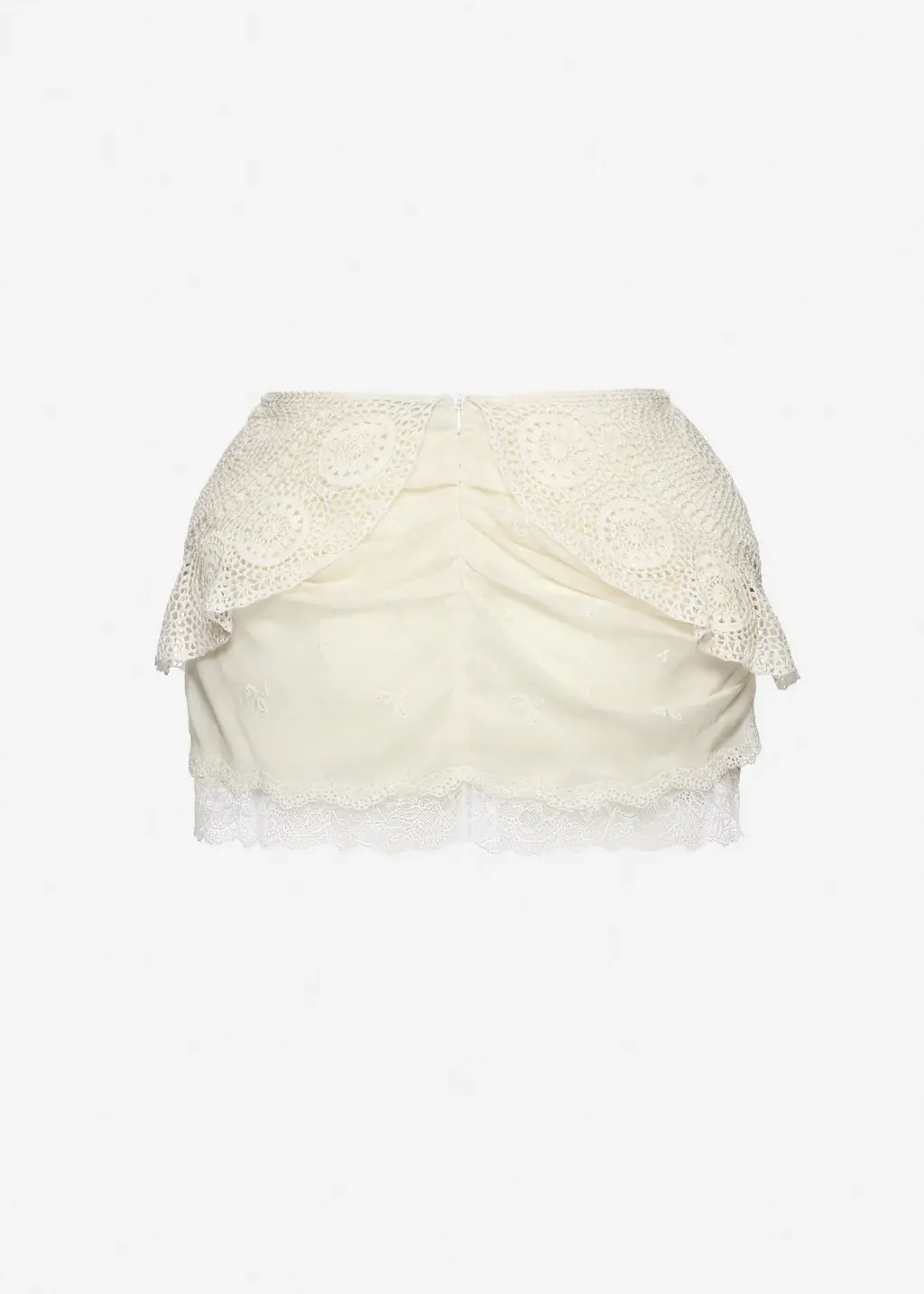 A sculptural mini skirt built through layered textures. The upper layer is crafted from crochet panels that softly frame the hips in a semi-circular silhouette, while beneath, a delicate embroidered fabric adds depth and lightness. The underlayer is finished with wide decorative lace, subtly visible at the hem. Padded hips enhance the silhouette, creating a distinctive, contoured shape. Finished with a concealed zip fastening at the centre back.