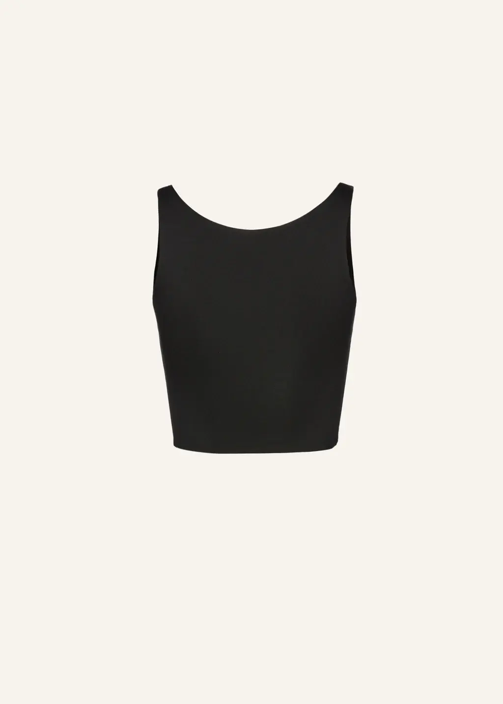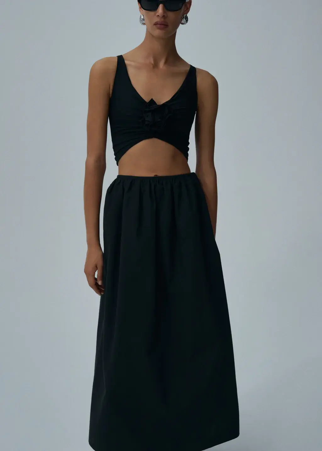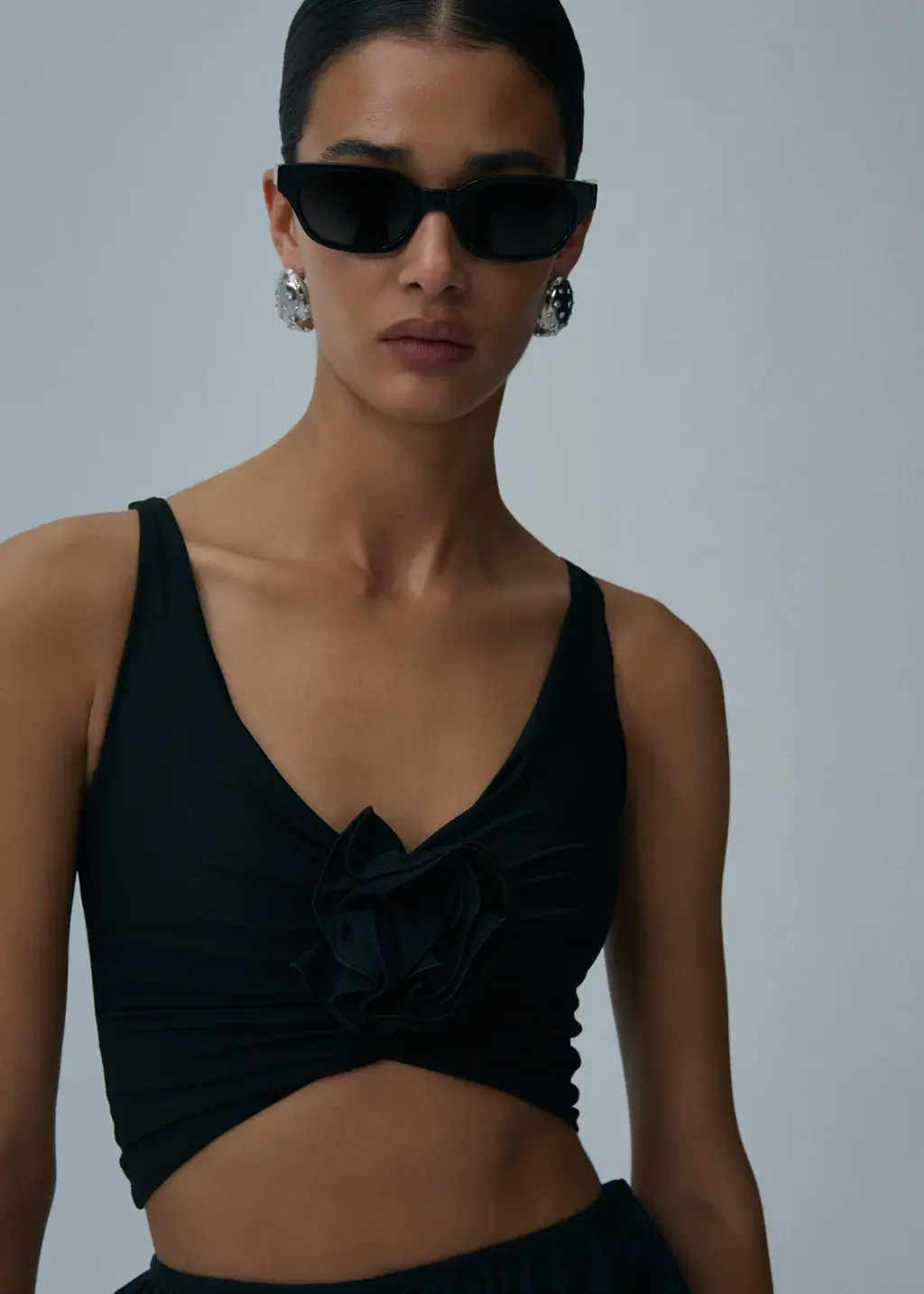 A stylish swim top featuring a plunging neckline and a ruched front, accented with a signature floral detail at the center. The back offers a clean, full-coverage design.
