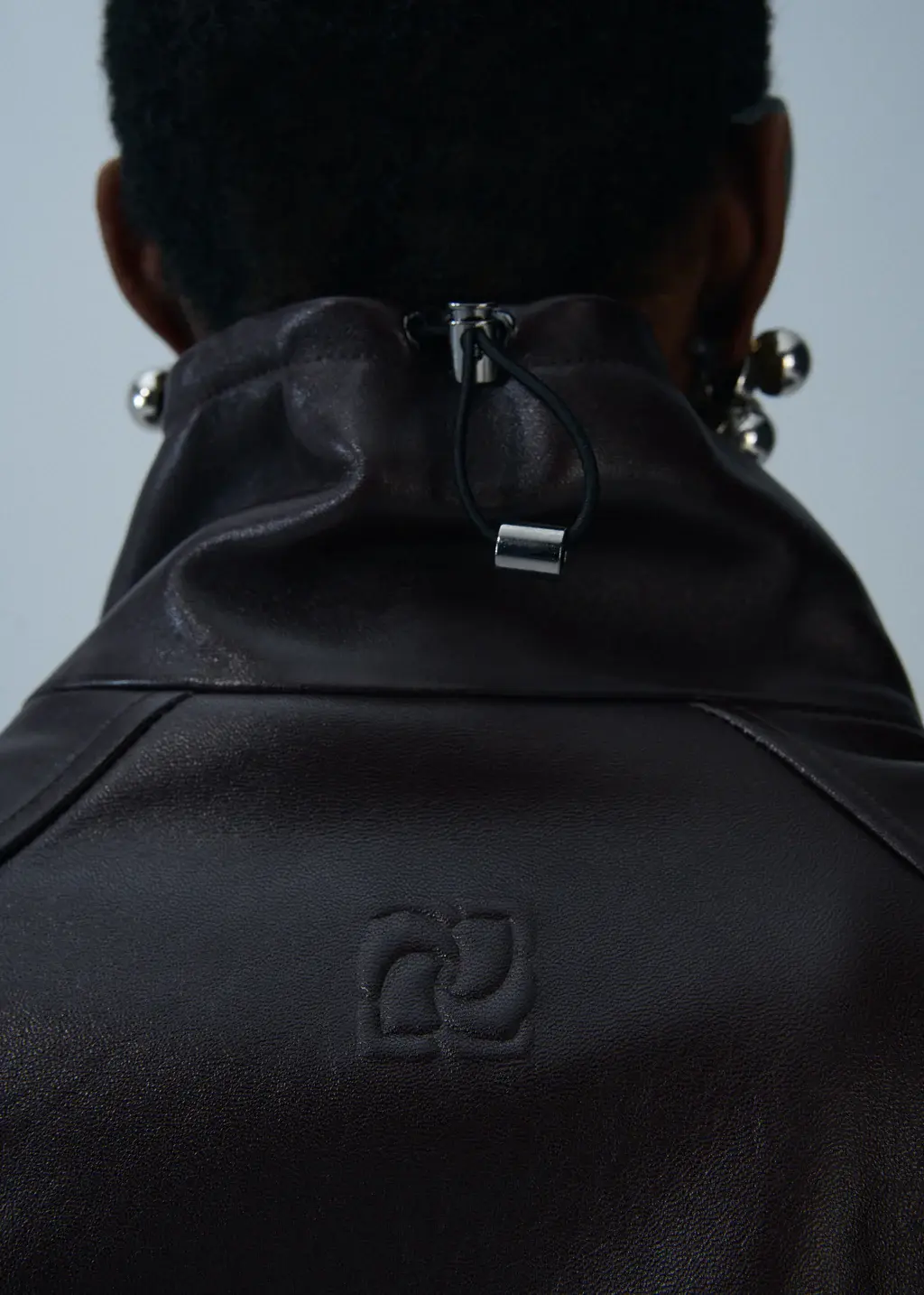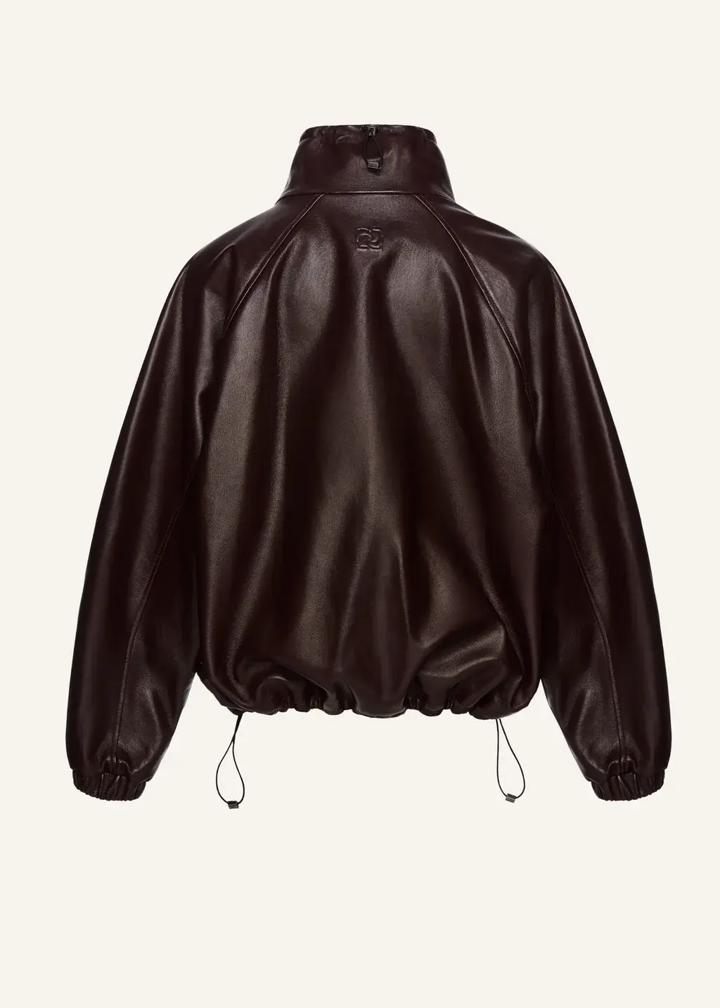 A classic oversized bomber jacket shape with an elasticized hemline to give modernity, and a zip up front closure.