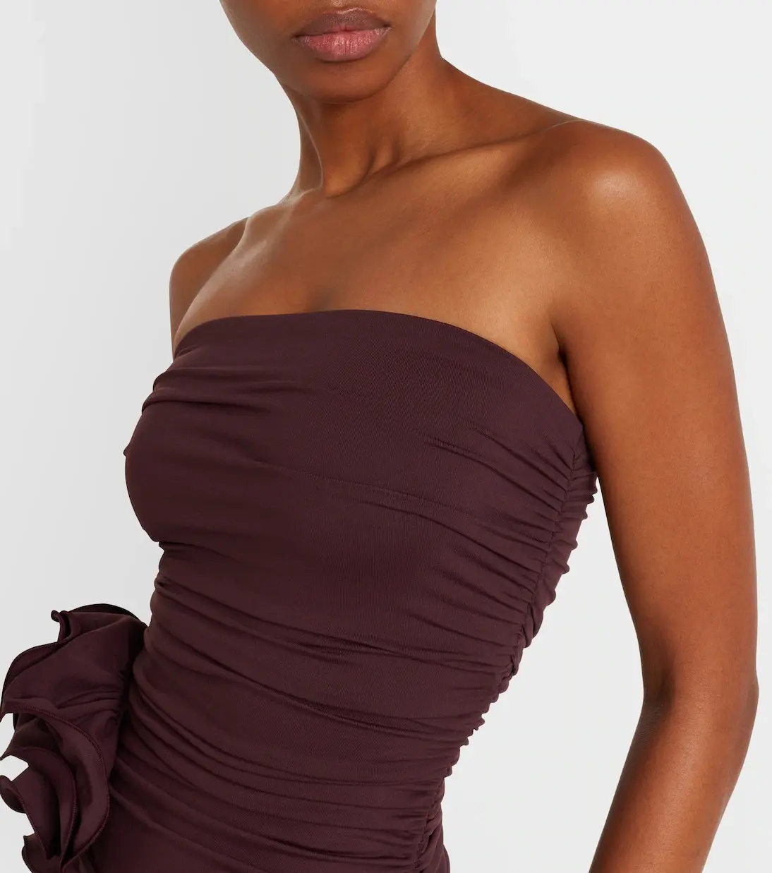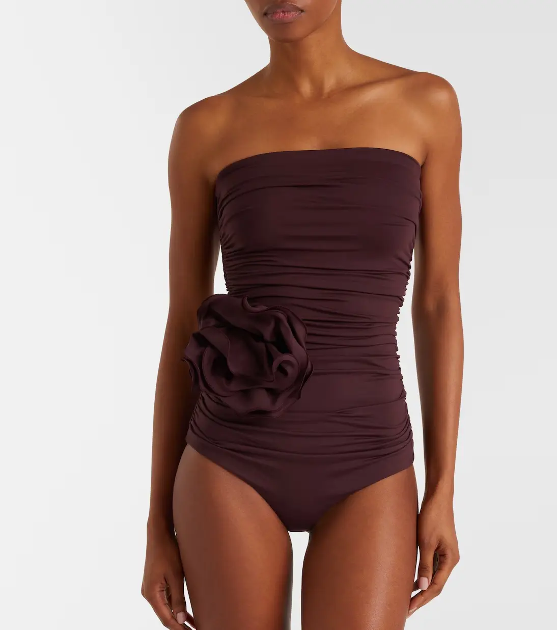 Floral appliqués have become something of a Magda Butrym signature, appearing artfully on the brand's most coveted designs. This burgundy swimsuit features a sculptural silhouette with a tonal rosette at the side and allover ruching.