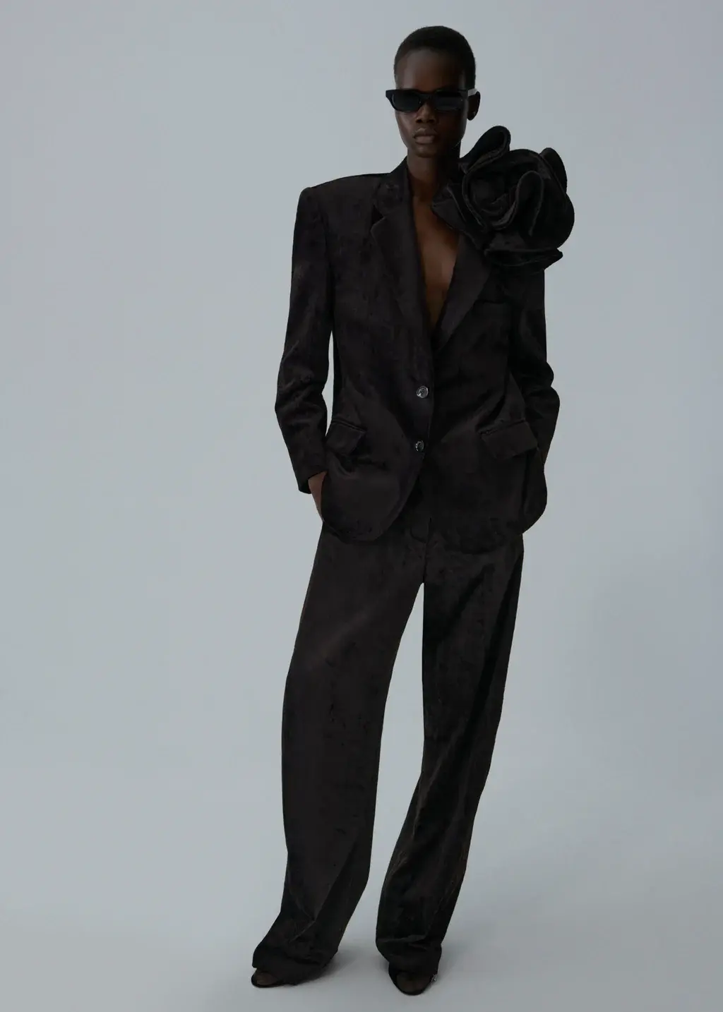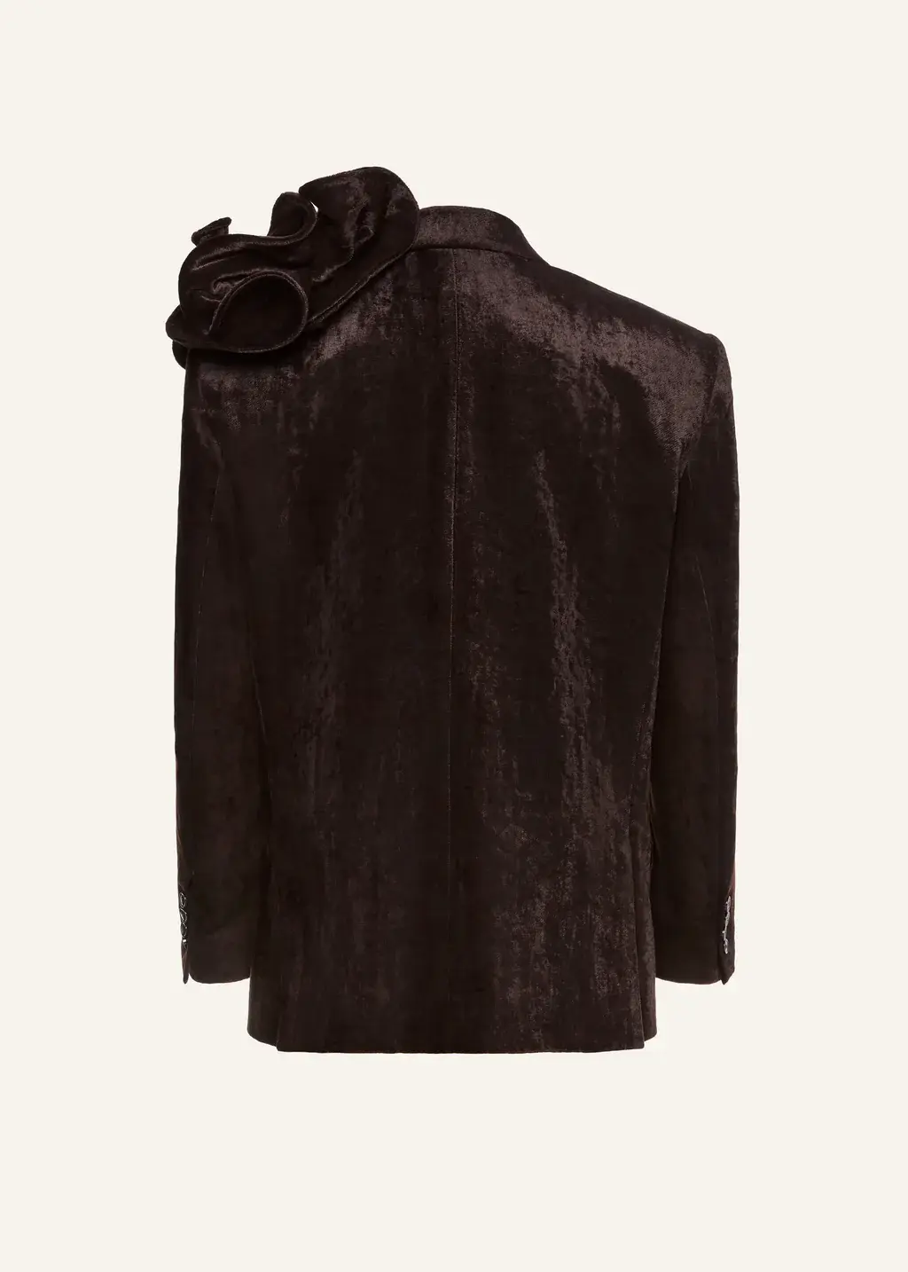 A tailored velvet blazer with strong shoulders and a soft, lustrous texture. Finished with classic notch lapels and flap pockets, the piece is adorned with Magda Butrym signature flower appliqué at the shoulder—fully detachable for versatile styling.