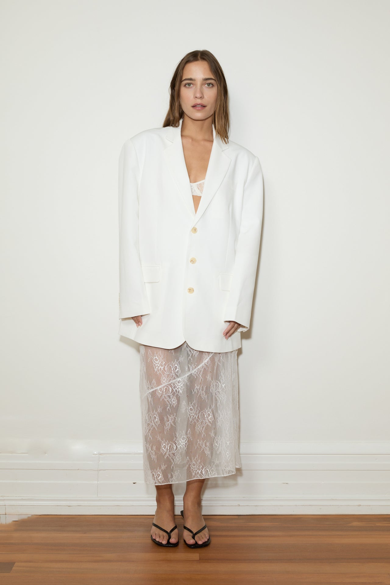 Our new oversized blazer: made from a mid weight traditional suiting fabric in an oversized silhouette, featuring padded shoulders and three button front closure. Fully lined.