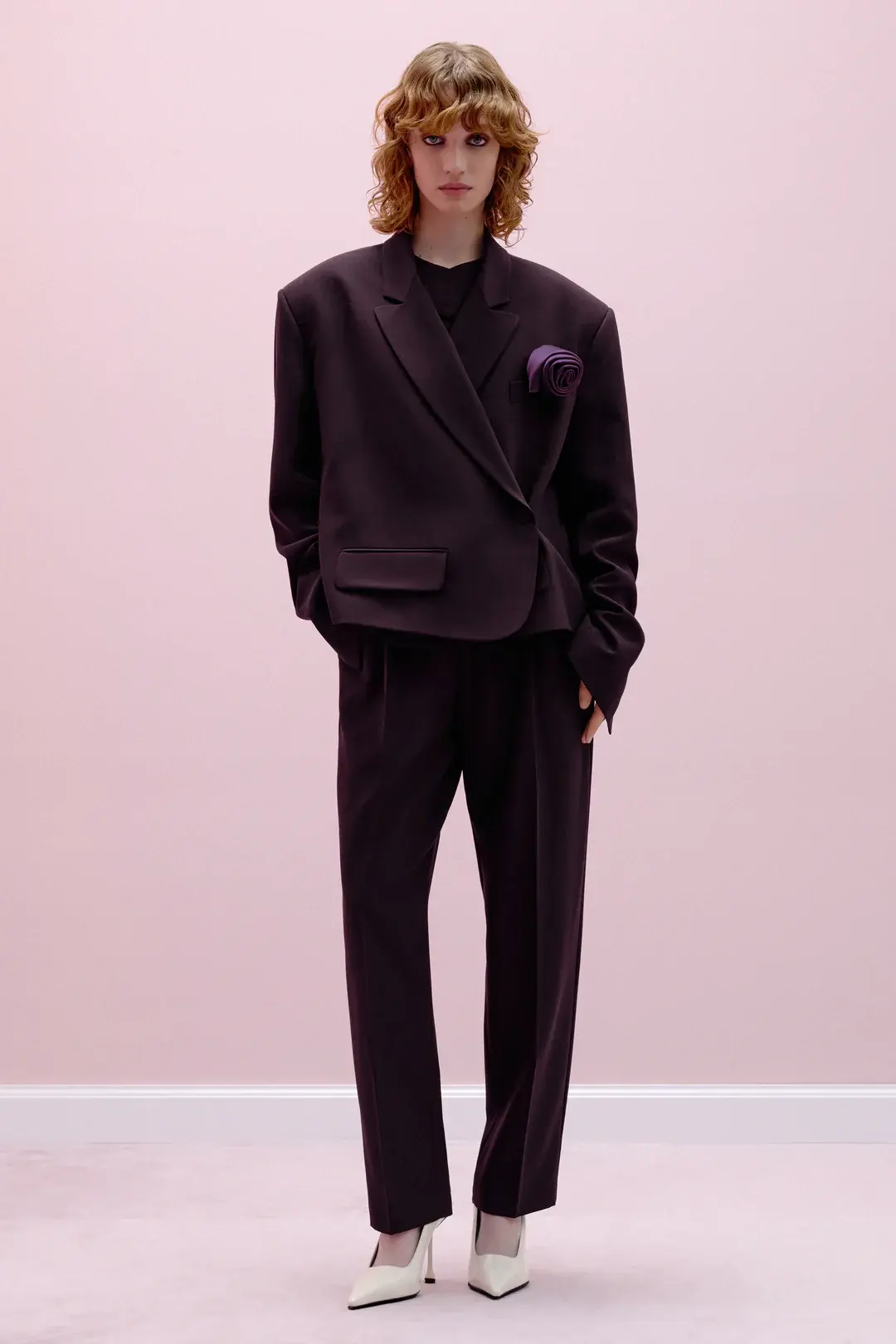 Pleated banana pants in a fig shade feature a high rise and a tight waistband, creating a streamlined fit that narrows towards the bottom. The shaped curved waistband is adorned with decorative buttons. The elastic insert on the back ensures a flexible and comfortable fit. Fastened by a concealed side zip. Featuring side pockets.
