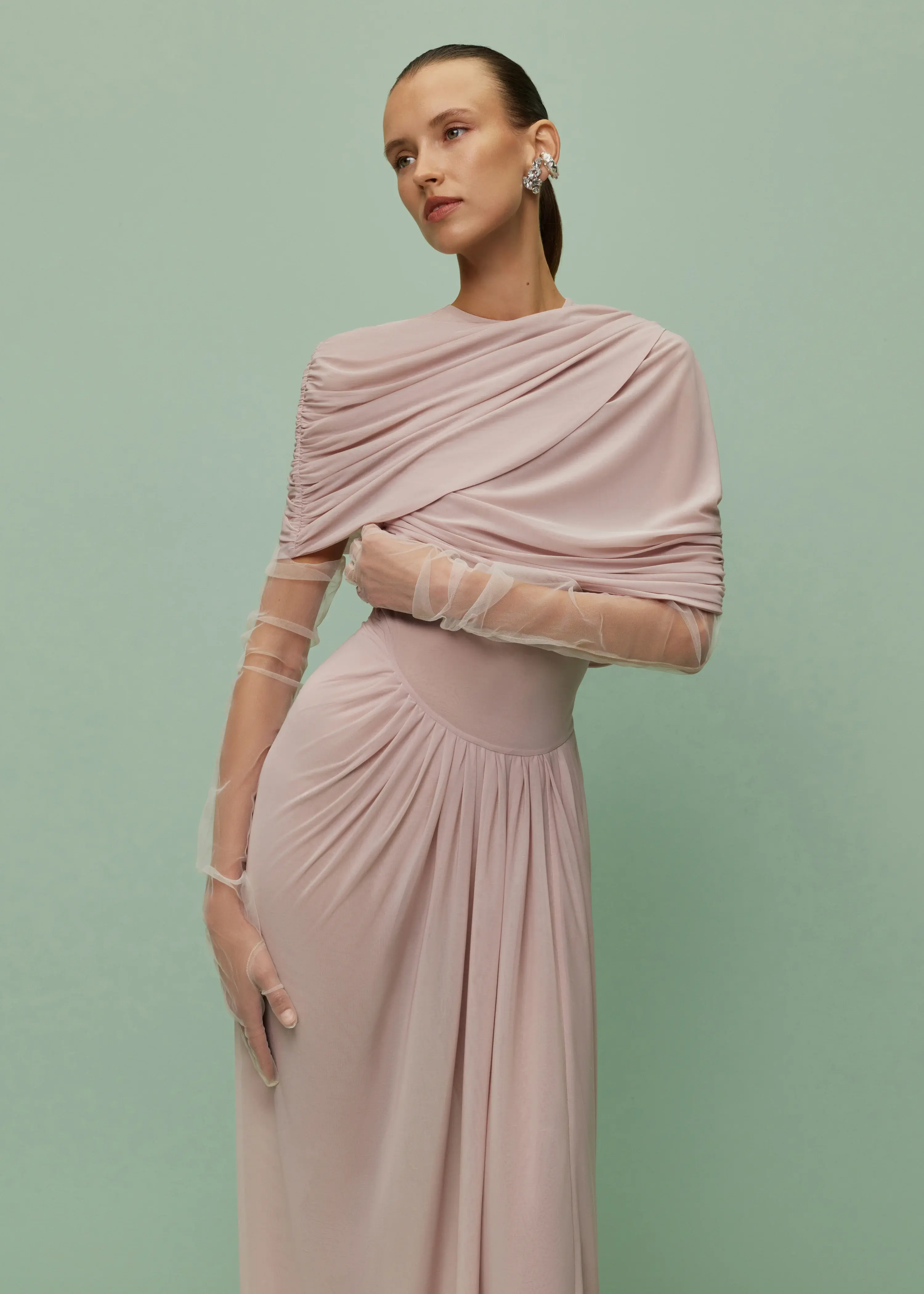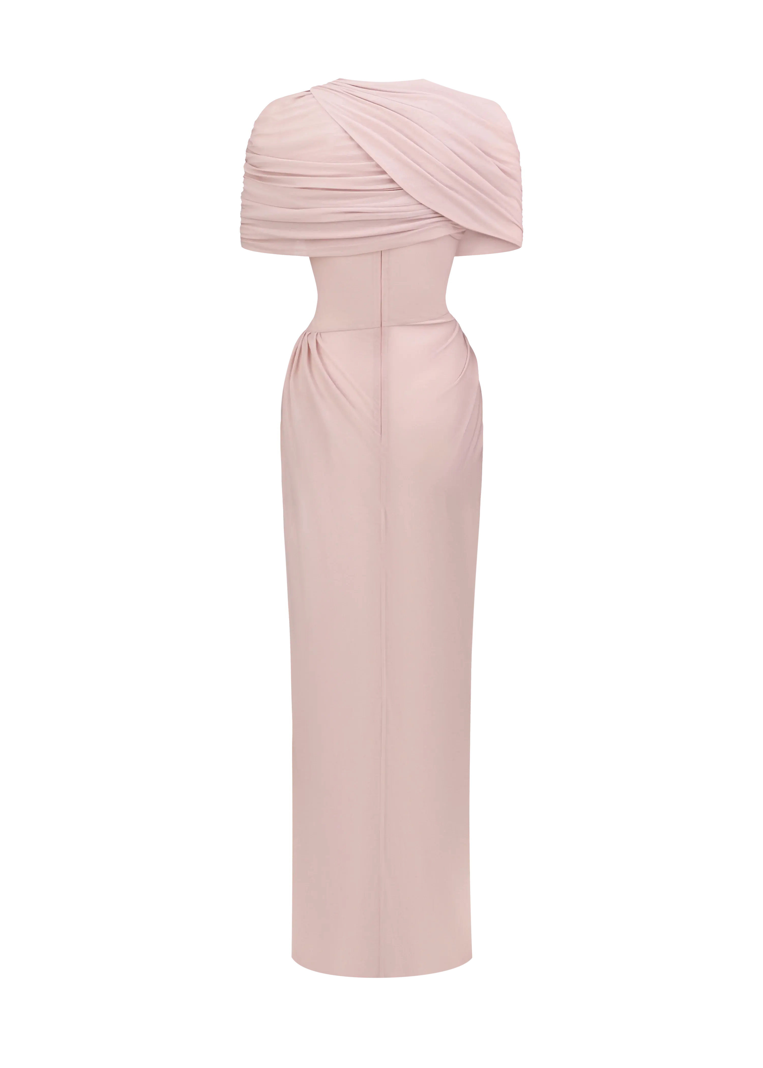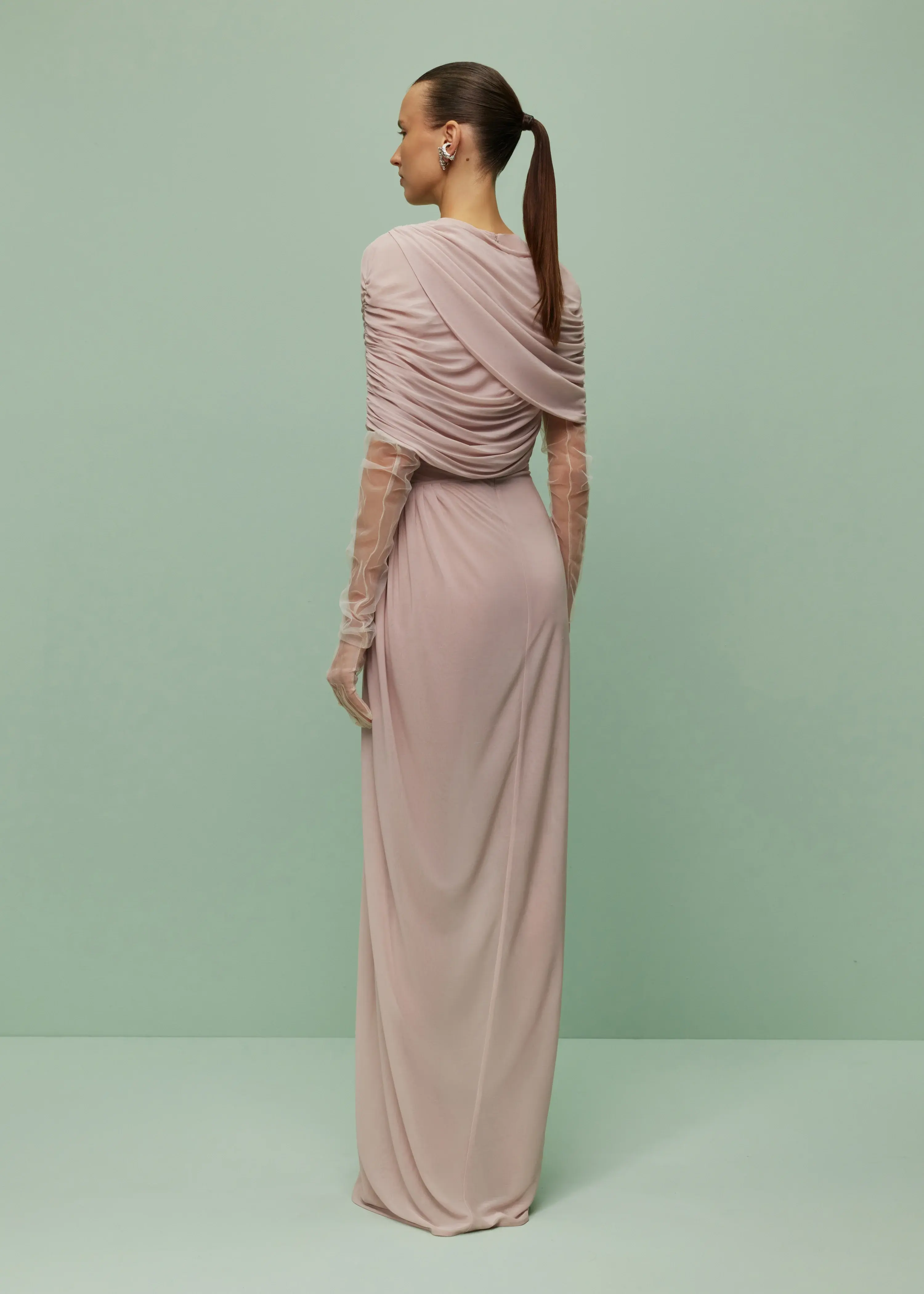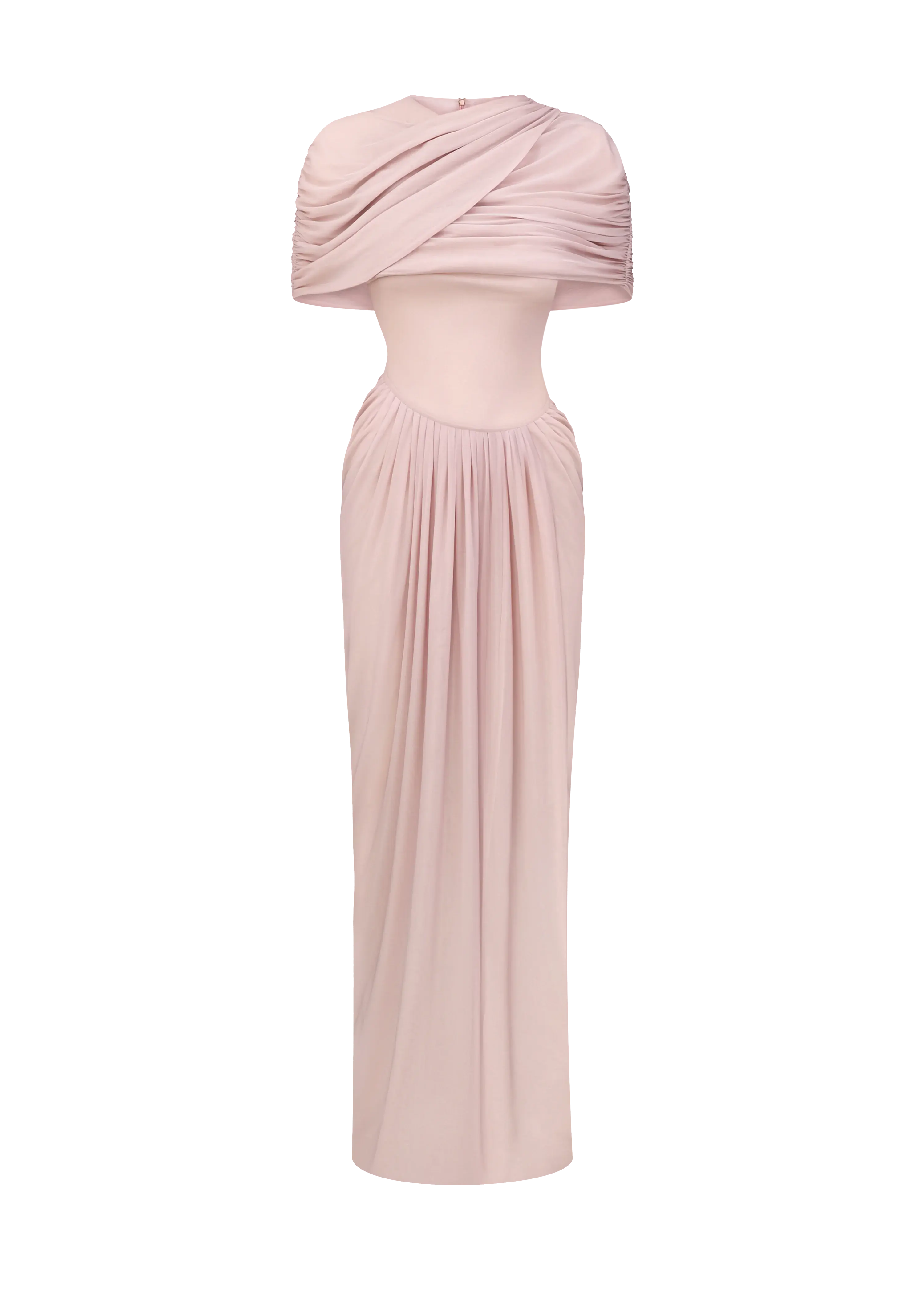 Maxi dress with artful draped skirt designed in dusty pink lightweight sheer fabric. Adorned with draped double shawl detail.