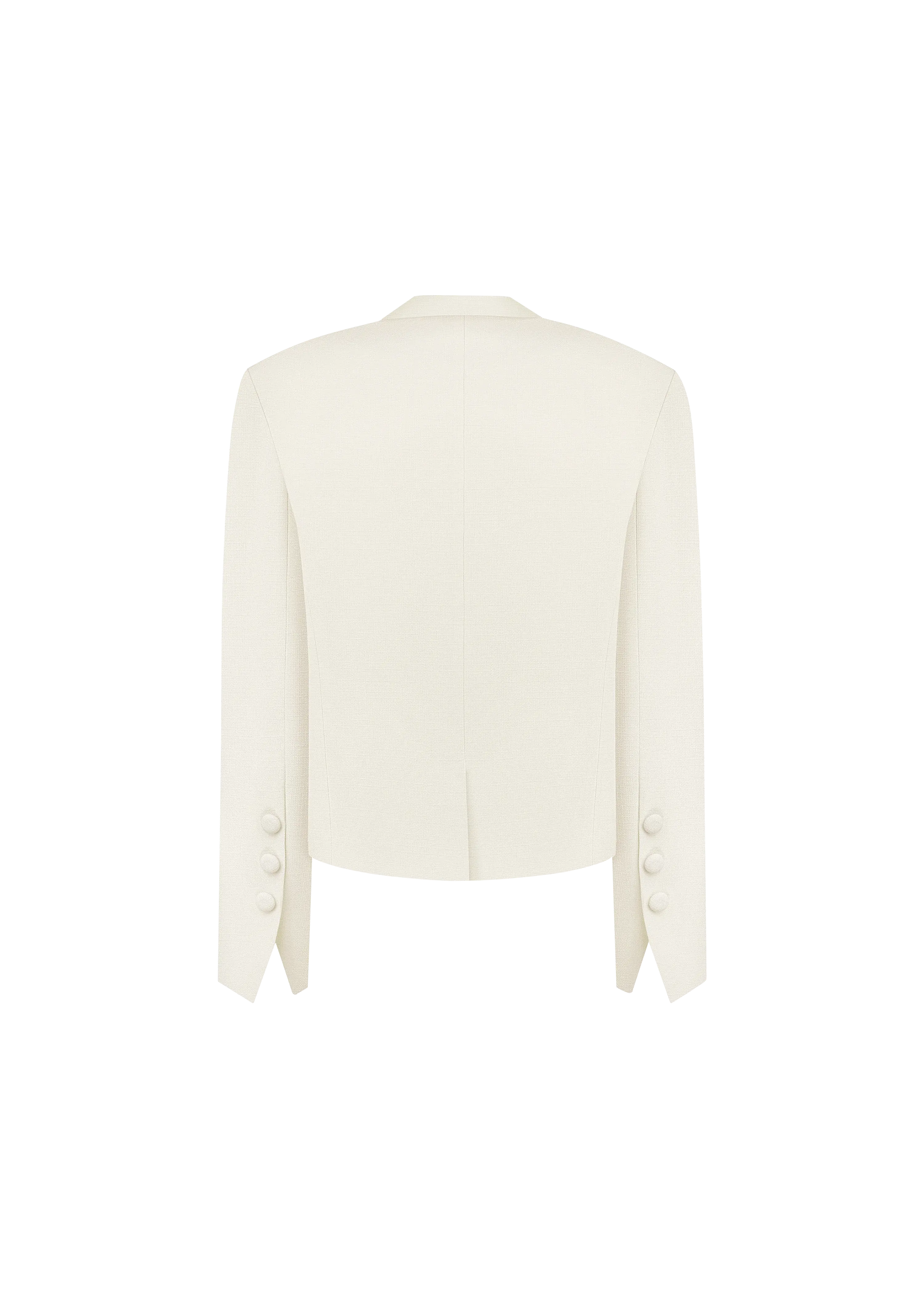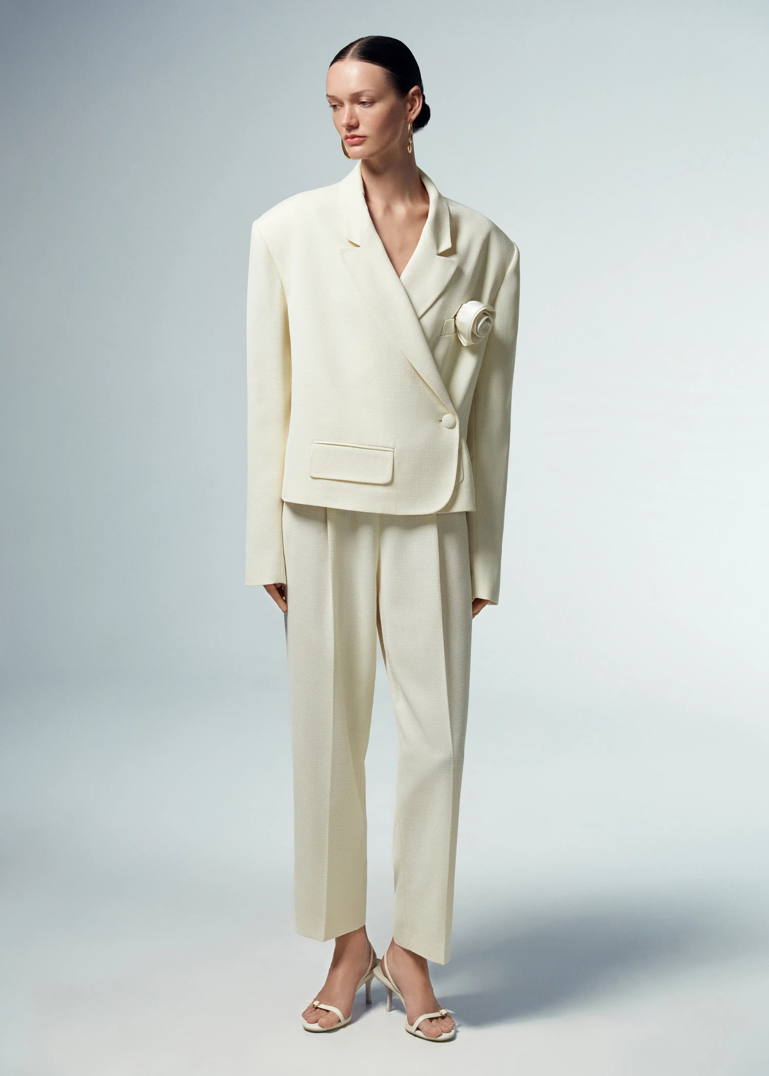 The oversized double-breasted Linda jacket now in a milky shade, perfect for the various occasions. It features a classic straight silhouette with padded shoulders and notched lapels, offering a timeless look. The jacket is adorned with decorative buttons on the cuffs and fastens with a single fabric-covered button and a nacreous snap button inside. Fully lined. Adorned with handcrafted flower brooch.