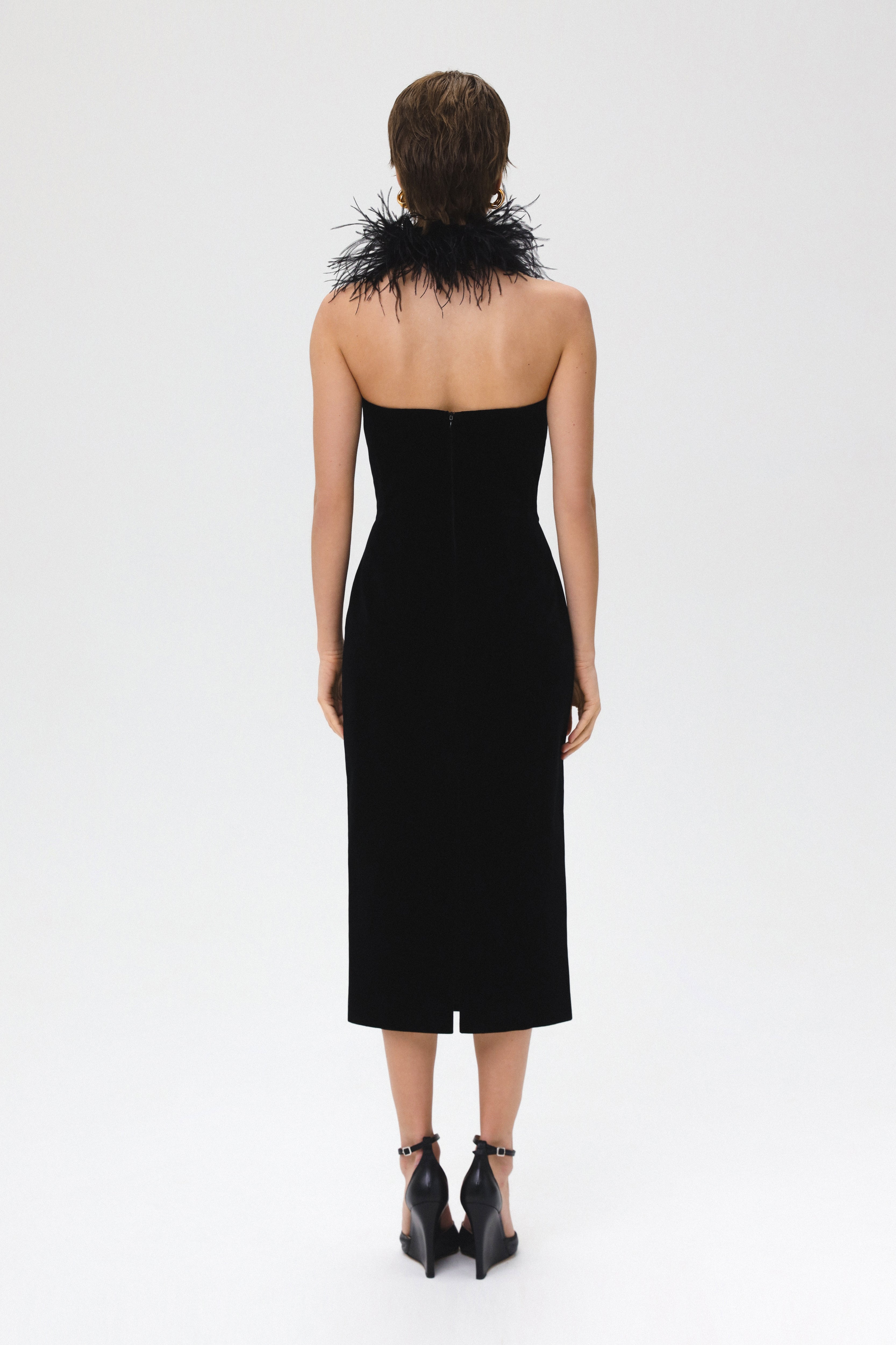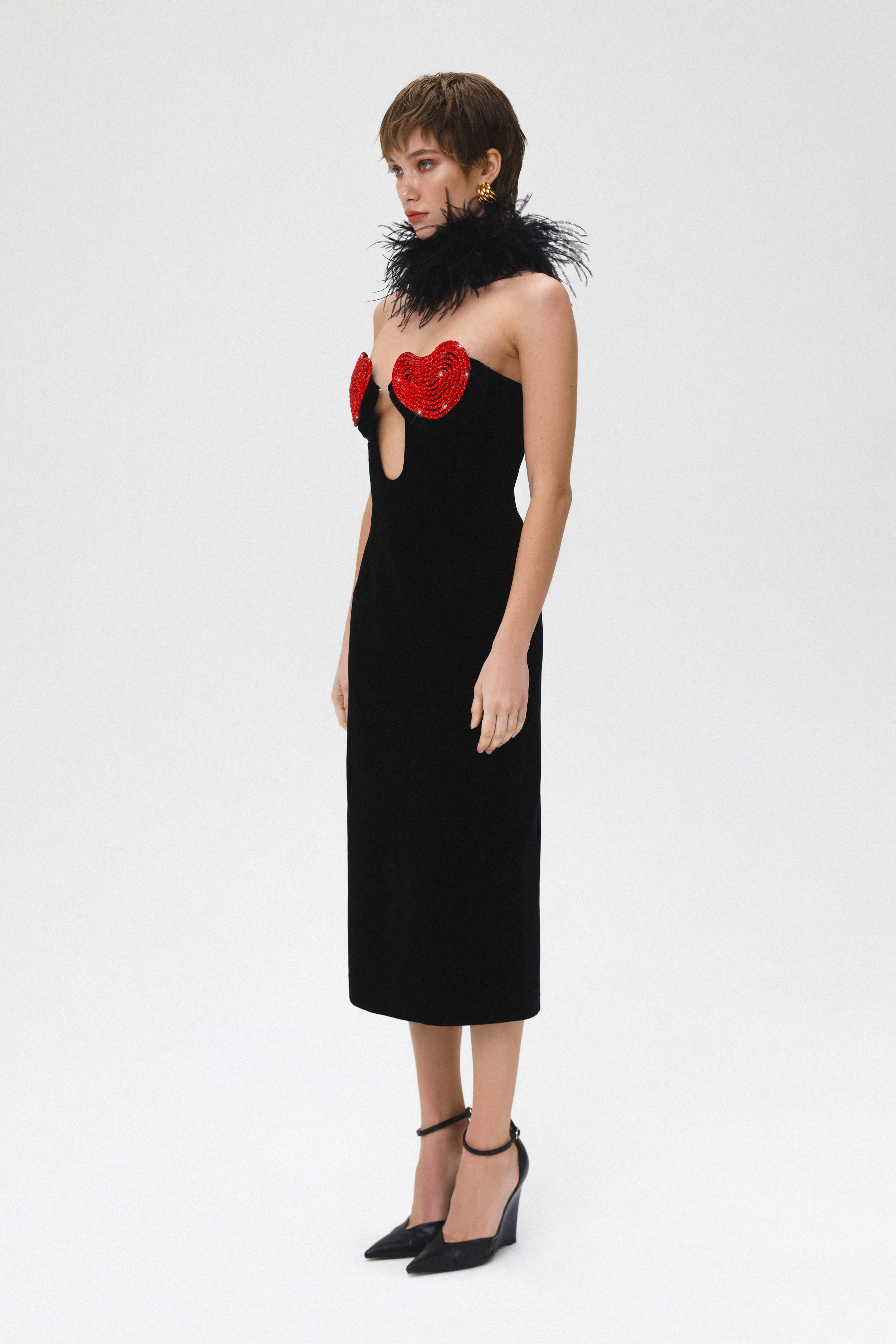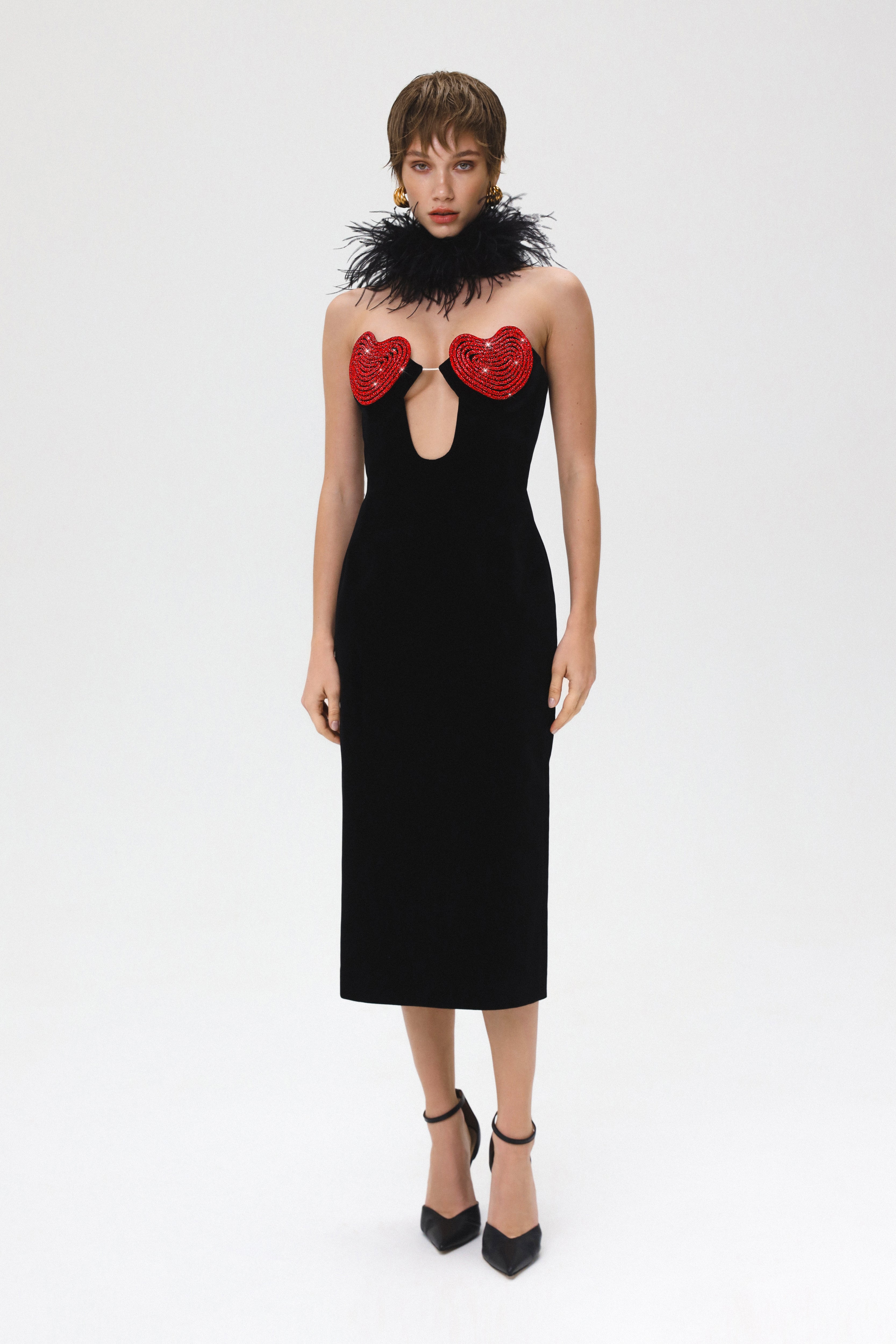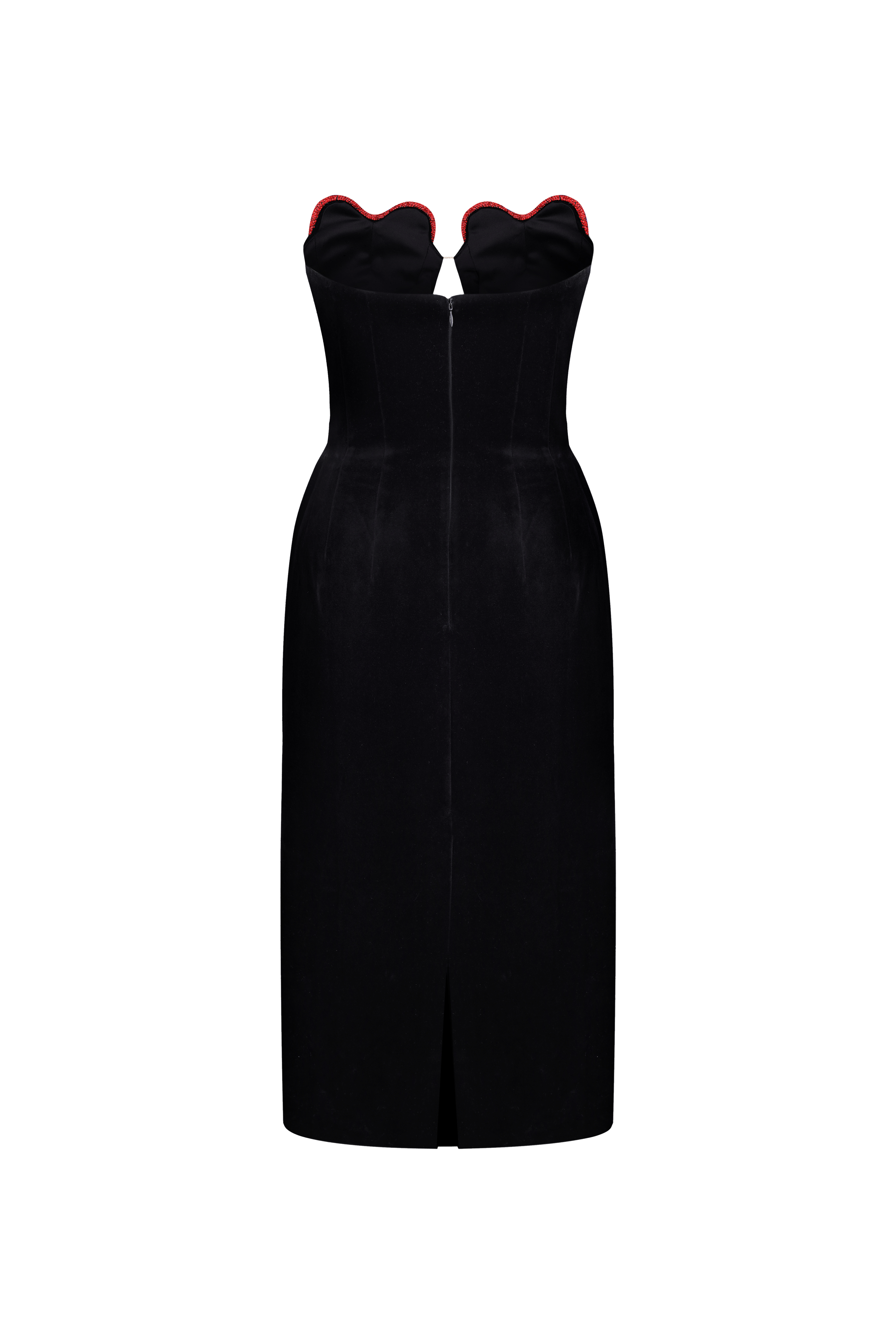 Our Mermaid midi dress now in a luscious black velvet fabric. This strapless midi dress boasts a fitted bustier and inner corset, sculpting a tight-fitting silhouette that elegantly shapes the figure and accentuates feminine curves. The corset showcases a keyhole cutout, while the heart-shaped bustier cups take centre stage. Handcrafted and adorned with red crystal hearts, these cups are connected by a transparent thread, creating a subtle and elegant effect. Fastened with a concealed back zipper and hook-and-eye closure. Fully lined.