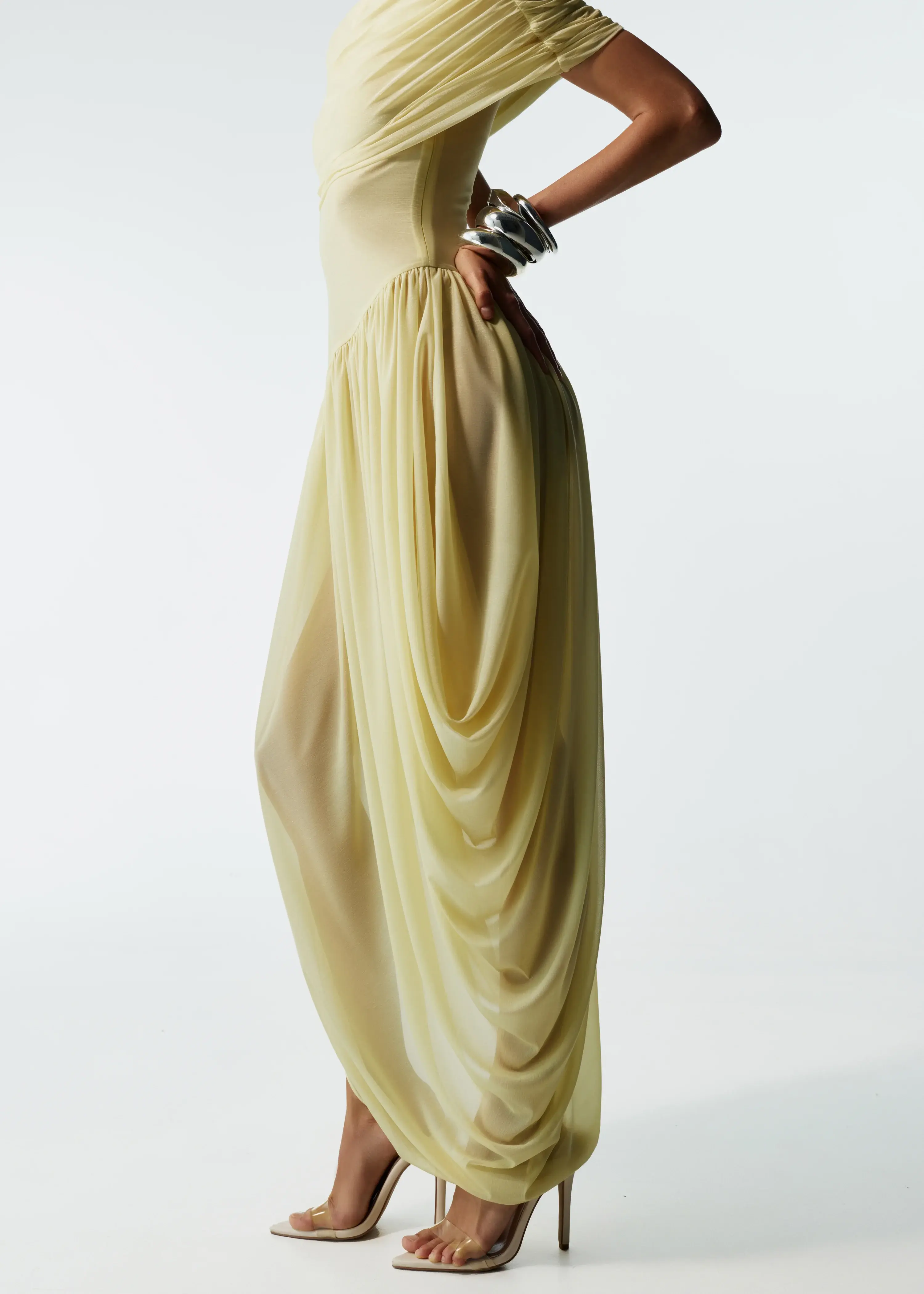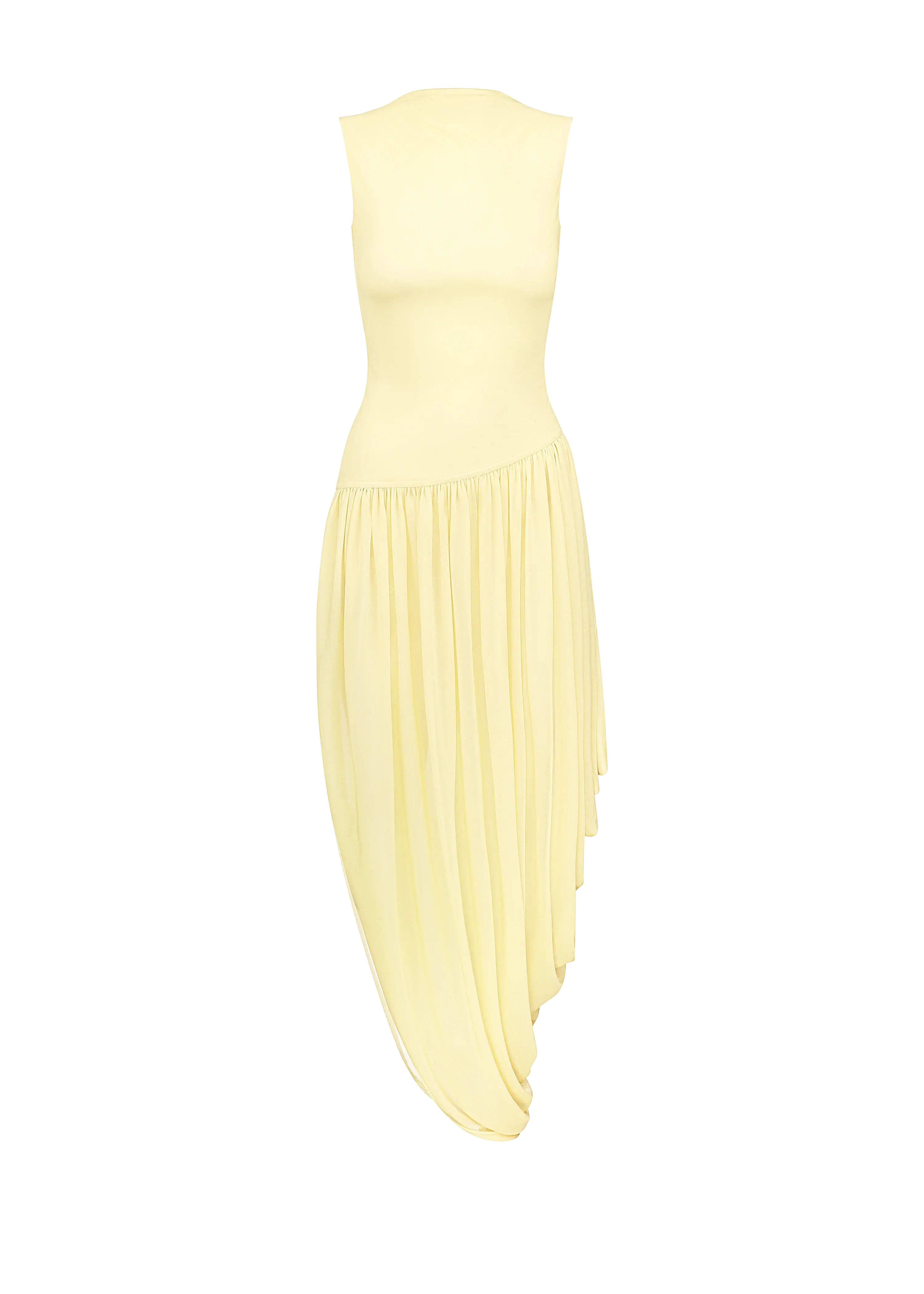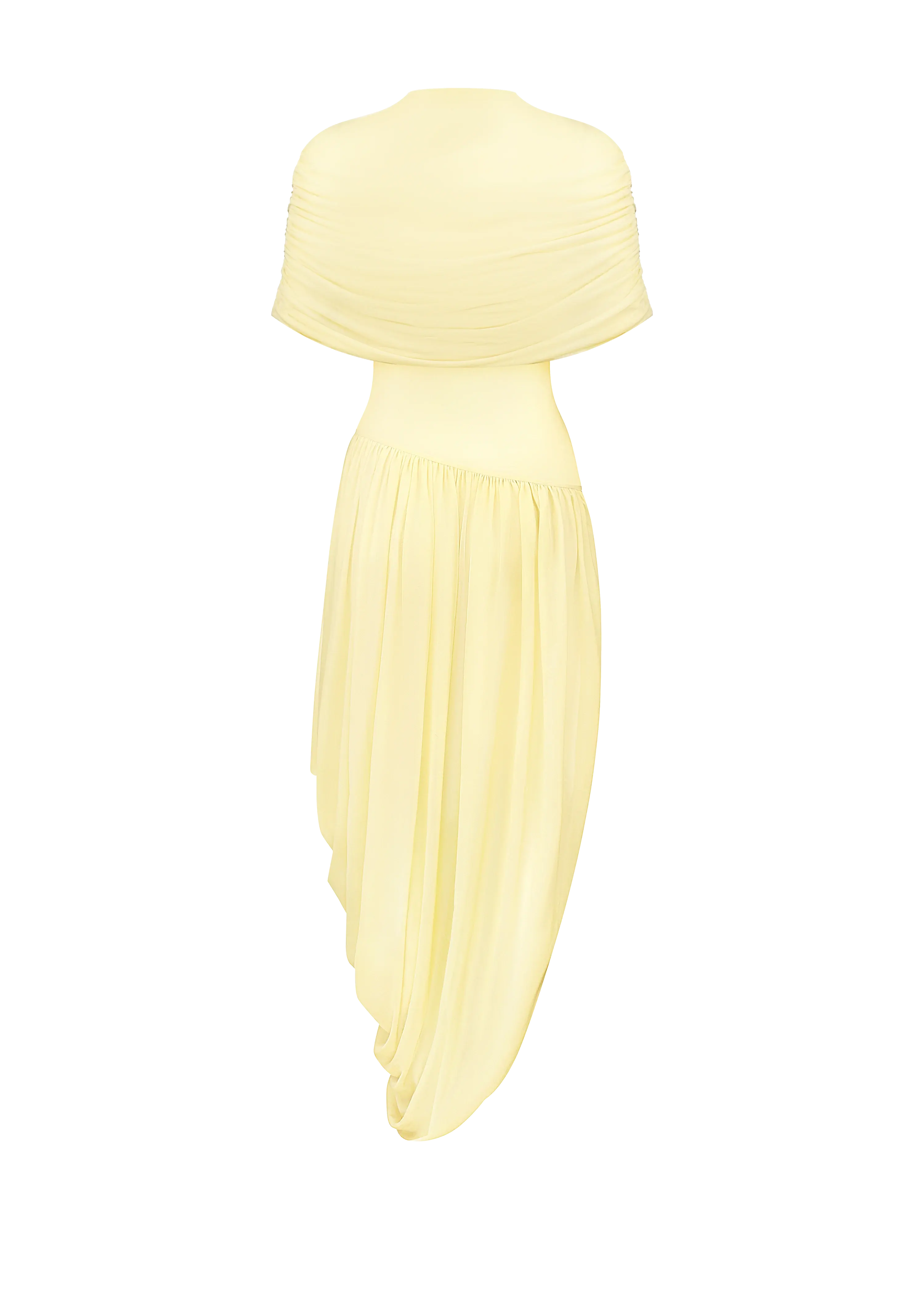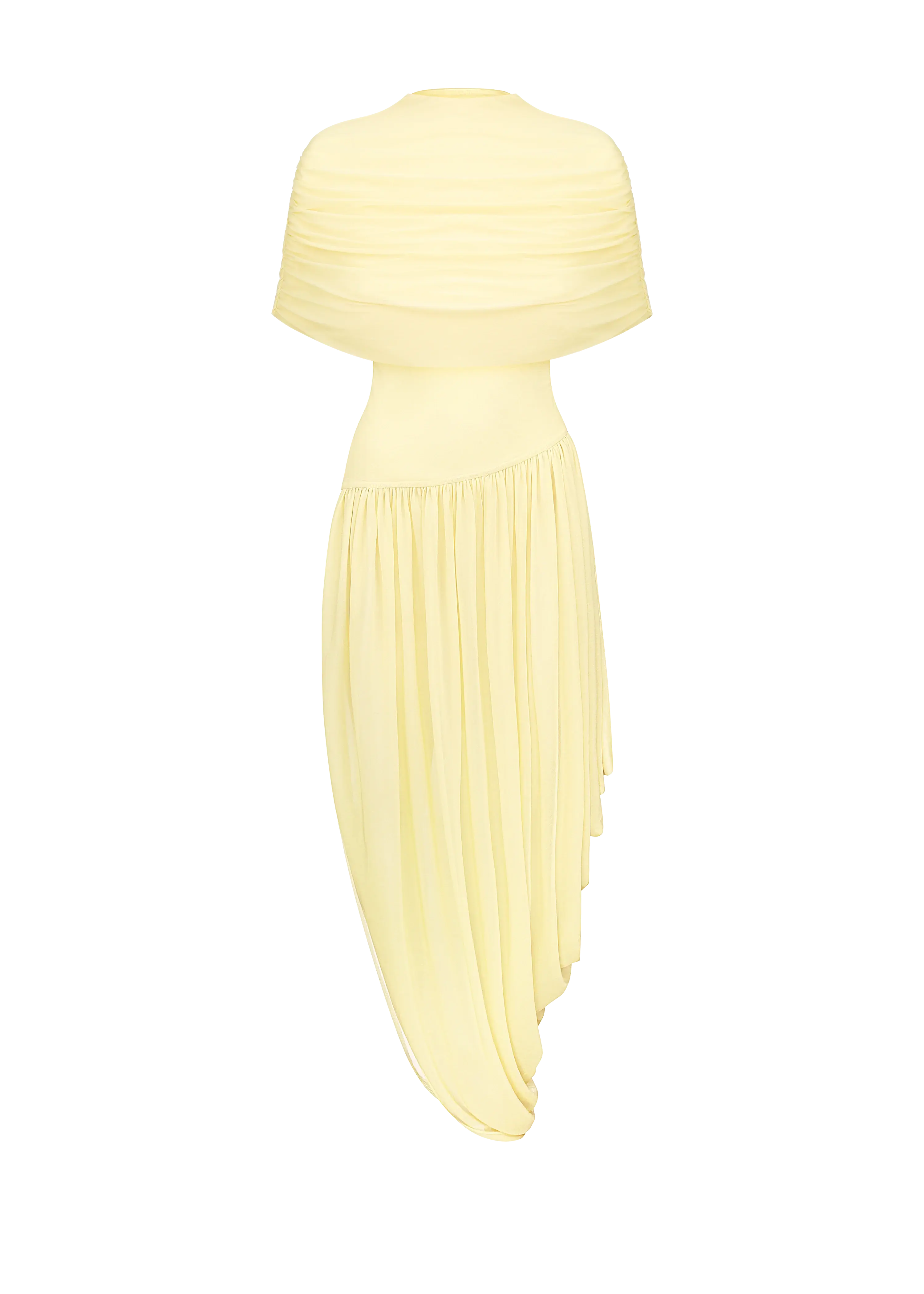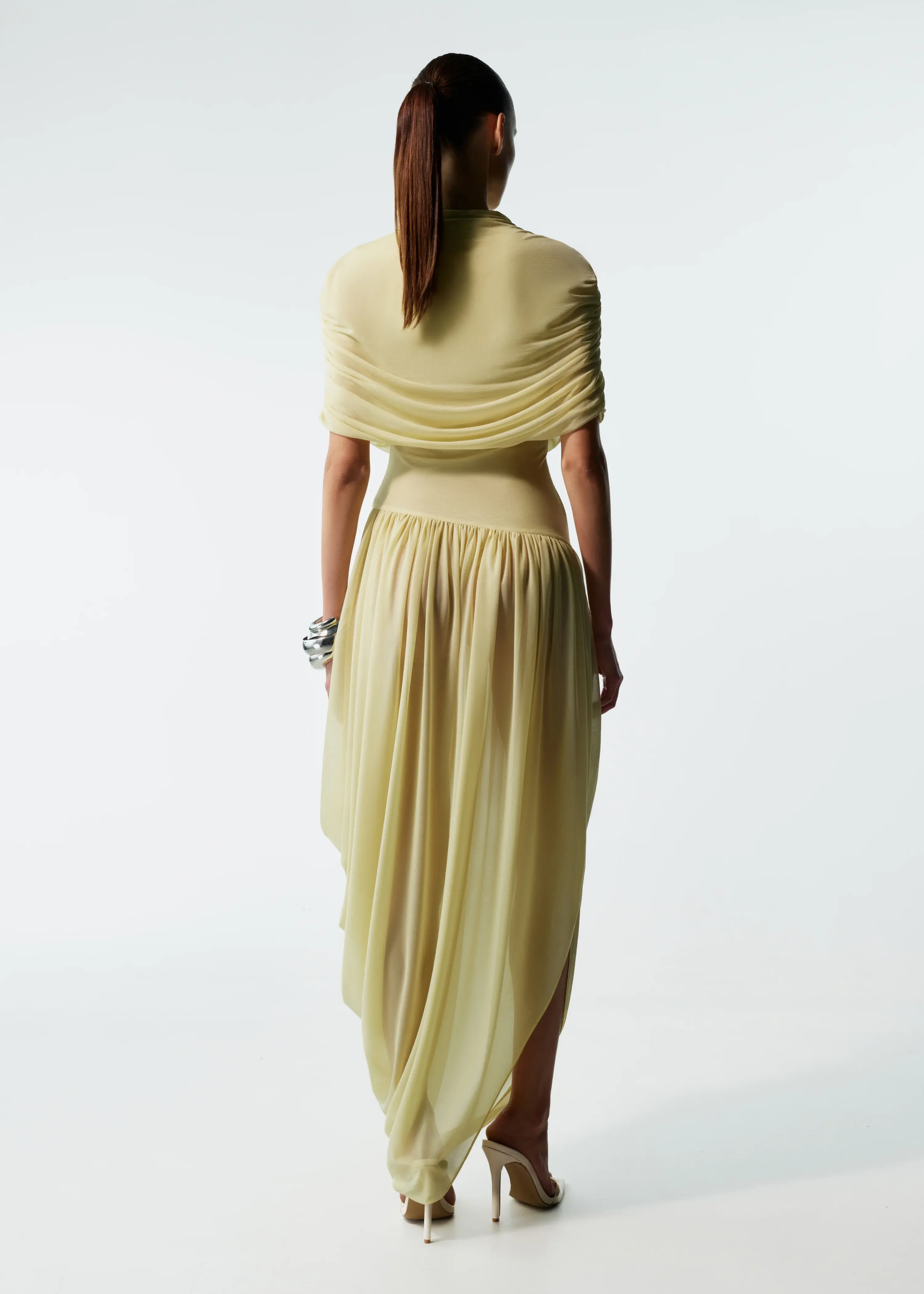 Sleeveless turtleneck dress with detachable draped shawl in lemon hue. It's asymmetric silhouette is accentuated by artful ruching, while a daring slit adds a touch of allure.