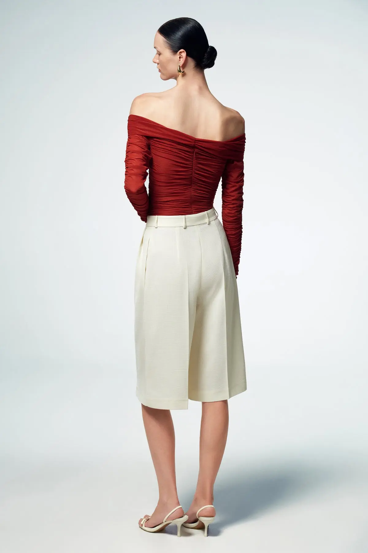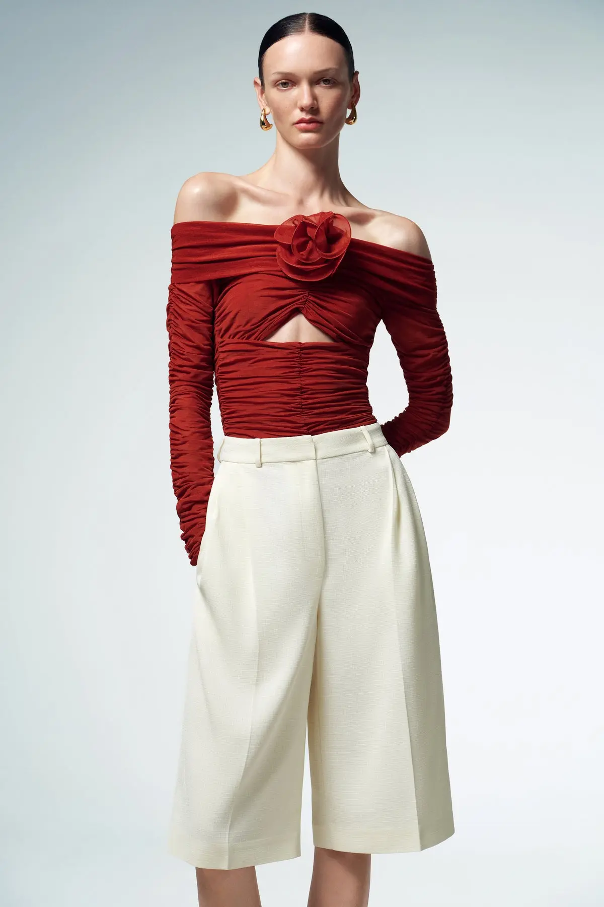 Long-sleeve off-the-shoulder ruched bodysuit in a rich maroon hue, crafted to blend elegance and a bold, modern edge. Featuring three handcrafted 3D flowers that highlight the neckline and cutout details, this bodysuit offers a unique, artistic touch. The ruched fabric gracefully contours the body, accentuating your shape, while the off-shoulder design brings a hint of sultry sophistication. Fastened with a concealed back zipper.