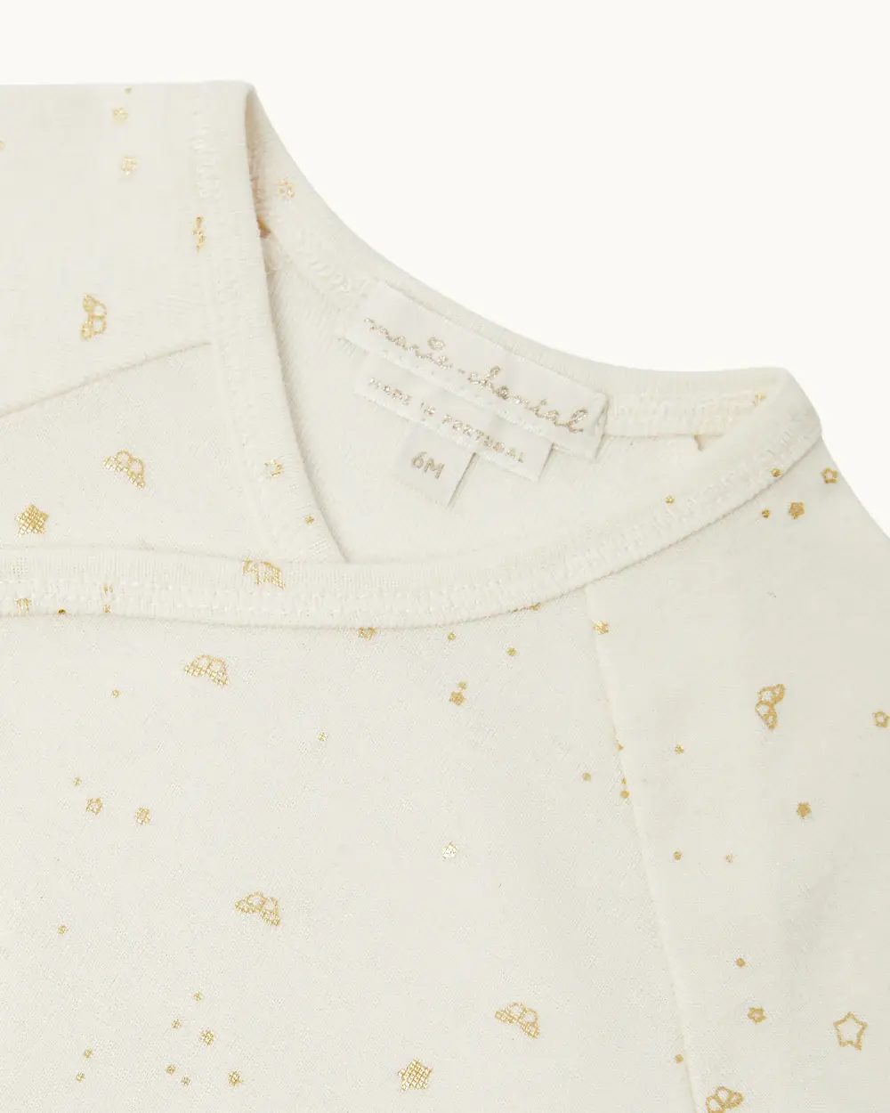 A gentle essential for day or night, the Bellamy Onesie for baby is made from undyed ribbed cotton and finished with our signature Star & Crown print in shimmering gold.