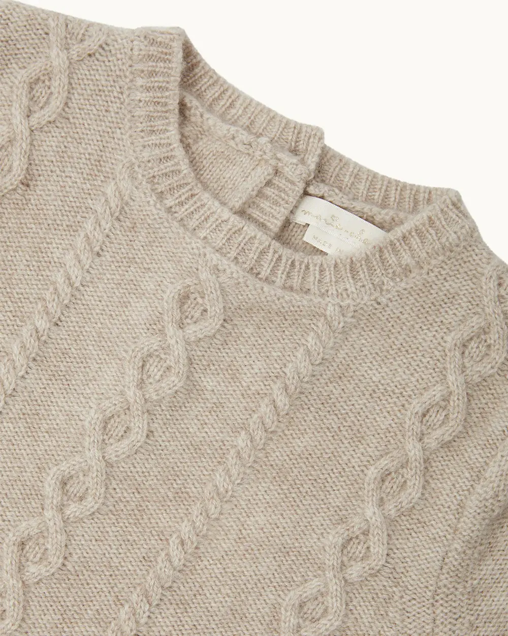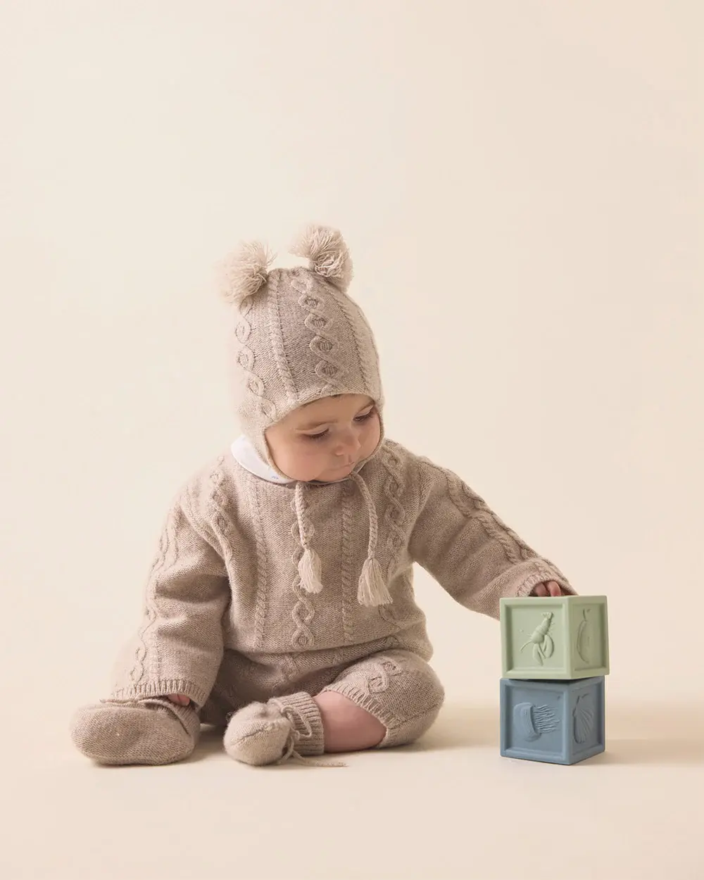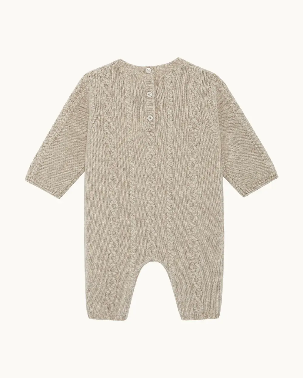 Classic and cosy, the Bowie Romper in oat brown features intricate cable knitting, and button closures at the back and gusset for easy dressing. Pair with the matching hat and booties for a perfect cold-weather look.