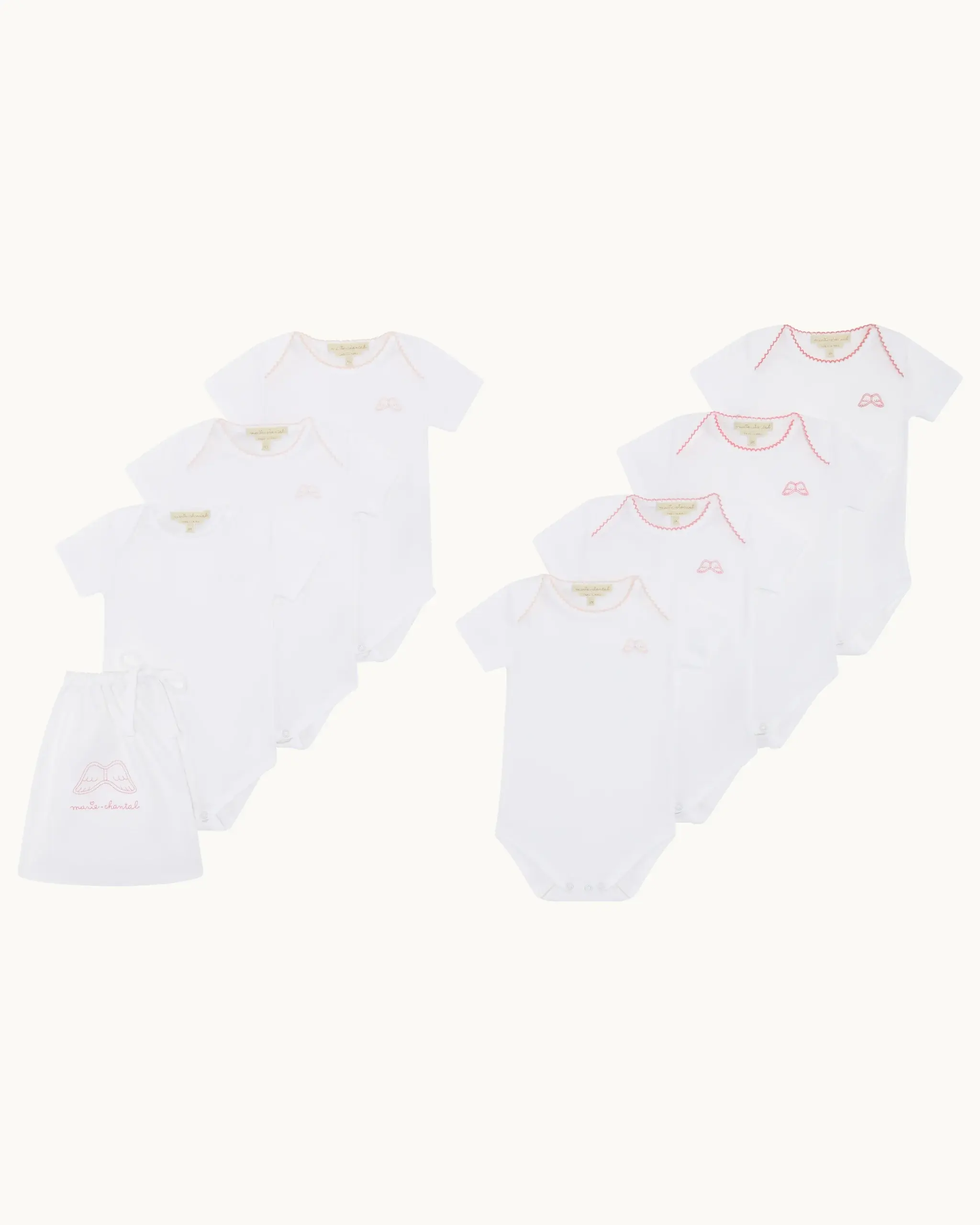 Made from the softest Pima Cotton, Marie-Chantal’s set of 7 short sleeve picot onesies comes in 7 shades of pink, one for each day of the week, and features our signature embroidered Angel Wing design with matching picot trim – perfect for layering.