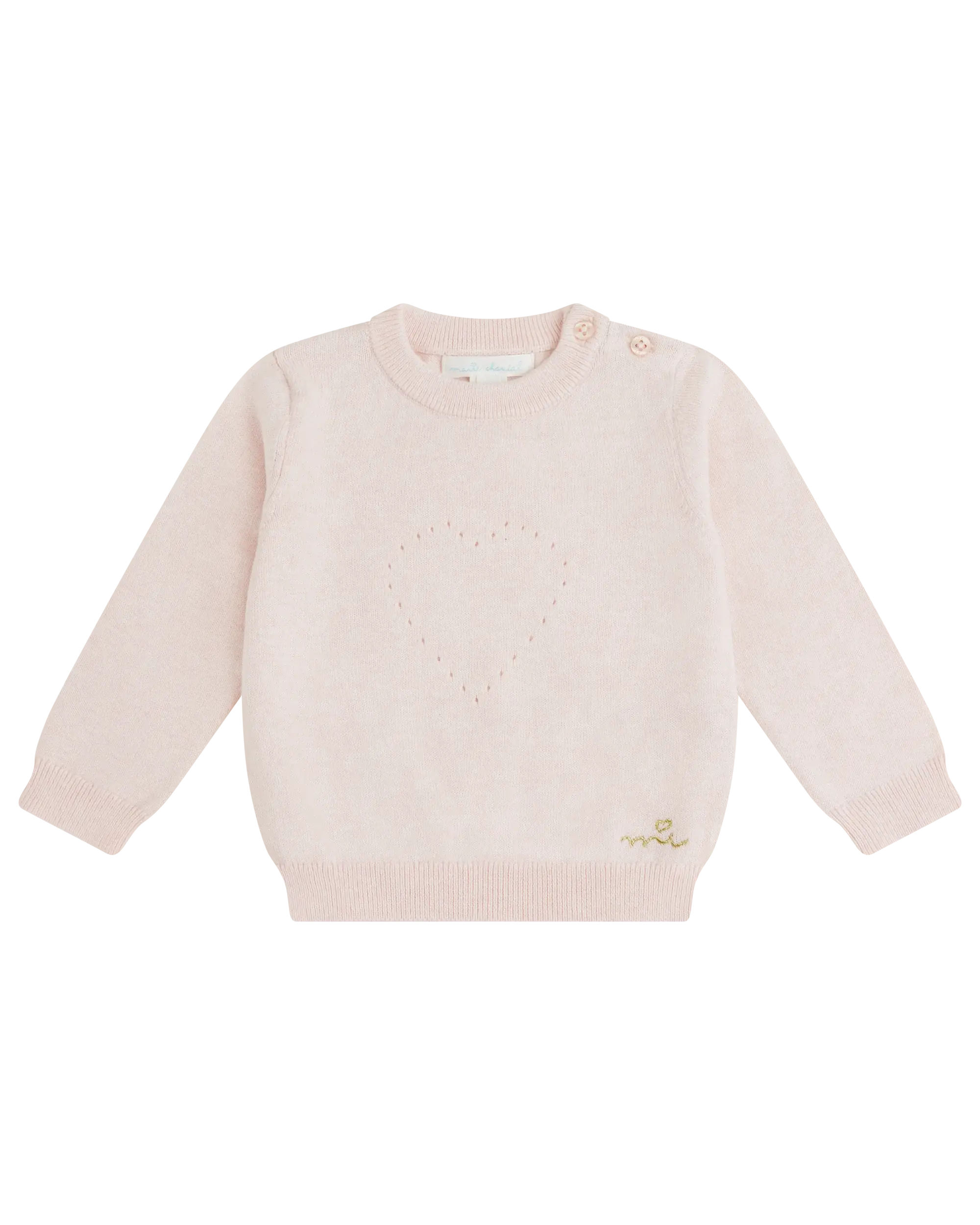 The sweater also fastens at the shoulder with 2 signature MC buttons for easy dressing.