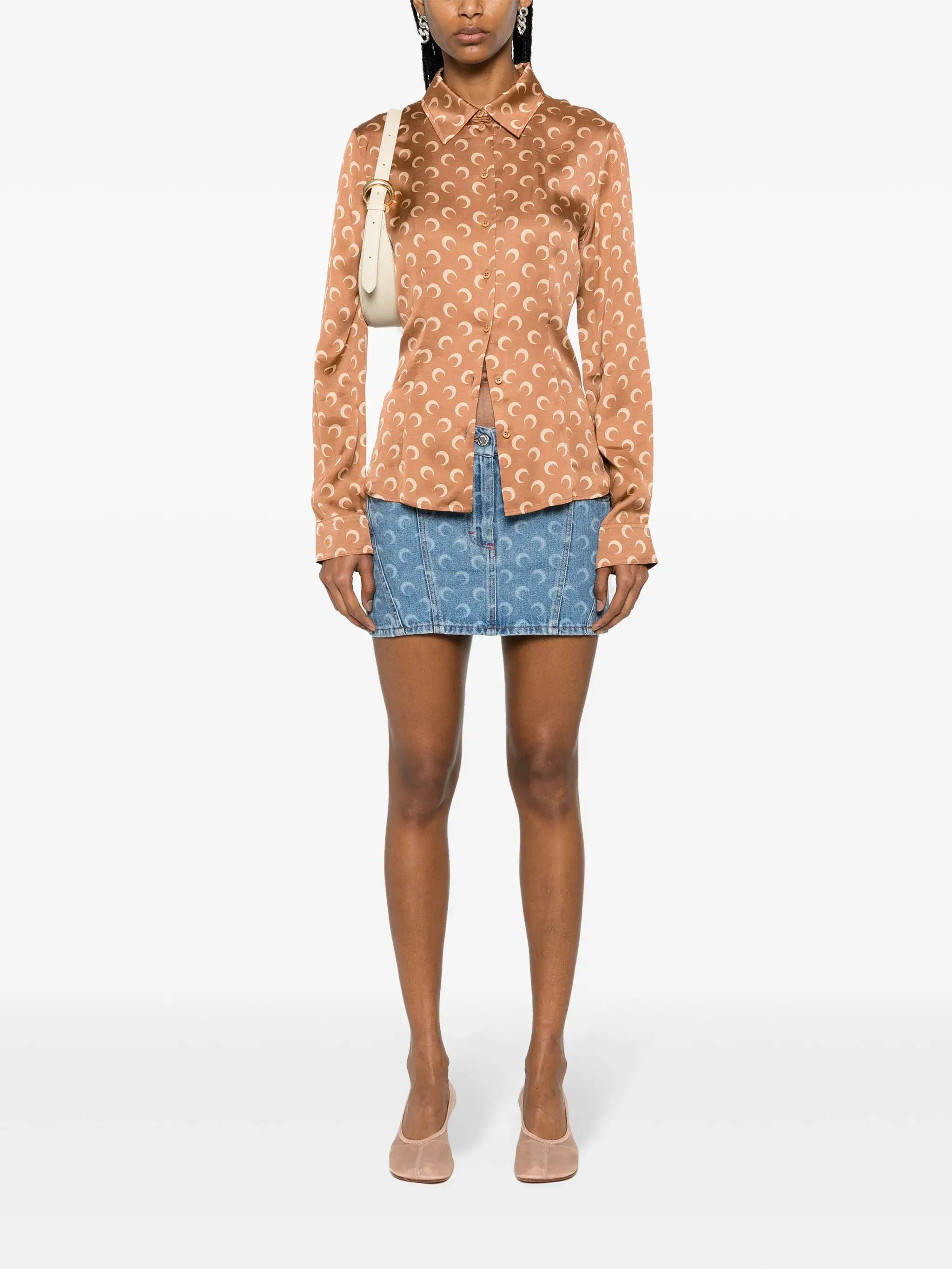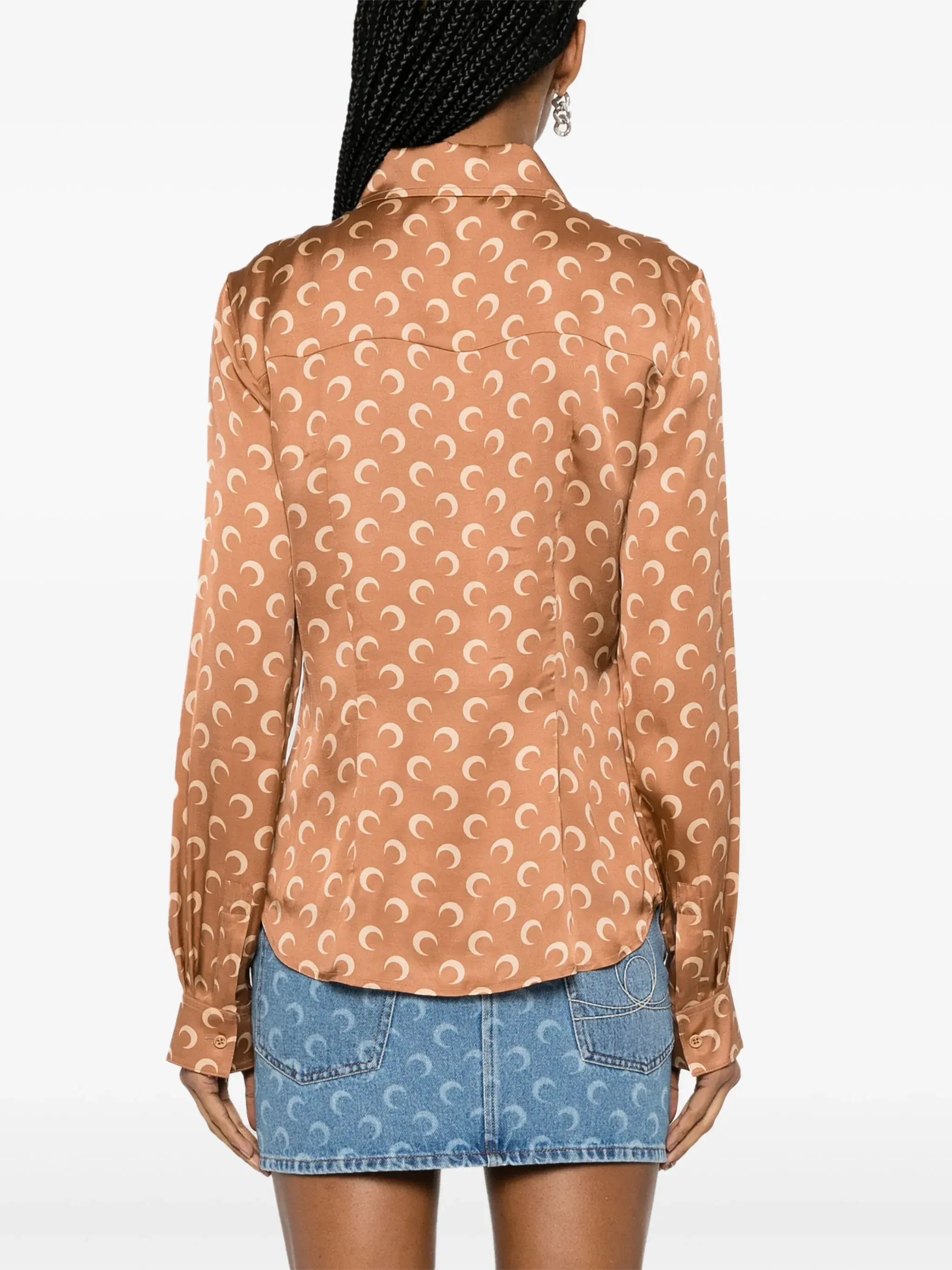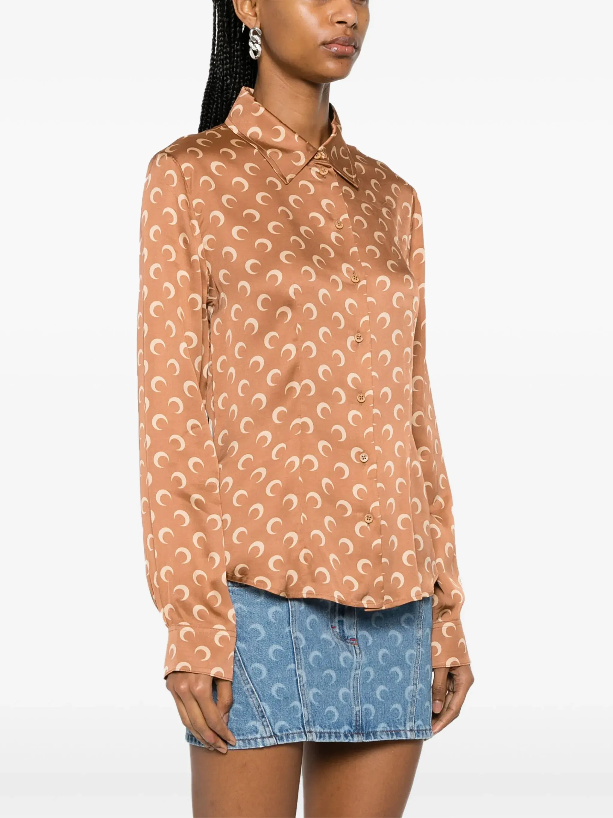 camel brown satin finish crescent moon print spread collar long sleeves buttoned cuffs curved hem front button fastening