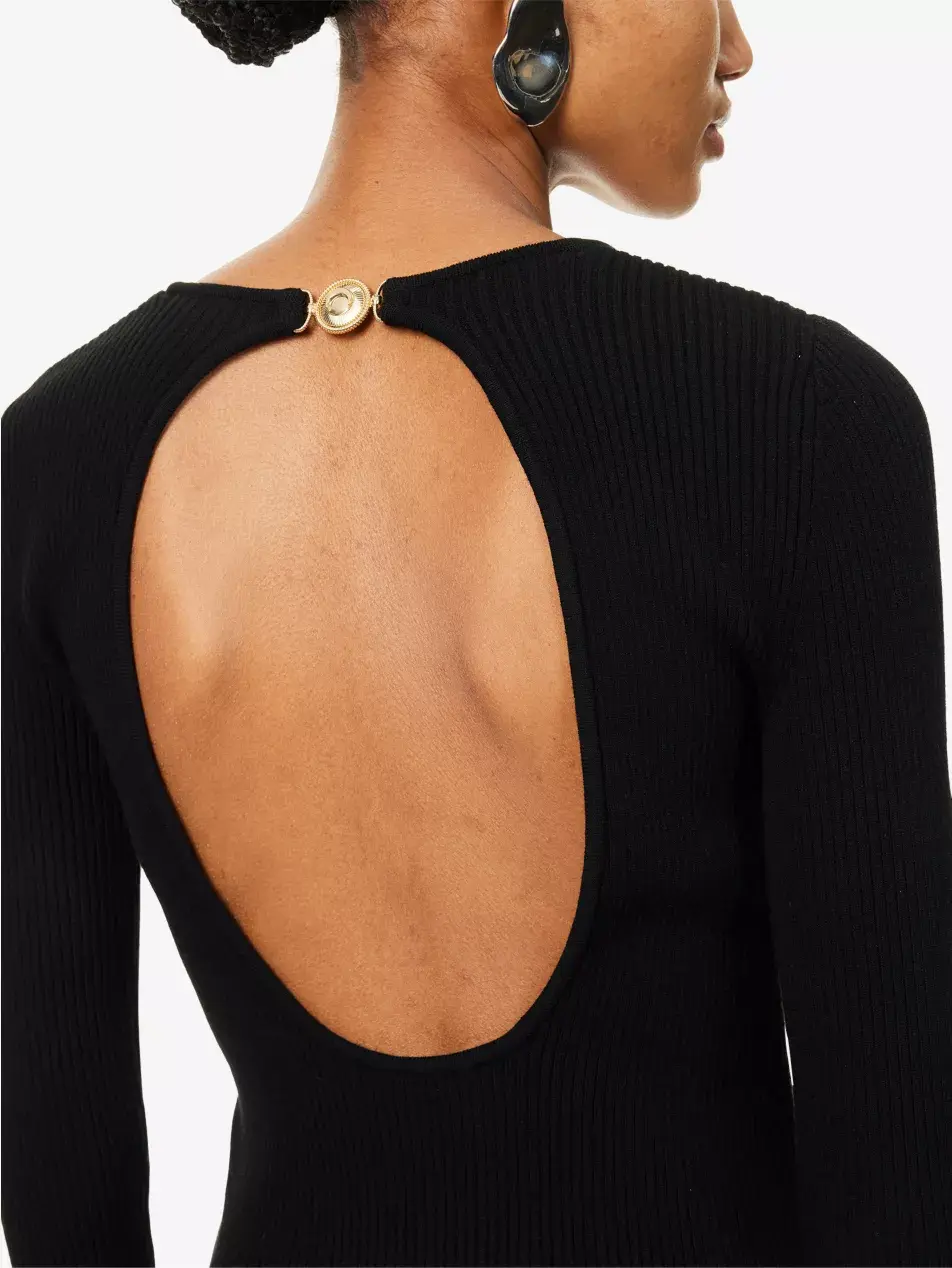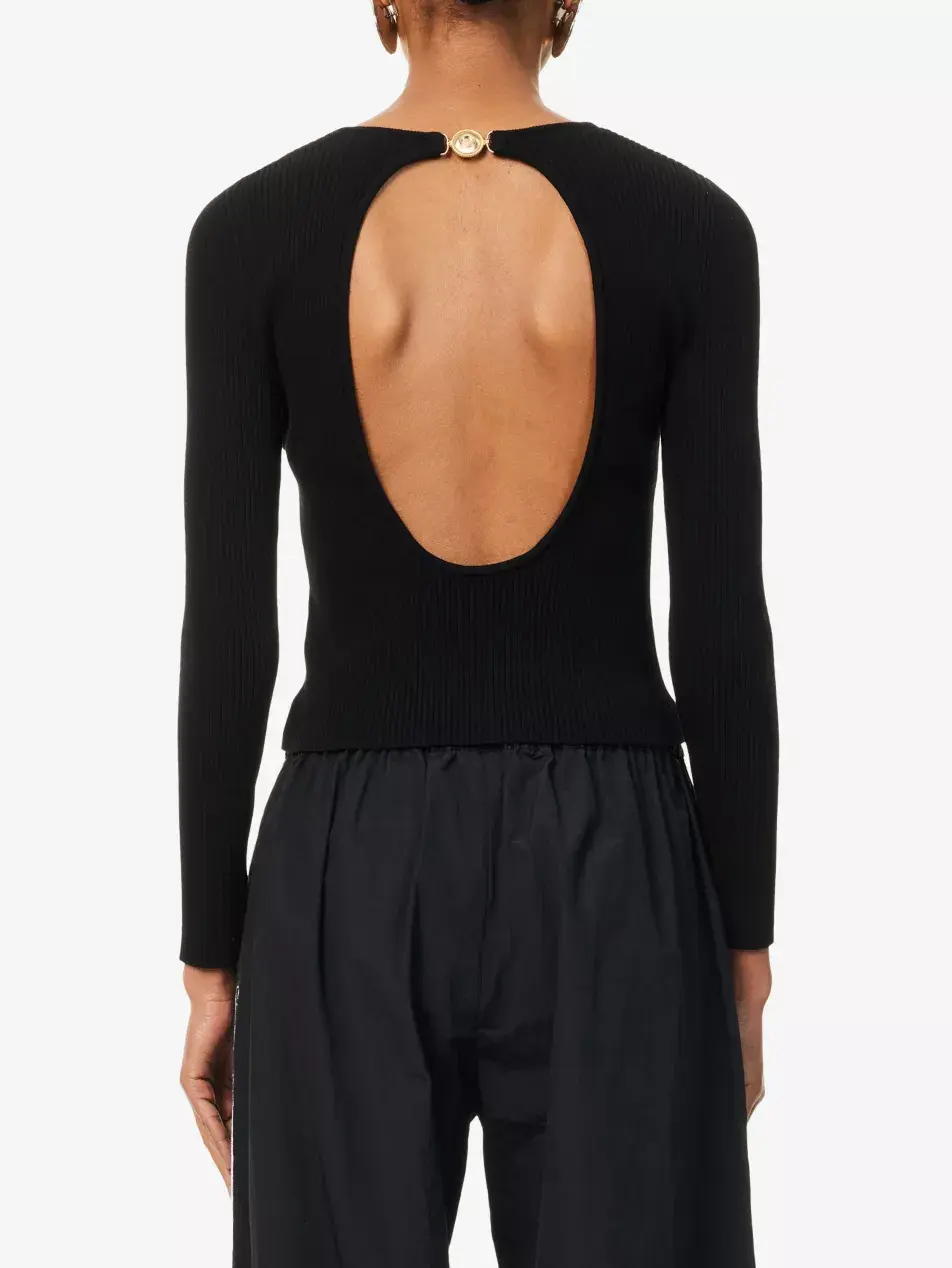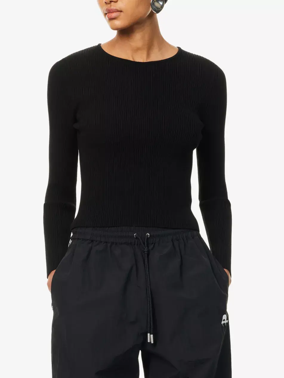 Slim fit, round-neck, long sleeves, cut-out and engraved branding at back, all-over knitted and ribbed