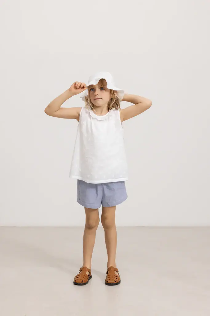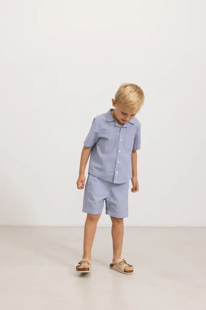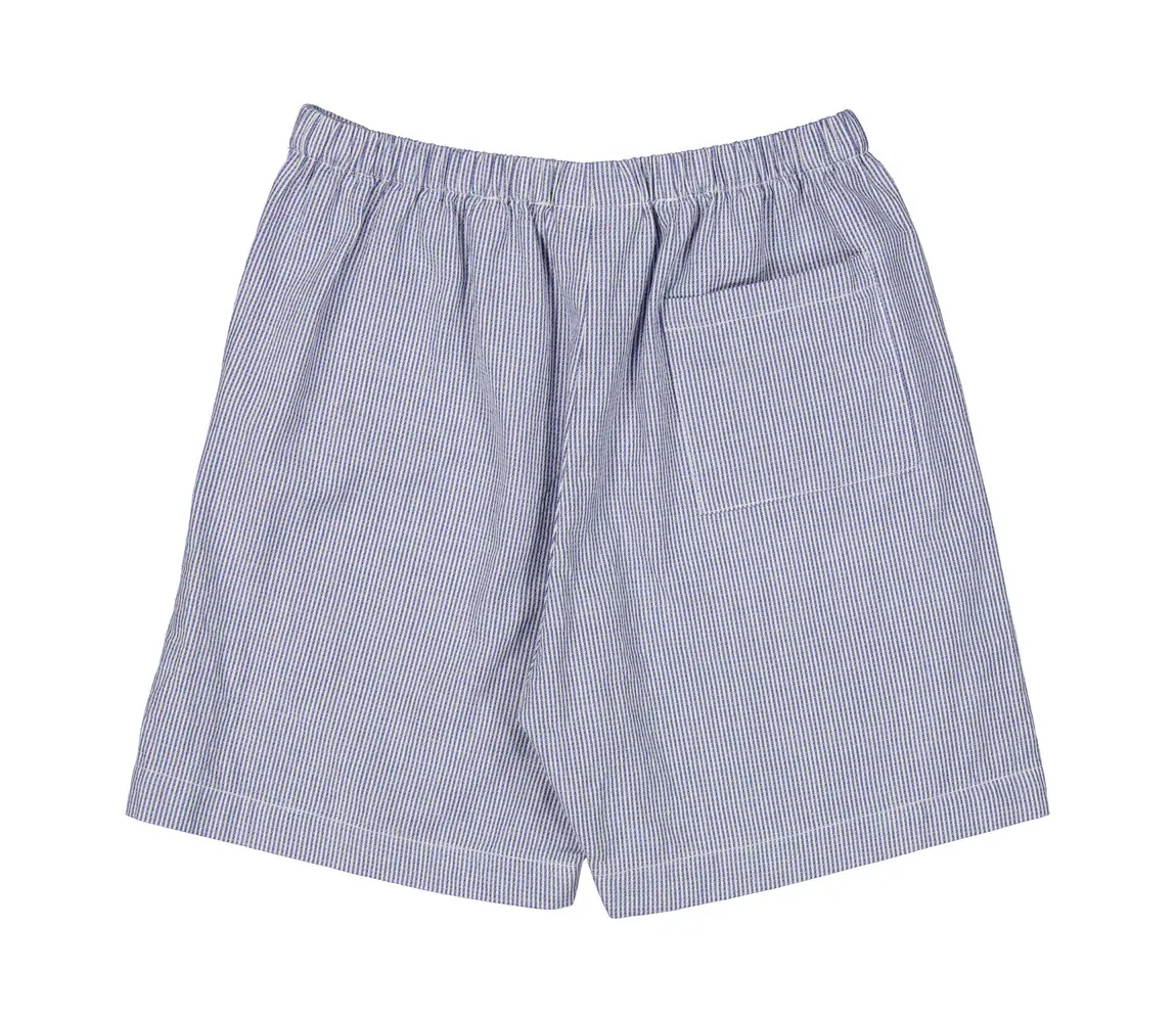 Summer shorts with woven stripes, side pockets, elastic waist and a decorative ribbon. The shorts are made of a soft and light cotton quality