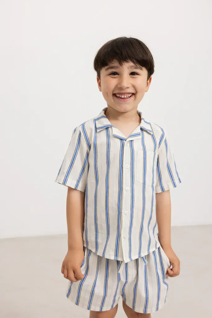 Short-sleeved shirt with fine stripes, collar, button closure and a small pocket on the front. The shirt is made of a light and soft cotton quality.